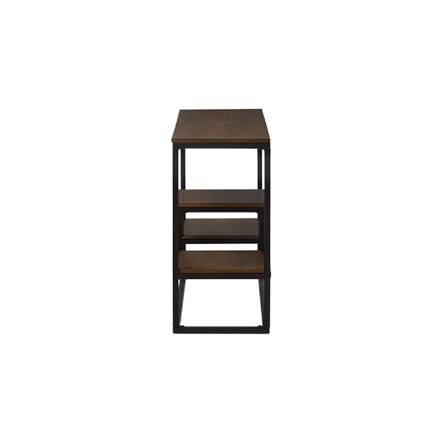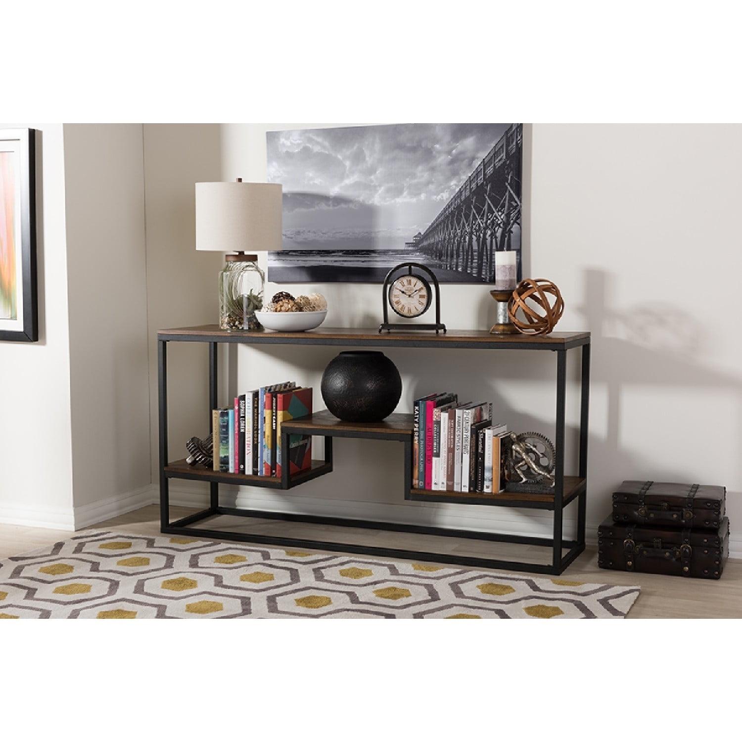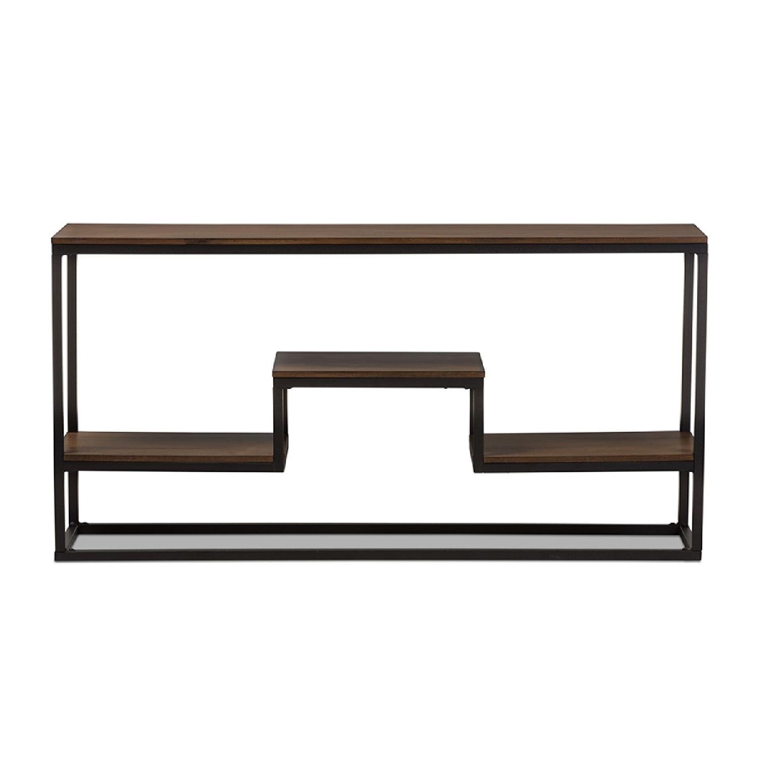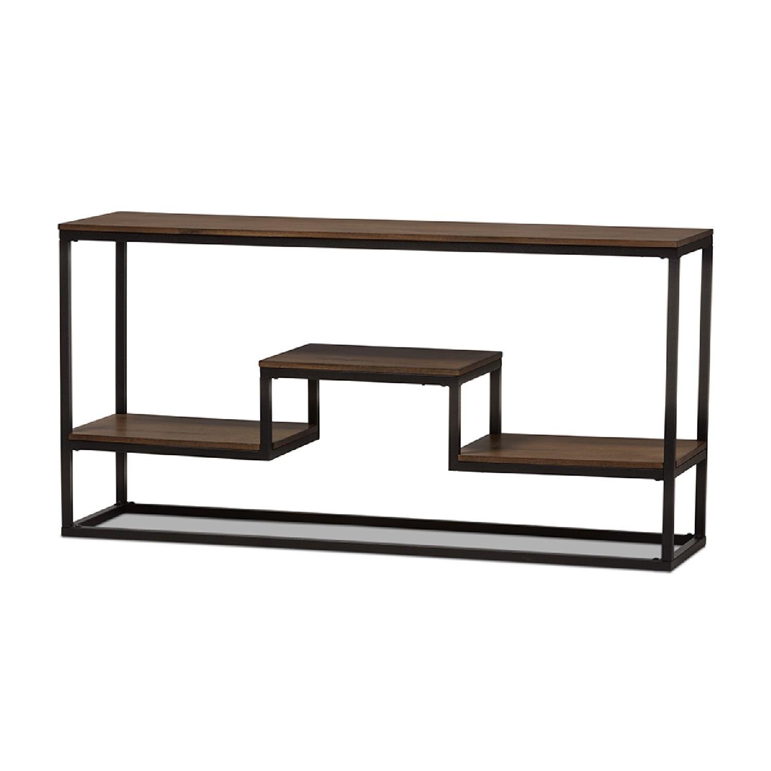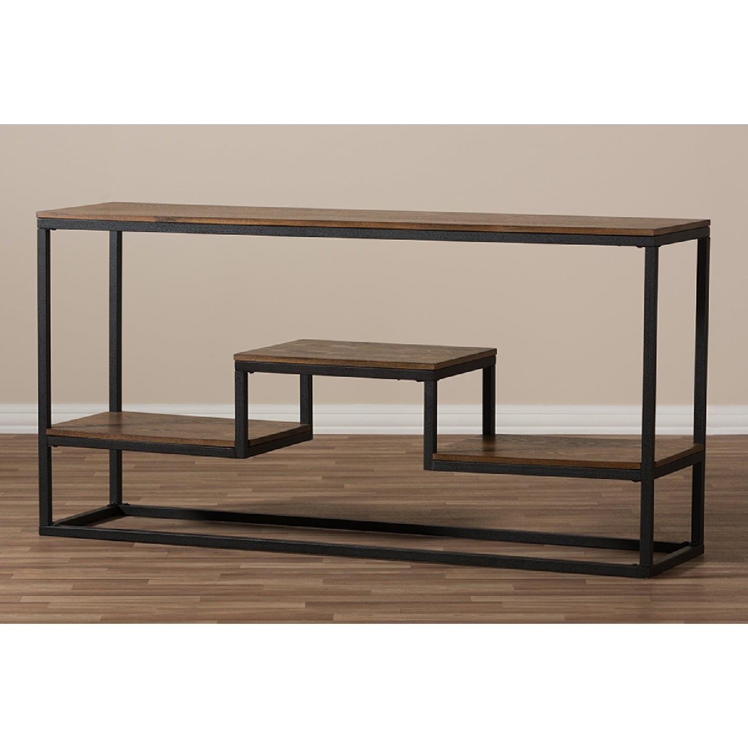Baxton Studio Doreen Rustic Industrial Style Antique Black Textured Finished Metal Distressed Wood Console Table Featuring weathered oak in an aged and rustic charm, the Doreens Industrial look and angular shelf makes it a console with character. Constructed of tubular metal and finished in black textured finished, the Doreen will add some rustic charm to your home. Mixing distressed wood and metal, this aesthetic is both edgy and stylish. Featuring three fixed shelves, the Doreen is perfect for entryway to hold everyday belongings and cut the clutter in your home. Made in China, the Doreen console table requires assembly.