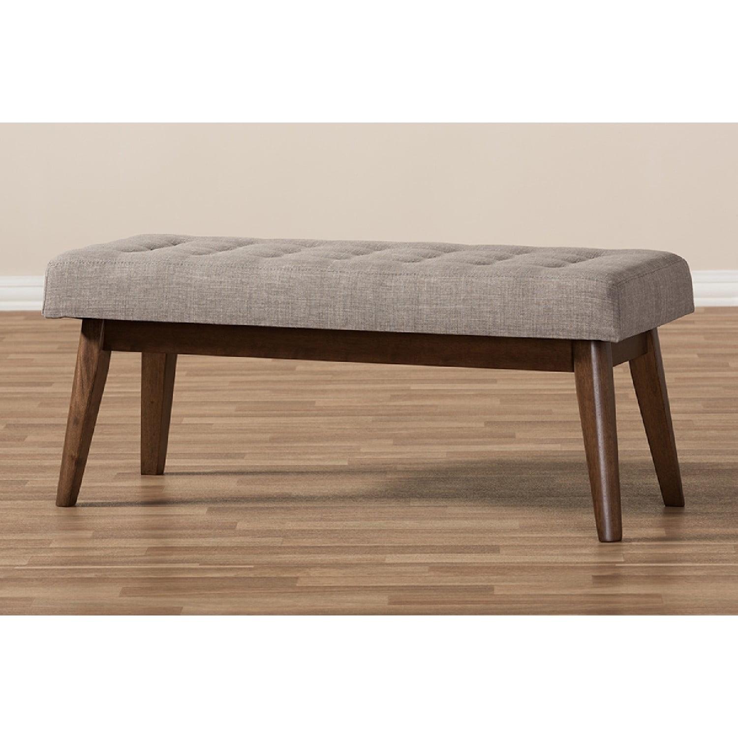 Baxton Studio Elia Mid-Century Modern Walnut Wood Light Grey Fabric Button-Tufted Bench Channel classic good looks in your aesthetic with the handsome walnut wood and fabric of the Elia button-tufted bench. Constructed of solid rubberwood frame, this padded bench is upholstered in light grey polyester fabric for a resilient surface with luxurious comfort and lasting good looks. Design is ideal for your living area or entrance as well as waiting rooms and offices. Dark walnut tone on the frame complements the cool light grey upholstery for a demure, mid-century modern-inspired palette in your space. Button-tufting design instils an on-trend sought after look in your living space. Made in Malaysia, the Elia requires assembly.