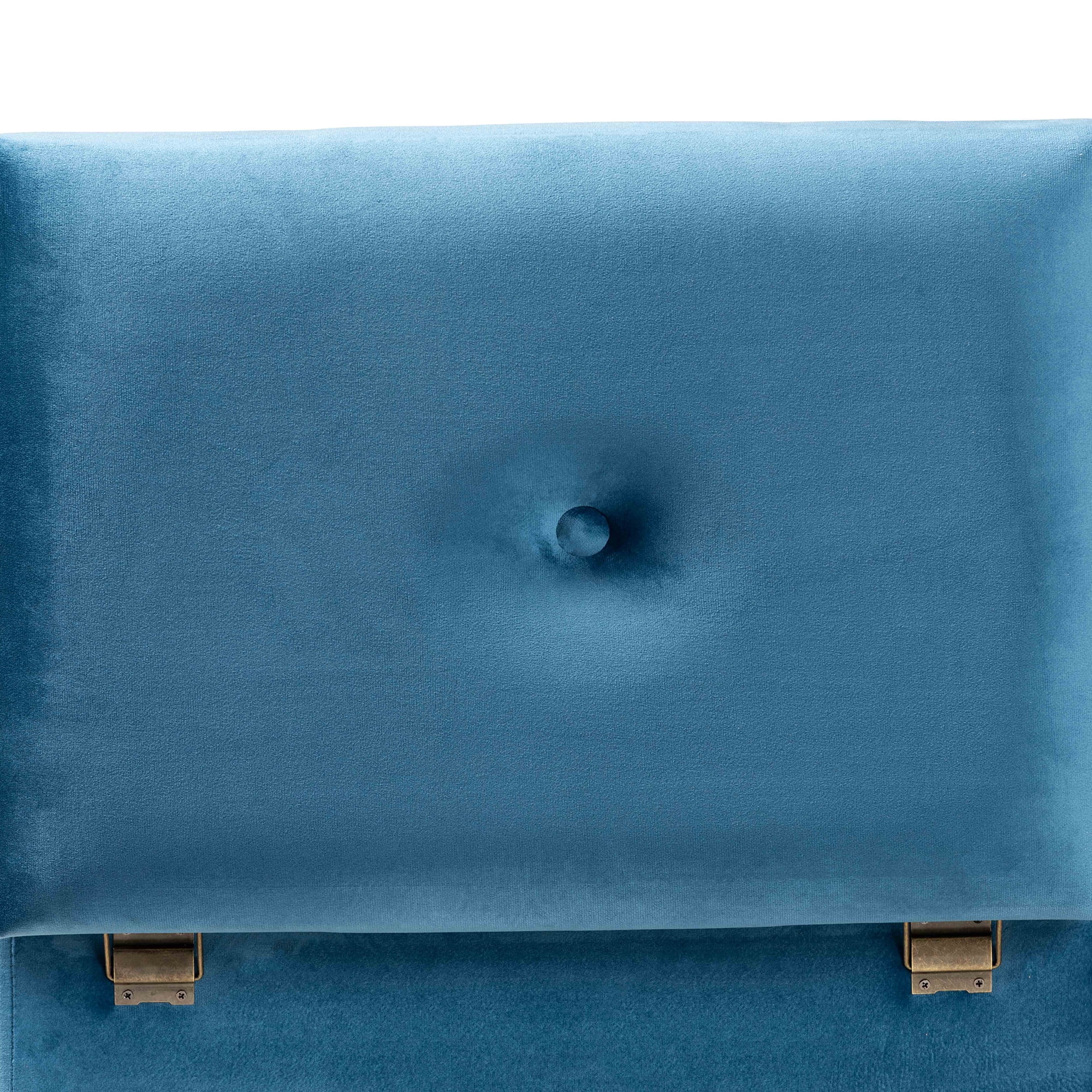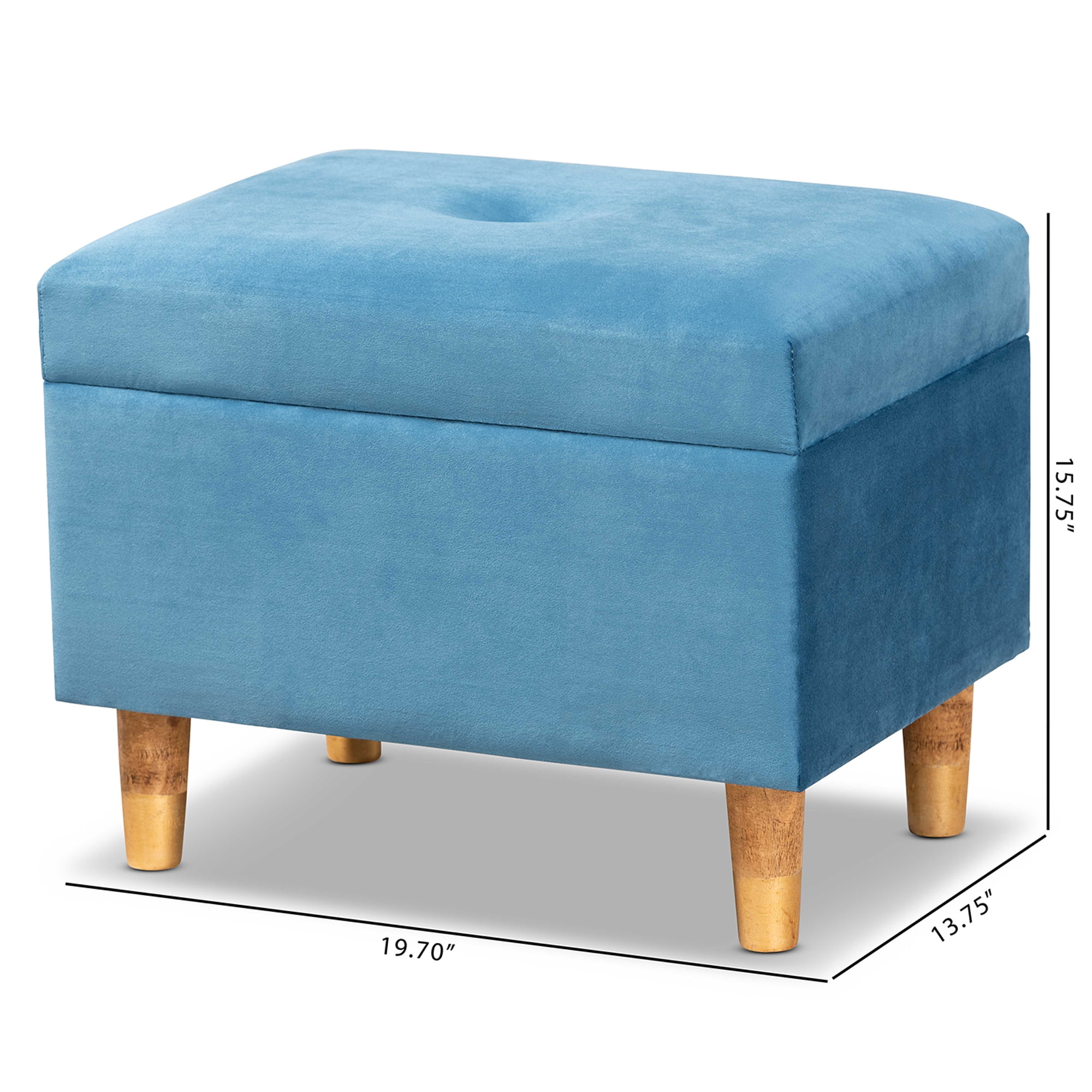 • Constructed from firwood and engineered wood • Oak finish • Upholstered in velvet polyester fabric and padded with foam • Lift-top storage compartment • Button tufted • Antique brass finished metal latches • Assembly required • Product Weight: 8.8 Pound • Package Weight: 11 Pound • Dimensions: 15.7″ High x 19.7″ Wide x 13.8″ Deep; Seating Dimensions: 15.7″ High x 19.7″ Wide x 13.8″ Deep; Inner Storage: 10.2″ High x 18.1″ Wide x 11.4″ Deep; Legs: 4.3″High; • Product Color: Blue/Oak • Product Composition: Fabric Velvet “100% Polyester”/MDF/Foam/Fir wood