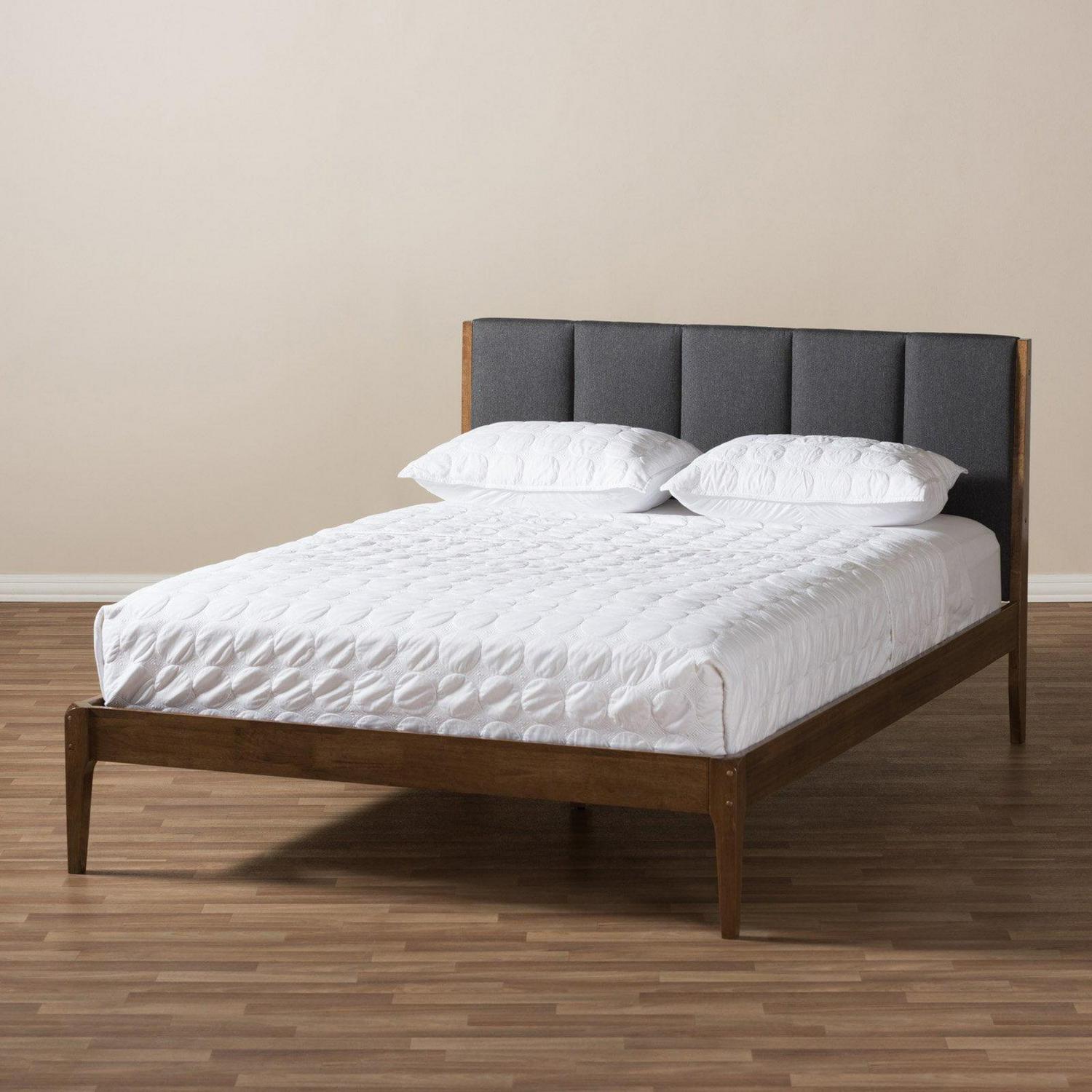 Vertical tufting and your choice of upholstery color make this Baxton Studio Ember Platform Bed a comfortably chic choice for your bedroom. The sleek legs, footboard, and rails are made of rubberwood in a versatile walnut finish. The platform base of this bed doesn’t need a box spring. Choose from available size options.Bed Dimensions:Full: 55.91W x 80.31D x 42.13H in.Queen: 62.2W x 85.24D x 42.13H in.King: 77.95W x 85.24D x 42.13H in.