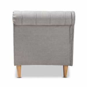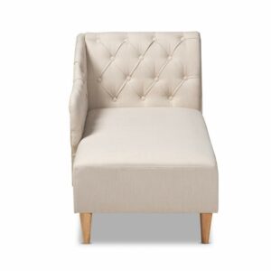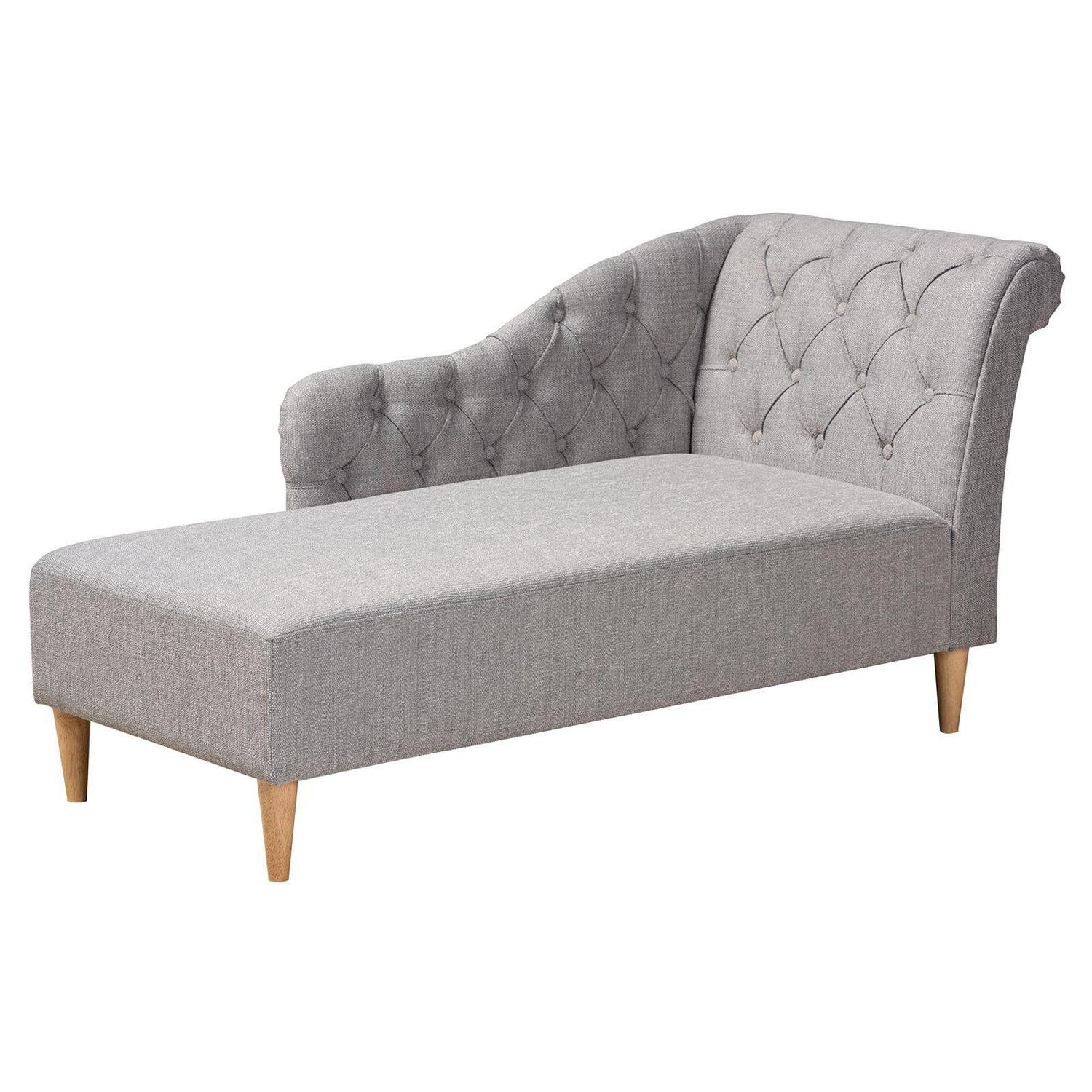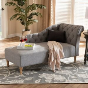 Lounge in style and comfort on the Baxton Studio Emeline Modern / Contemporary Upholstered Chaise Lounge. This Victorian-inspired chaise features a graceful scroll back and single armrest that displays lavish button tufting. Designed to add both elegance and function to your space, it’s crafted from sturdy wood and upholstered in soft fabric for utmost relaxation. The chaise is set on top of tapered, oak legs, adding a modern twist to this classic piece.