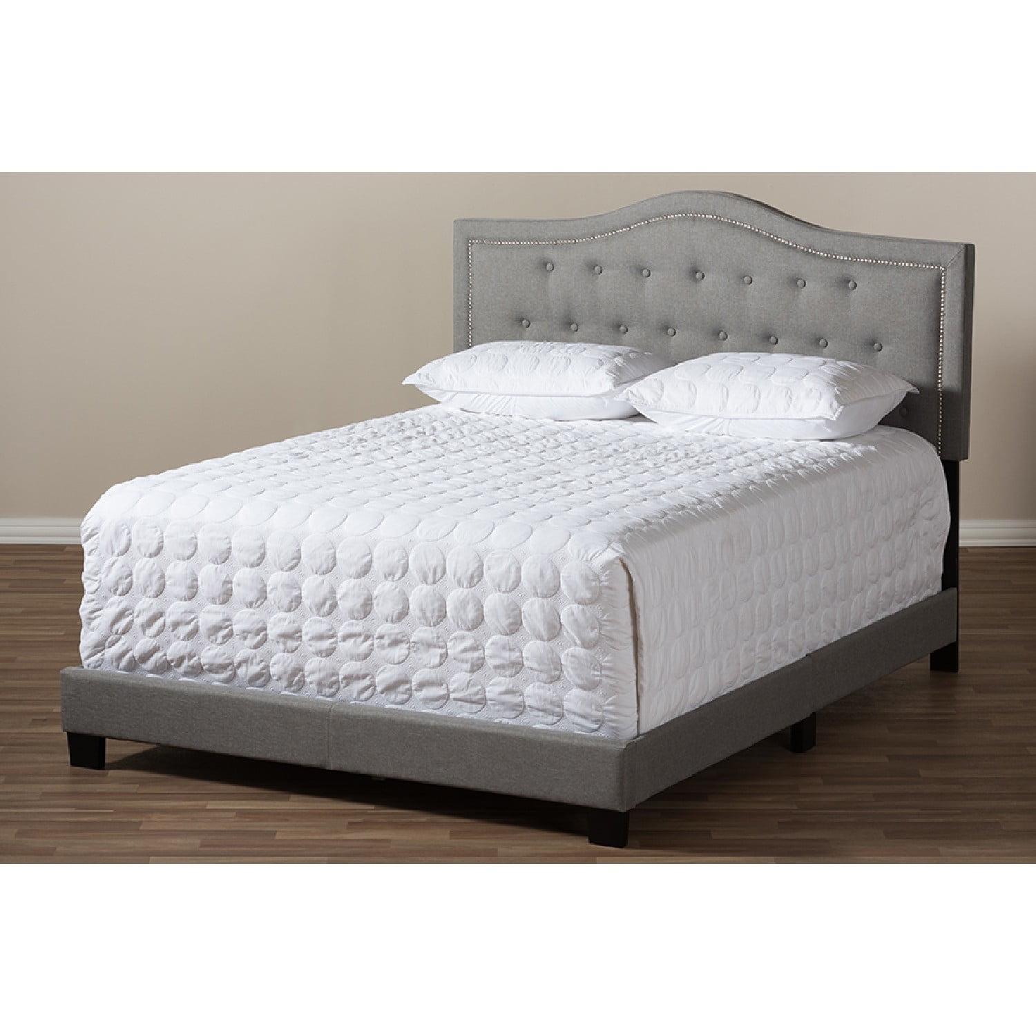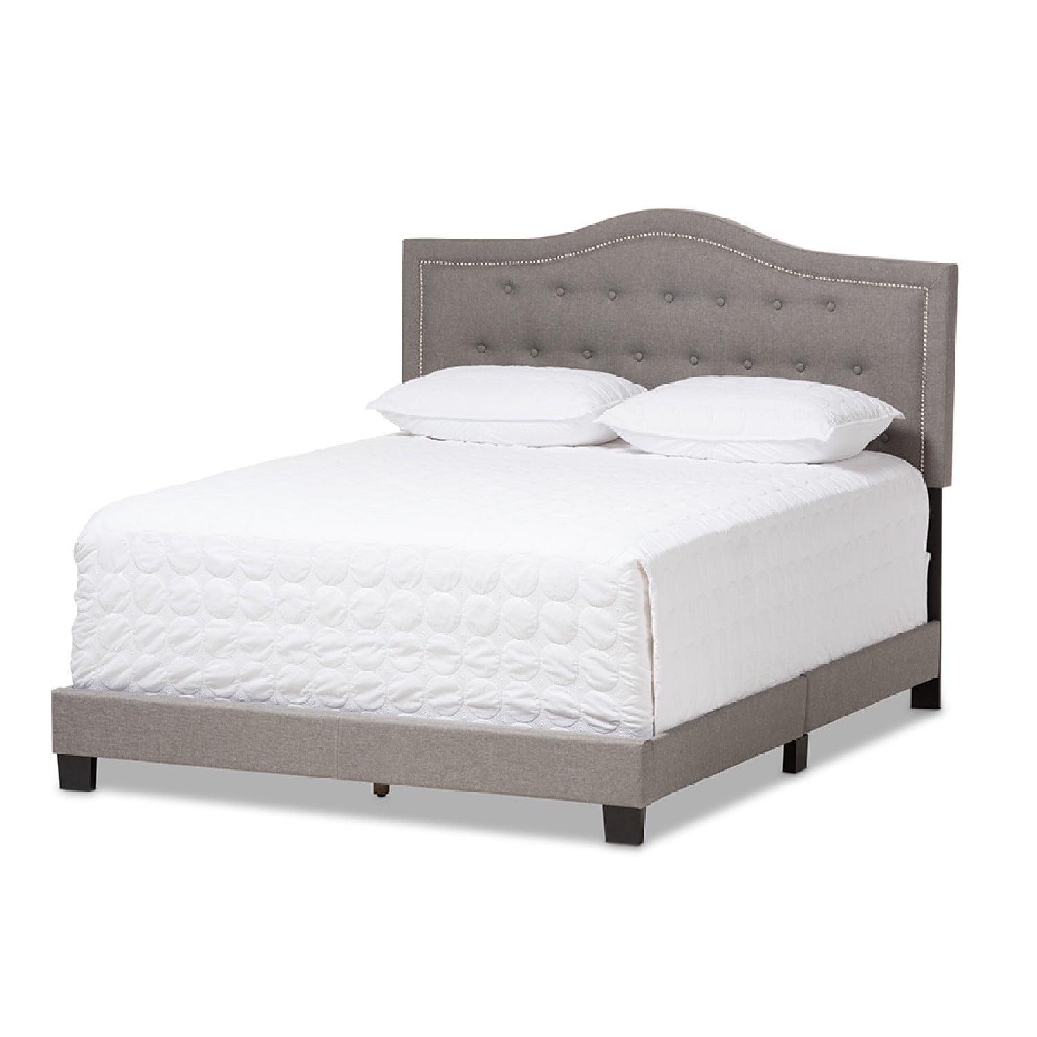 Baxton Studio Emerson Modern and Contemporary Light Grey Fabric Upholstered King Size Bed The Emerson fabric upholstered bed is relaxed and quietly elegant. Soft grey polyester fabric upholstery is complemented by black painted wood legs for a graceful piece of bedroom furniture. Featuring curvaceous headboard, the bed is button-tufted for a classic look while silver nail heads trimming reflects its glamour. Matching with a low footboard, the Emerson will create an airy feel in a small room setting. For you to lean back comfortably, the bed frame is padded throughout with foam over its solid rubber wood frame. Standard US box spring and mattress will complement this king-sized Emerson bed for an elevated bed height. Made in Malaysia, the Emerson requires assembly.