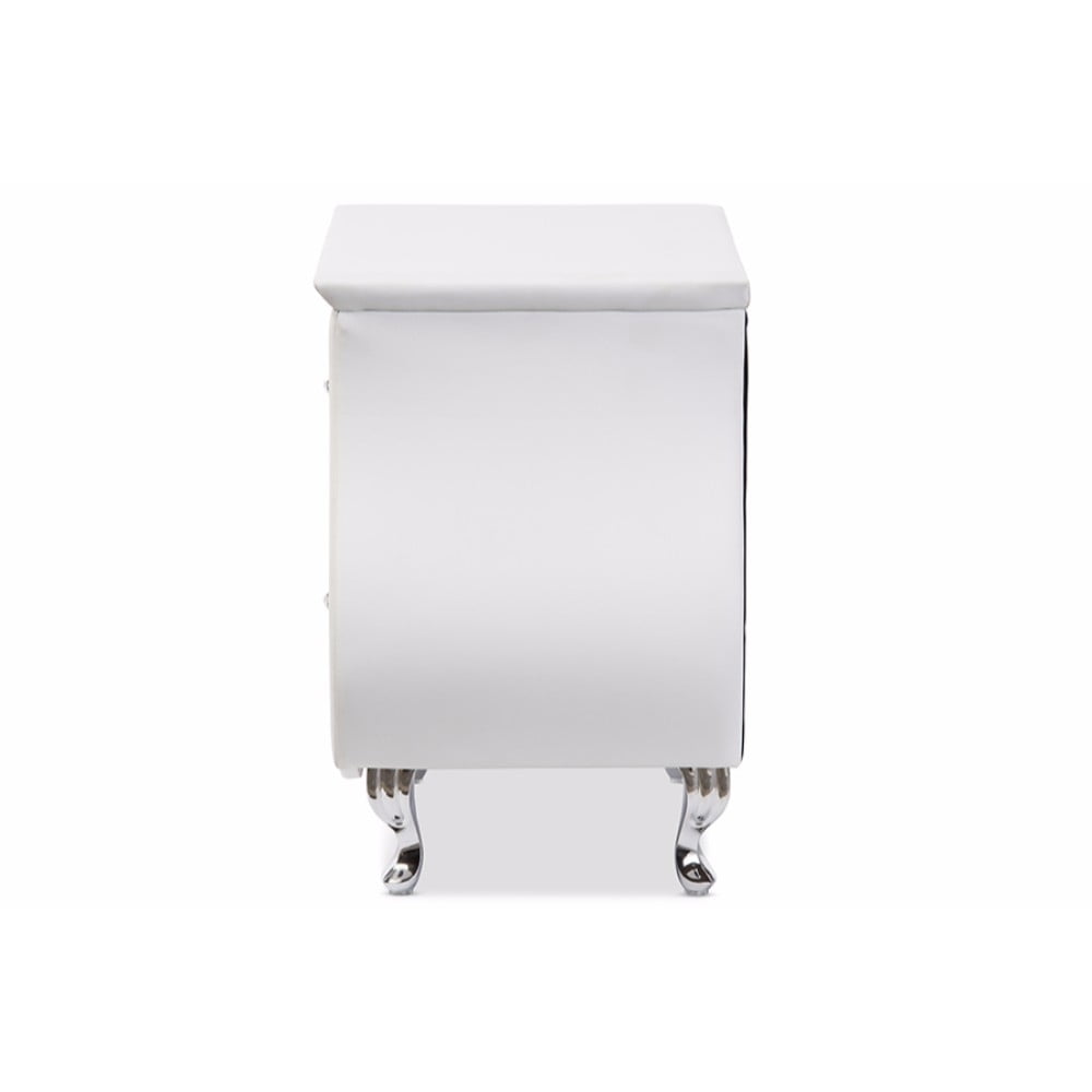 Baxton Studio Erin Modern and Contemporary White Faux Leather Upholstered Nightstand With two storage drawers Erin Modern and Contemporary Faux Leather Upholstered Nightstand is perfect for keeping those everyday small items. Compact enough for sitting next to your bed or around the home for quick easy access. Meticulously crafted, the Erin is constructed of solid hardwood and plywood frame and upholstered in faux leather. The stainless steel drawers pulls and chromed steel legs instantly update the modern look of the Erin bed side table. Beautifully shaped, the Erin is a standout piece for any home looking to add a touch of refined style. Made in Malaysia, the Erin will require light assembly for the legs.