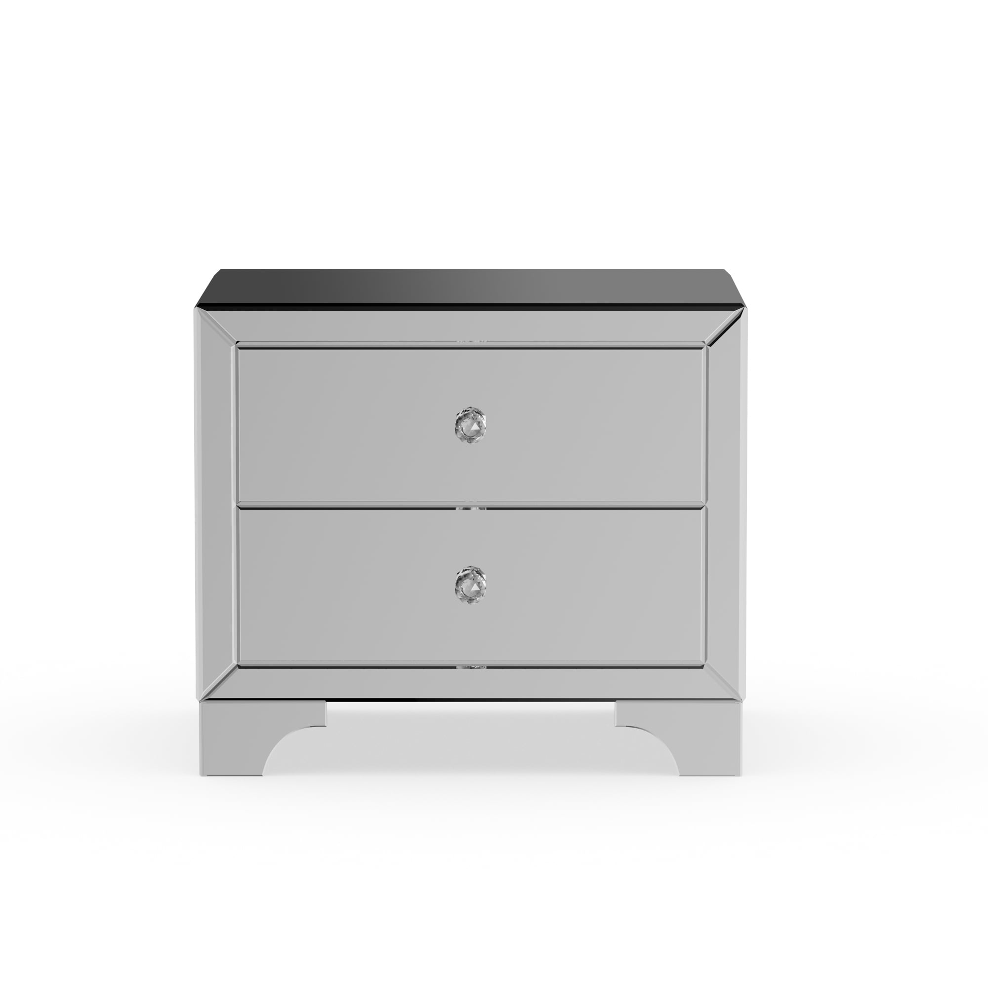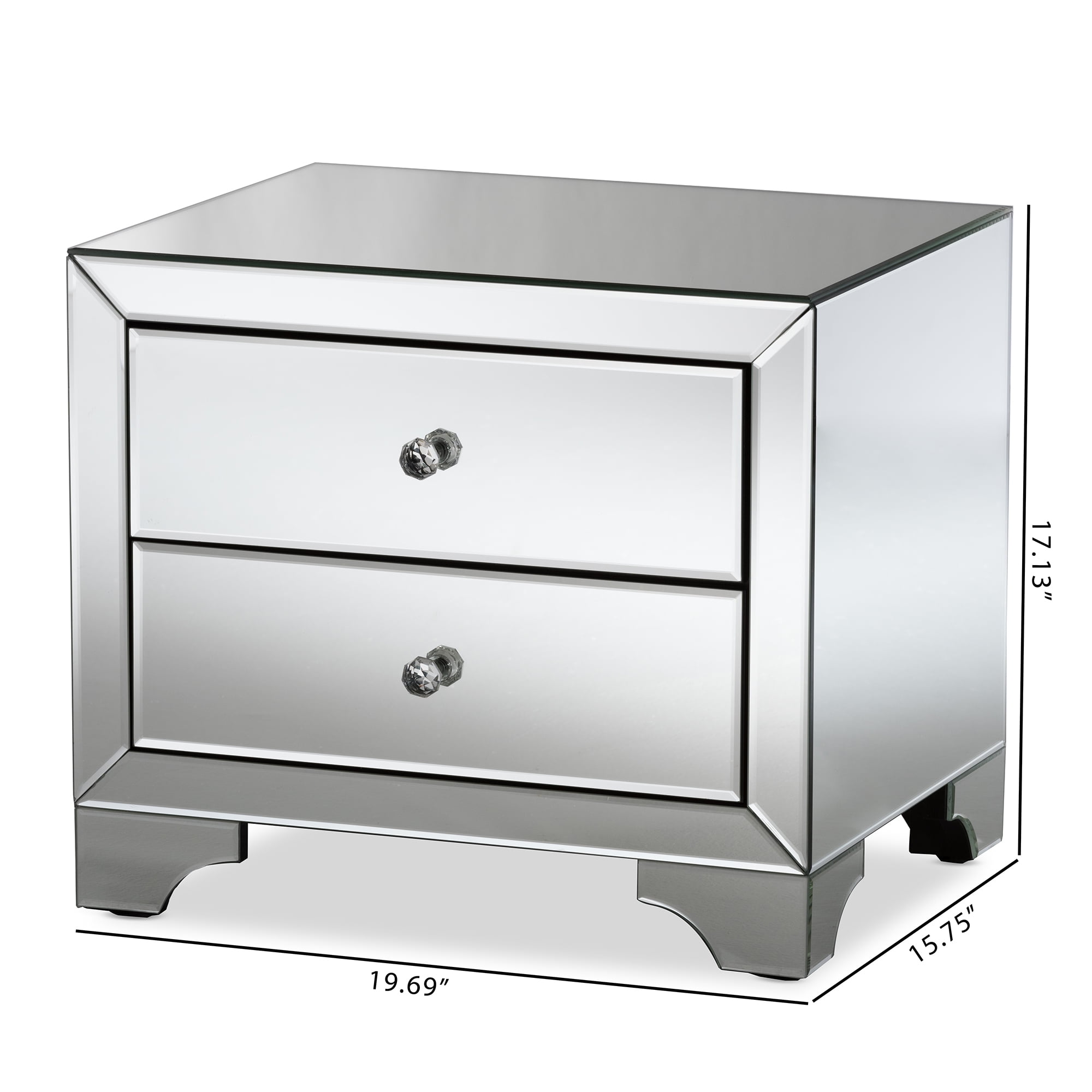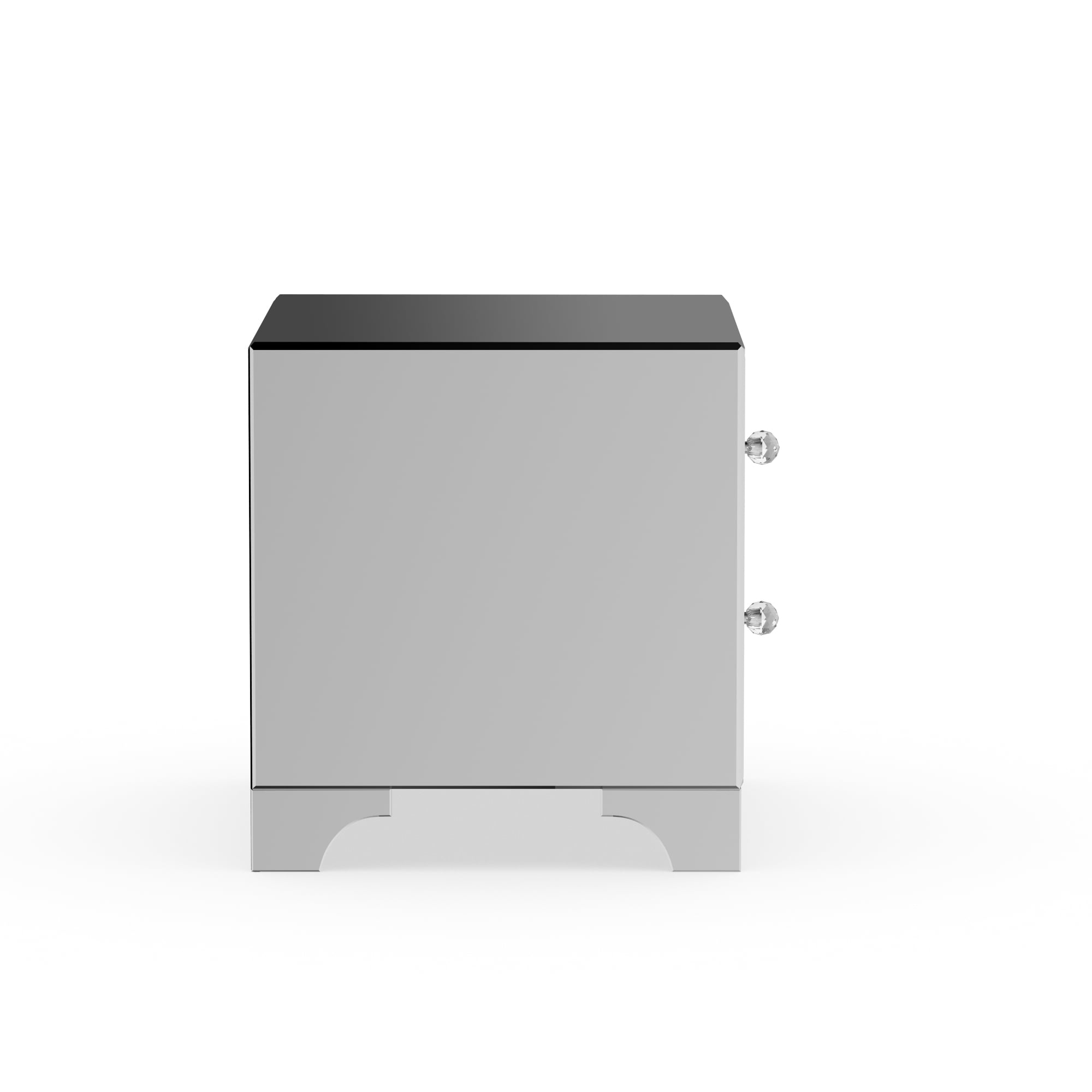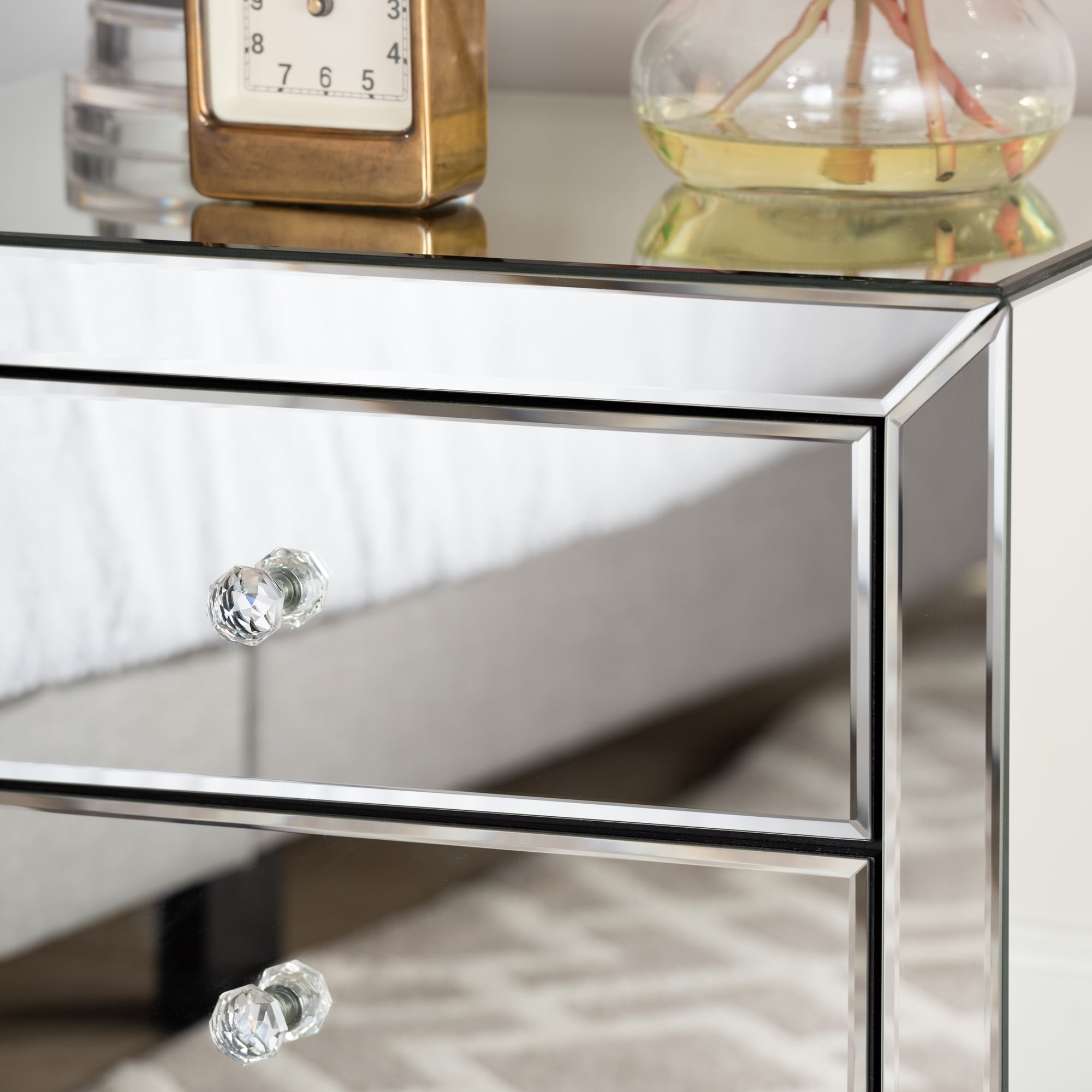 Create an uplifting space with the chic Farrah 2-drawer end table. Featuring a stunning piece of furniture, the Farrah will add light, sparkle and luxury to your interior as well as space for storing household items. Constructed of MDF and encased with mirror, the Farrah is a good size living room table for your every day’s convenience. Two drawers, with soft close feature provides ample storage in any interior. Decorated with clear crystal drawer handles, the Farrah looks glamour from all angles. The attached mirrored feet elevate the height of the end table to match with your arrangement. Made in China, the Farrah will arrive fully-assembled.