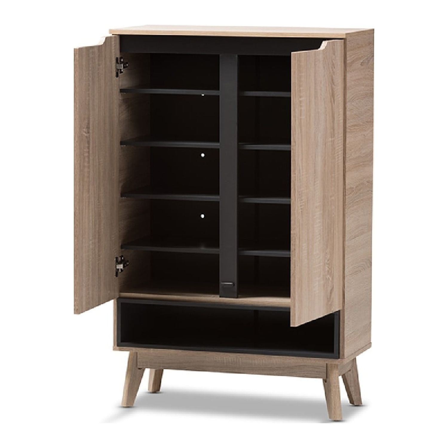 Baxton Studio Fella Mid-Century Modern Two-Tone Oak and Grey Wood Shoe Cabinet A perfect blend of classic and modernity, the Fella collection showcases pattern played with clever balance of colors and sleek surface. Constructed of engineered wood in oak and grey two-tone finishing, the Fella 5-drawer chest reveals a fresh and relaxing look. Angled legs complements the piece of furniture for superior support and style. Two doors open to reveal storage room for shoes. With practicality, the inset handles and the open shelves in grey wood finish contrasts with the oak surface for a contemporary, Scandinavian aesthetic in your home. Made in Malaysia, the Fella 2-door shoes storage cabinet requires assembly. Specifications: Mid-century storage cabinet Two-tone finishing Oak and grey PU veneer finishing Two (2) doors and one (1) open shelf Two (2) doors reveal six (6) shelving spaces Made in Malaysia Assembly required