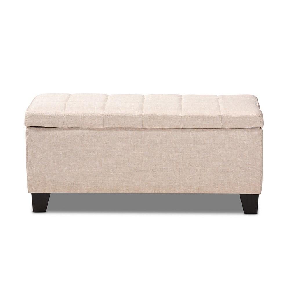 Baxton Studio Fera Modern and Contemporary Beige Fabric Upholstered Storage Ottoman Stylish and versatile, the Fera storage ottoman is a useful addition to any room in the home. This modern ottoman displays a simple, streamlined design that makes it complimentary to a wide range of decor styles. Upholstered in a soft, neutral polyester fabric, the lid is foam-padded and biscuit tufted to provide the utmost sitting comfort. The ottoman features a storage compartment under the lid, providing space to store extra blankets and pillows. Black-finished wood feet complete the look. Use this piece as both seating and storage in the entryway, living room, or bedroom. The Fera storage ottoman is made in China and requires assembly.