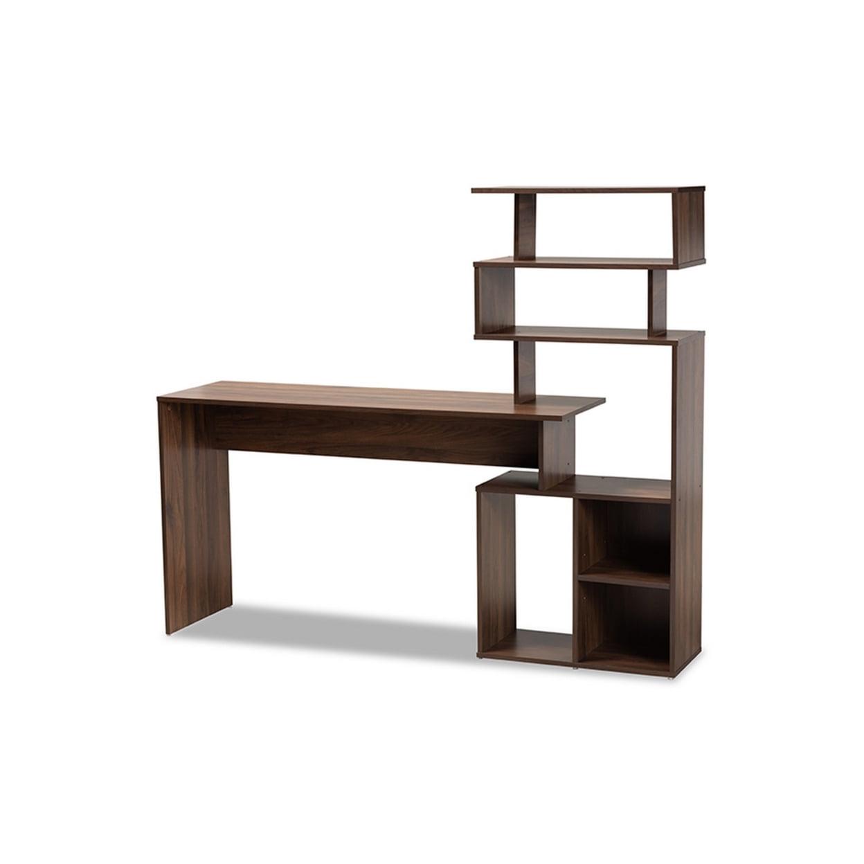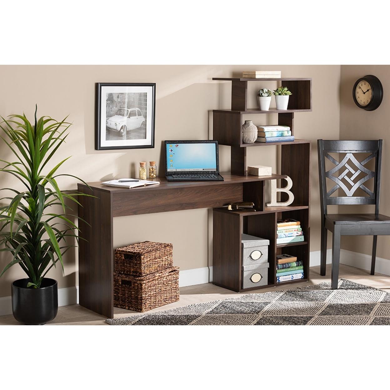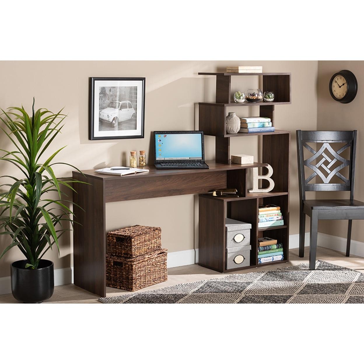 Baxton Studio Foster Modern and Contemporary Walnut Brown Finished Wood Storage Desk with Shelves Invigorate your office space with the stunning design of the Foster desk. Made in Malaysia, the Foster features a unique wood frame displaying a warm walnut brown hue. Two upper tiers of artistic shelves create a striking pedestal for decorations, while four lower shelves provide convenient storage. Requiring assembly, the Foster features an open back for easy cord management. With striking visuals and fantastic utility, the Foster desk is a refreshing addition to any space.