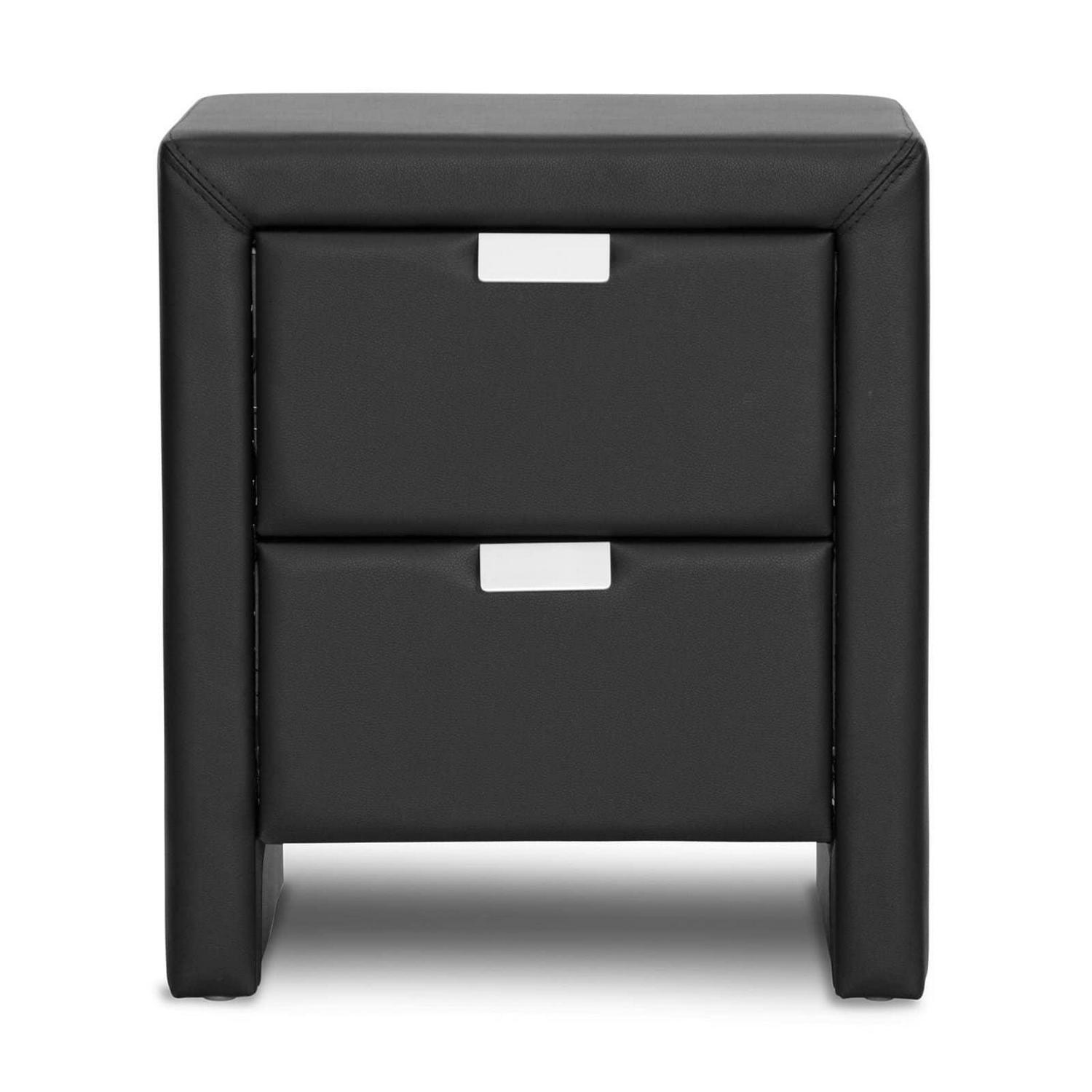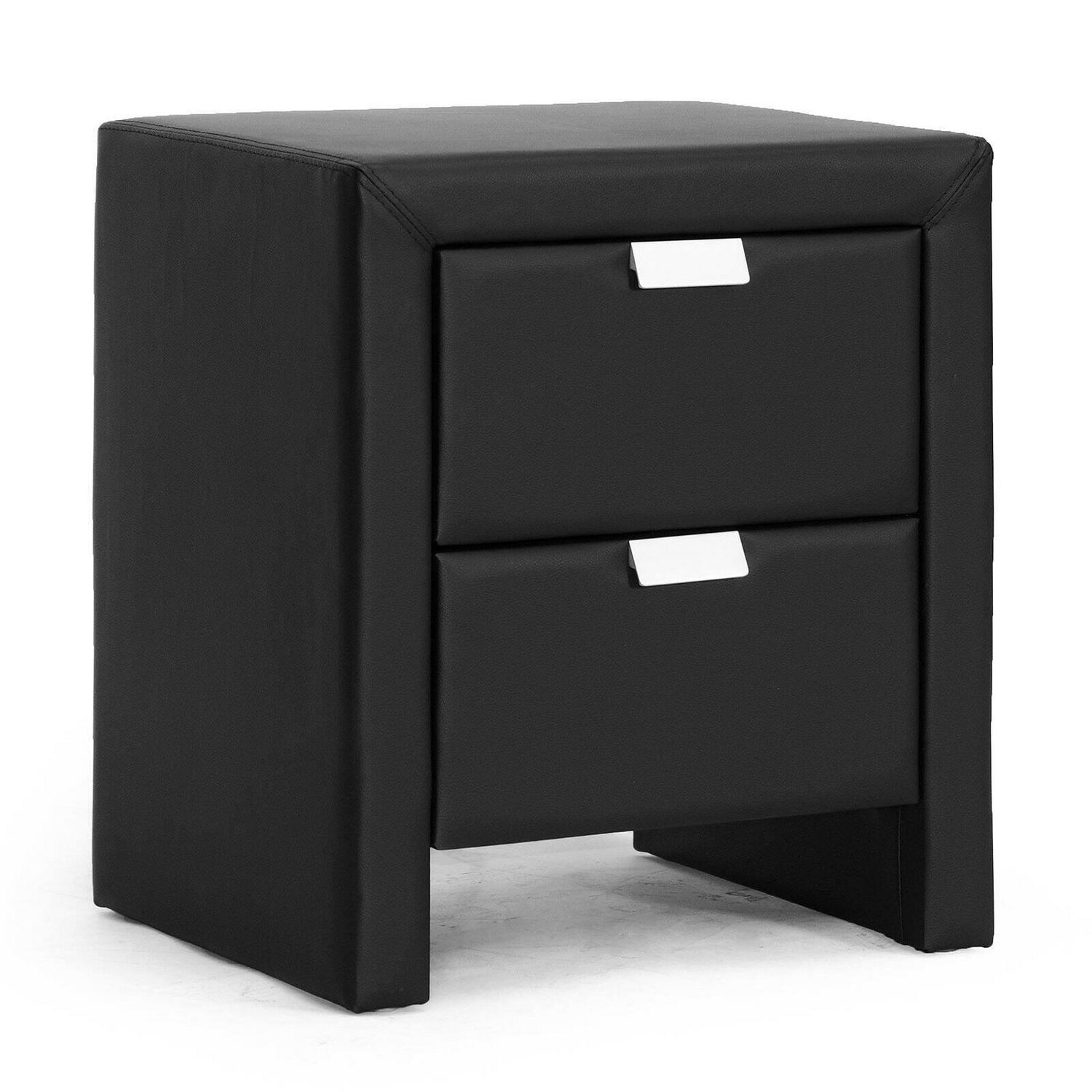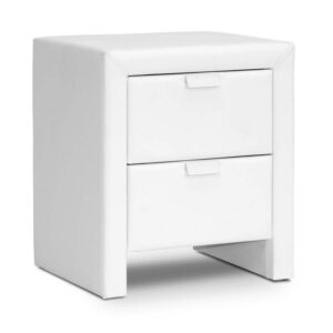 Baxton Studio Frey White Upholstered Modern Nightstand The Frey Designer Nightstand makes it easy to stash your odds and ends, turning clutter into sleek contemporary goodness. The Frey Nightstand is made in Malaysia with a sturdy plywood and hardwood frame topped with a thin layer of foam padding and white faux leather. Silver drawer pulls not only allow the two drawers to be opened with ease but add another layer of modern polish. The modern bedside table, which comes fully assembled, is also available in black (sold separately). To clean, wipe with a damp cloth. Product dimension: 18.5″W x 15.87″D x 21.5″H , drawer(2): 12.37″W x 12.62″D x 5.5″H