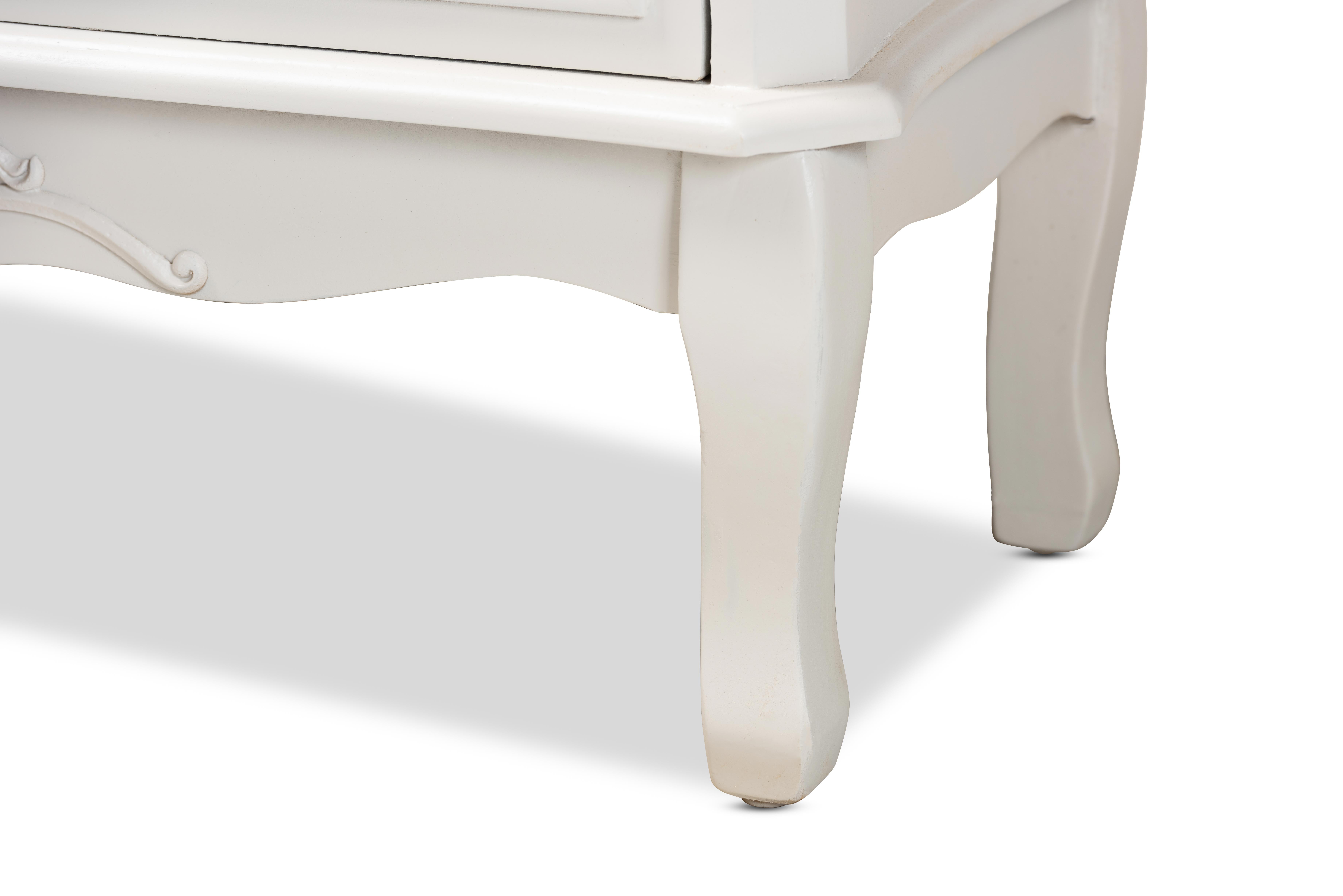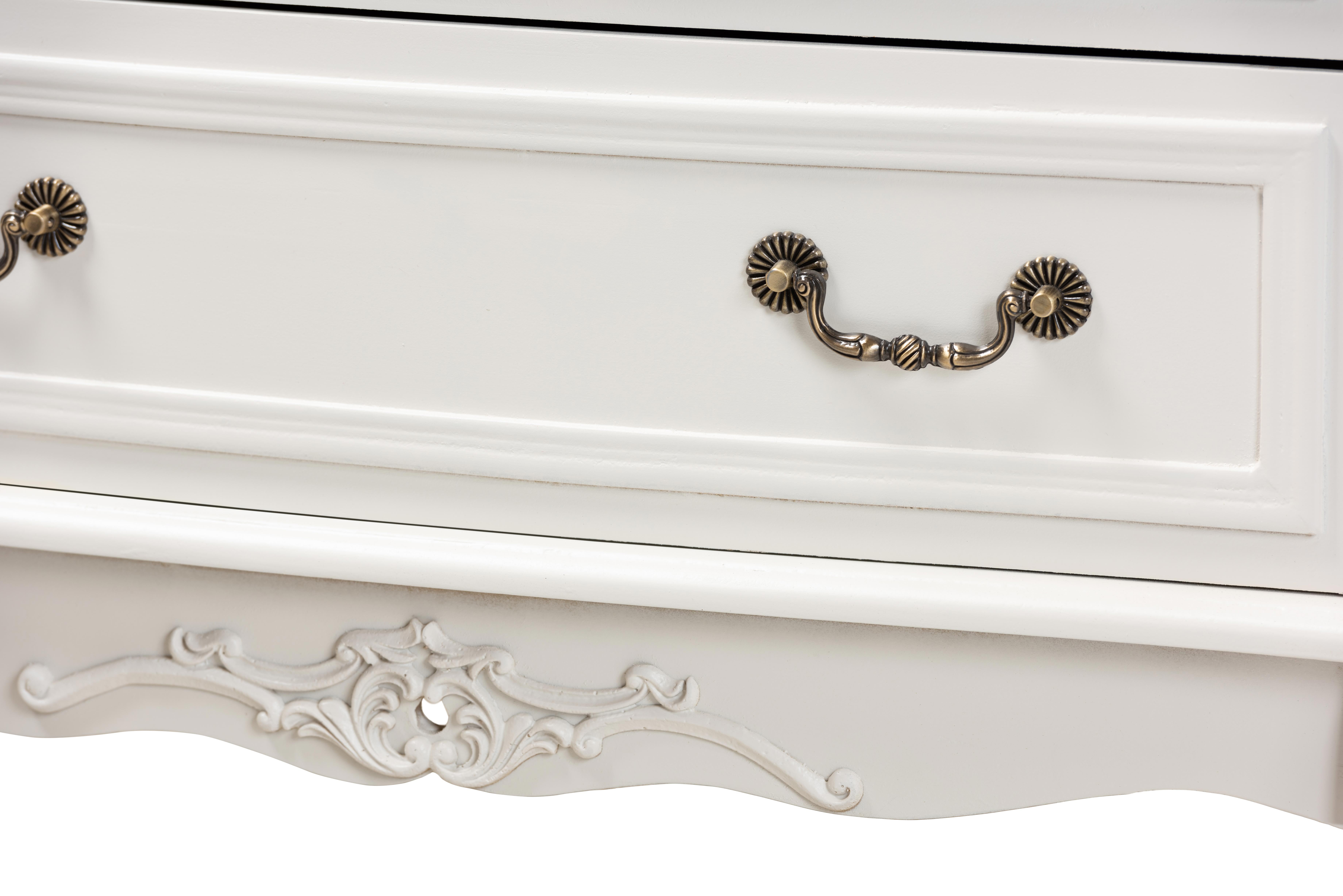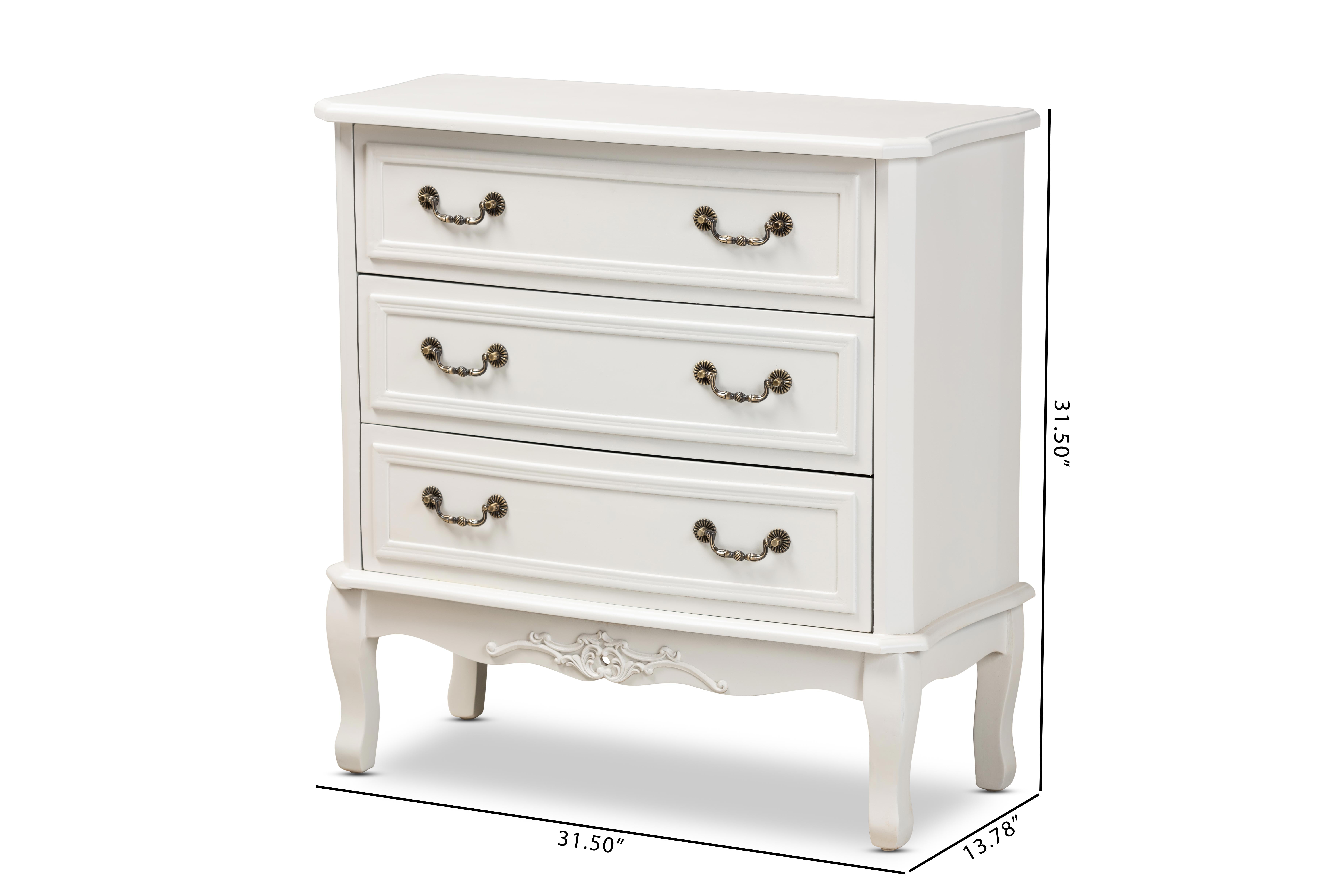 • Traditional French Provincial nightstand • Constructed from MDF wood and fir wood • White finish • Three (3) drawers • Decorative brass metal handles • Fully assembled • Made in China