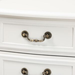 With its floral embellishments, the Gabrielle end table makes for a charming interior assistant. Constructed from wood, this end table features three drawers for storage. Its classic white finish highlights the stunning attention to detail in the inset paneling on the drawers, as well as the enchanting floral molding on the bottom. Decorative brass metal handles and cabriole legs add a delightful French-inspired look. This versatile piece is well suited for use as an end table in the living room or any shared space. The Gabrielle end table is made in China and will arrive fully assembled.
