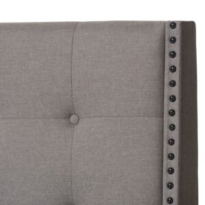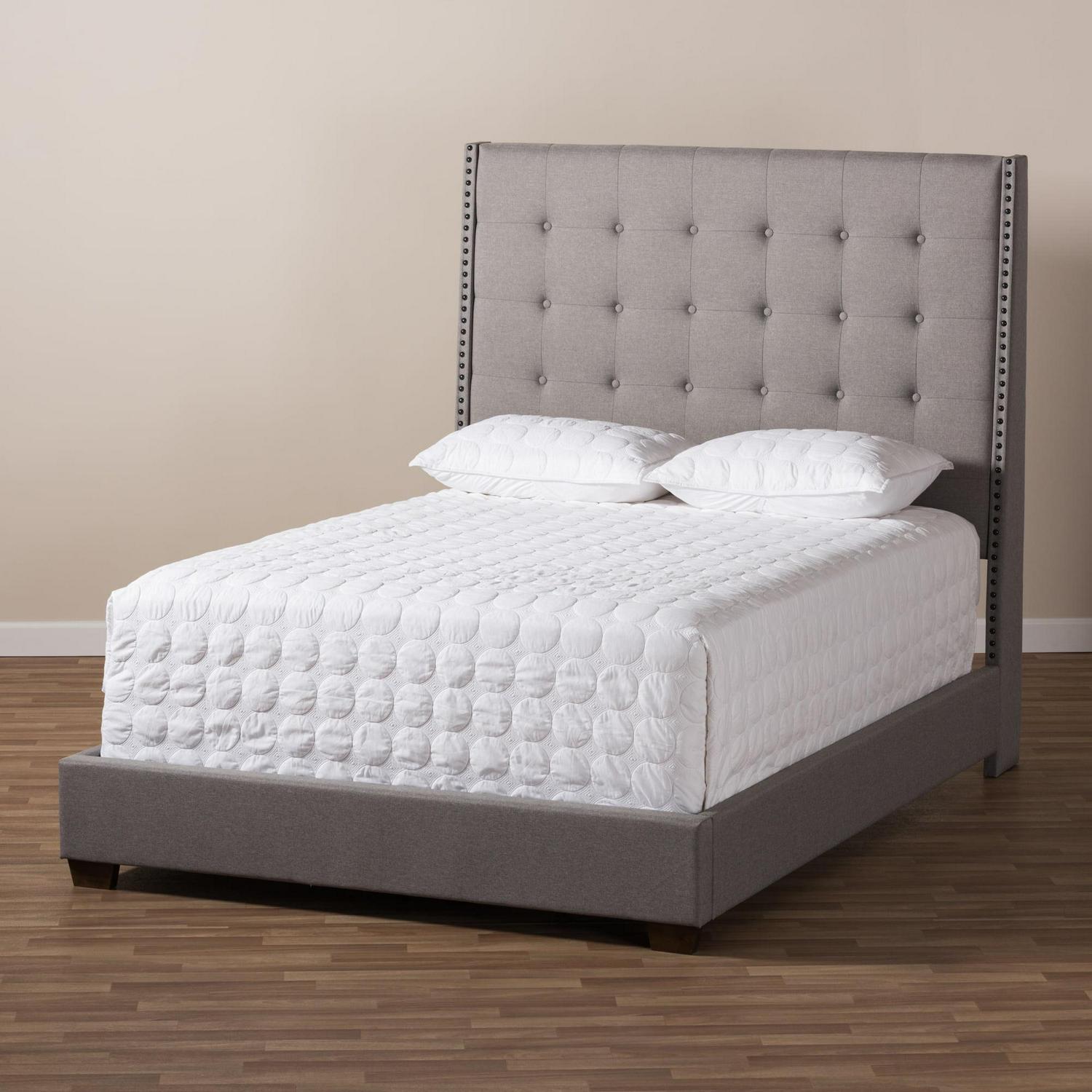 Give your bedroom a much-needed makeover with the Baxton Studio Georgette Modern and Contemporary Fabric Upholstered Panel Bed. This stunning modern bed features a tall, wide rectangular headboard with a square-tufted face and antique nailhead trim down the sides. Durable wood constructs the piece, padded with foam and upholstered in a linen-like fabric. No box spring is required. Choose size and fabric color options from the available.Bed Dimensions:Queen: 63.78W x 91.14D x 65.35H in.King: 79.92W x 91.14D x 65.35H in.