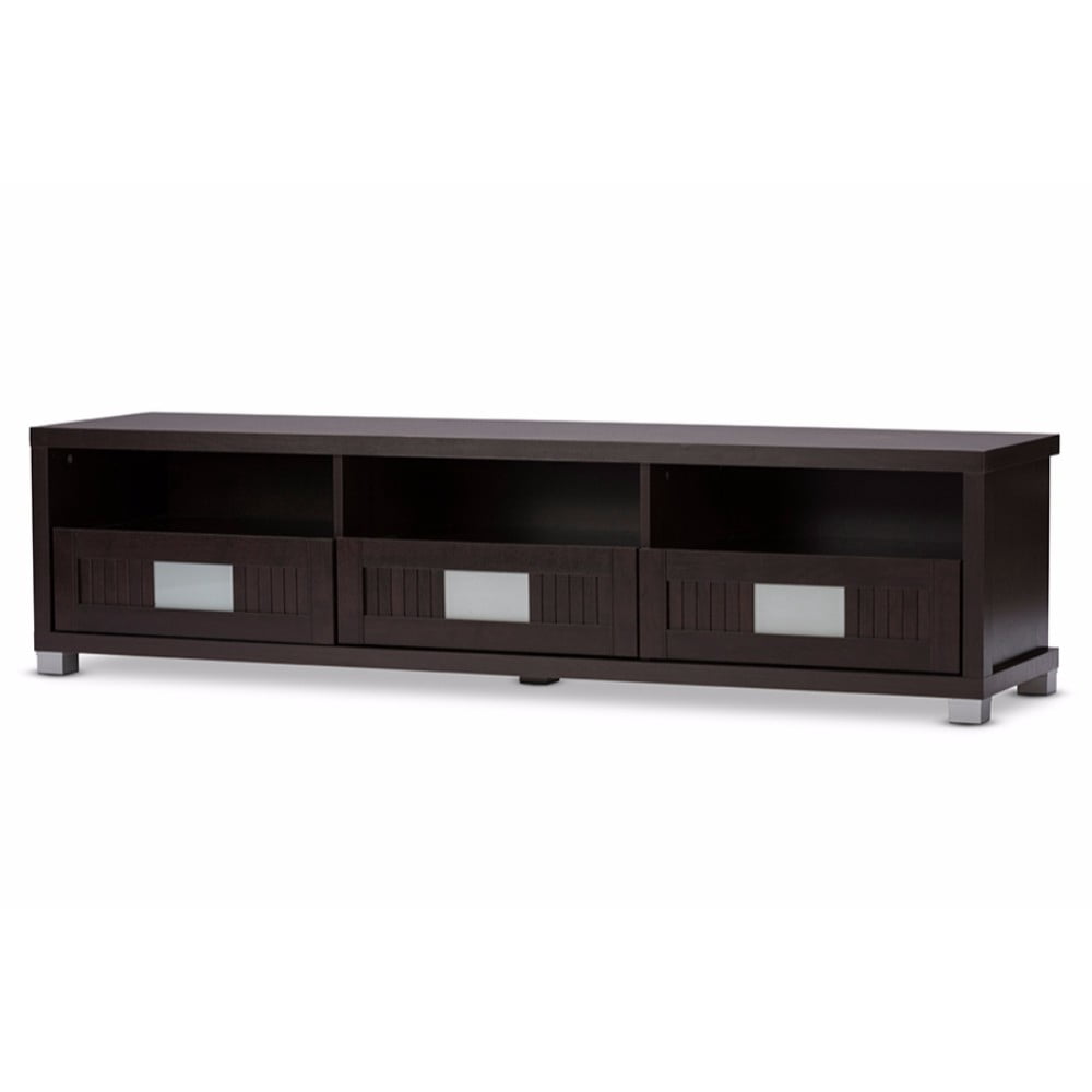 Baxton Studio Gerhardine Dark Brown Wood 63-Inch TV Cabinet with 3-drawer This sleek contemporary media console will be a sophisticated addition to your living room. The long low piece features clean lines, in a rich dark espresso finish that will complement your decor. The generous top surface will accommodate a large television up to 75 inches flat screen TVs , while open compartments below are ideal for electronics components. The large lower drawers and shelves offer lots of enclosed storage, great for movies, gaming equipment, and other media items that you want to keep hidden. The combination of MDF and frosted glass decoration accent the drawer front for a cool modern look that you will love. Create a chic look in your living room with this stylish contemporary TV stand. Specifications: Materials: Engineered wood and MDF Finishing: Espresso PU veneer finishing Frosted glass on the drawer front/door front