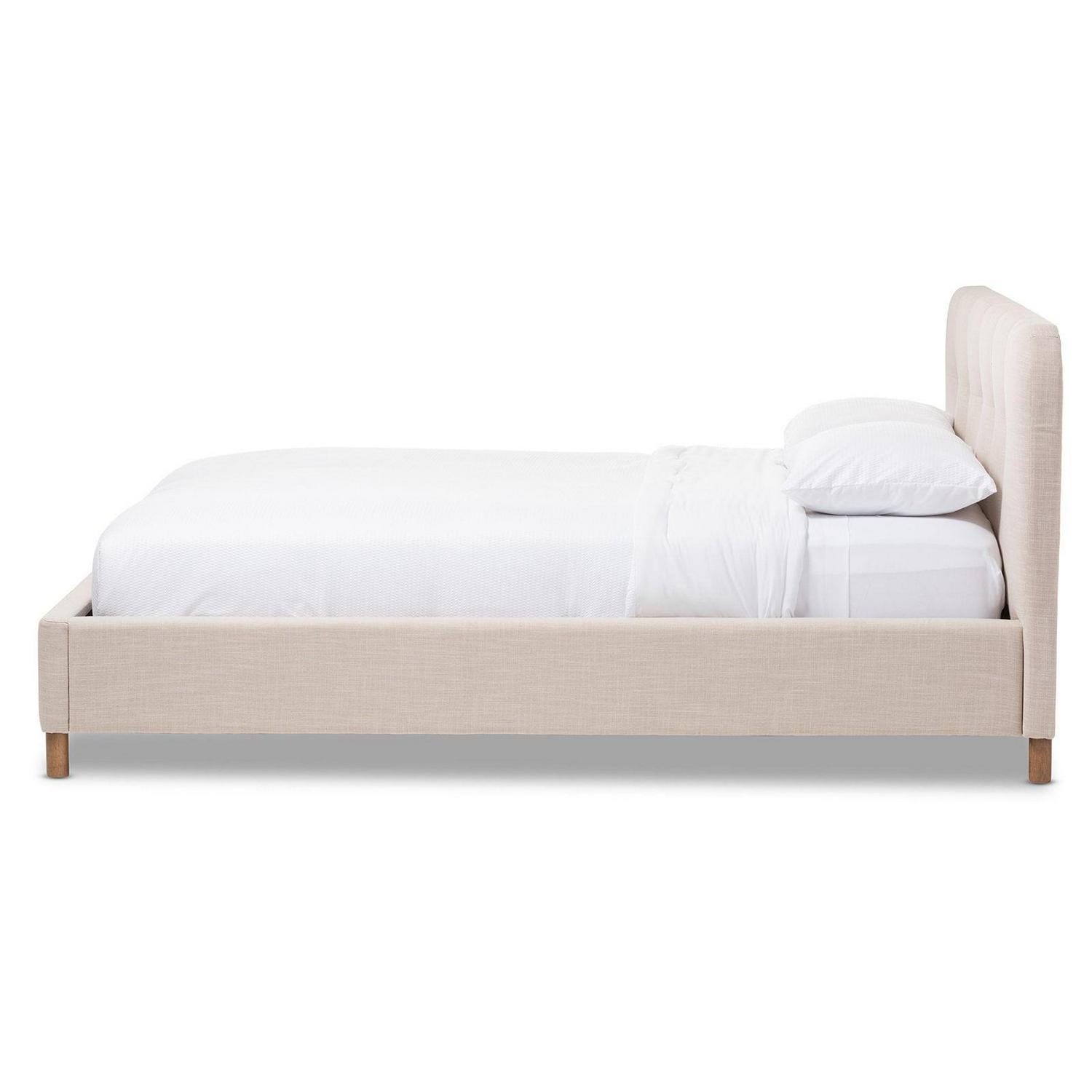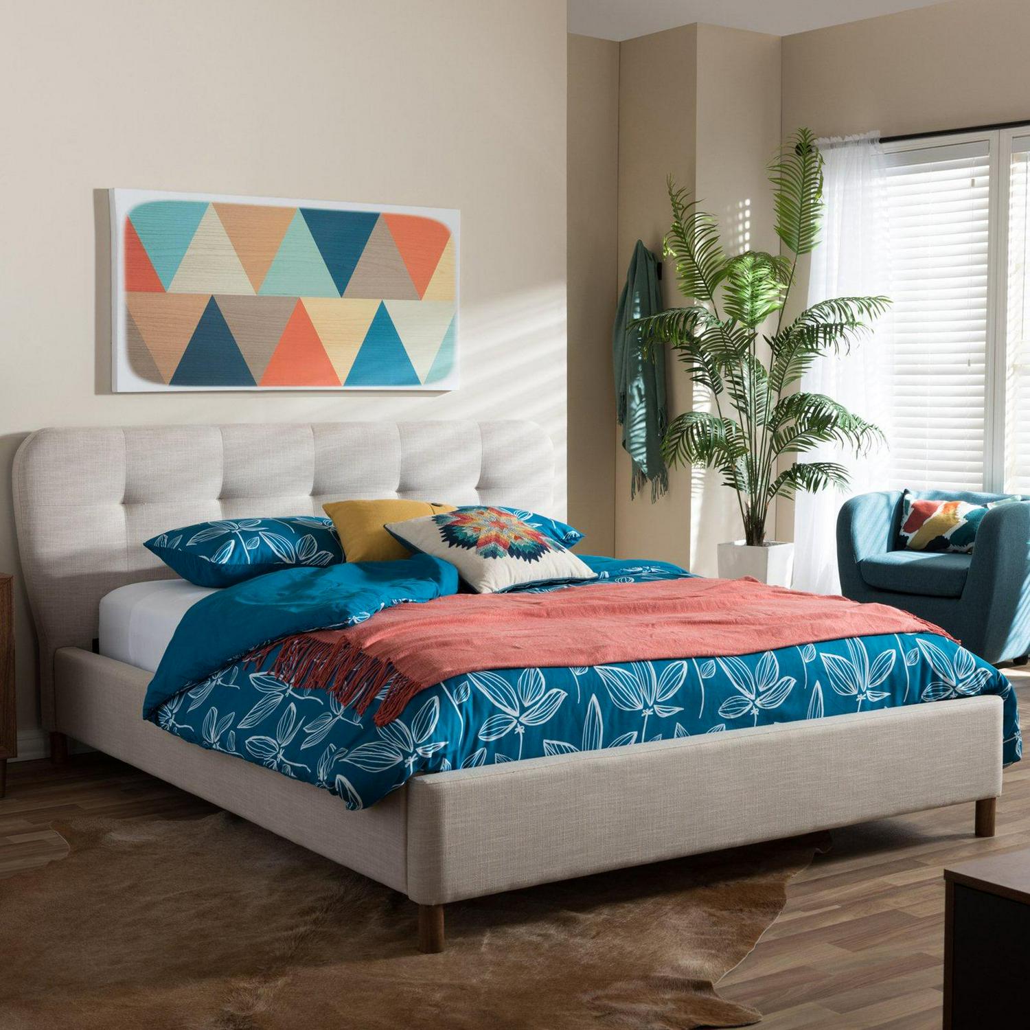 Germaine mid-century modern beige mix linen queen size grid-tufting platform bed boasts a low contemporary design and features a chic curved headboard with beautiful grid-tufting detailing. Upholstered in subtle beige mix linen, the Germaine platform bed has deep padded side rails, elegant rounded low footboard and rests upon charming walnut finished solid rubberwood legs. The bed has a high quality build and benefits from a strong sprung slatted wooden base that acts as a flexible and supportive platform for your mattress. These curved slats adjust to your bodys movement, providing pressure sensitive support to keep your spine in good alignment and increase your comfort levels. To provide additional stability to the frame and mattress, a central rail and support leg offer extra support in the center. This prevents any tendency to roll together. Creating a clean line and retro modern look in your bedroom, the Germaine queen size platform bed is both visually stunning and supremely comfortable. Sturdily constructed of solid rubberwood and plywood, the platform bed will be a timeless piece of furniture for years to come. The beige mix linen fabric upholstery, trendy and casual, will match well with all of your neutral home decor and background setting. The Germaine, extraordinarily different from regular platform bed design, featuring Scandinavian style design elements, will win all the wows from your guests. Made in Malaysia, the queen size fabric bed requires assembly.