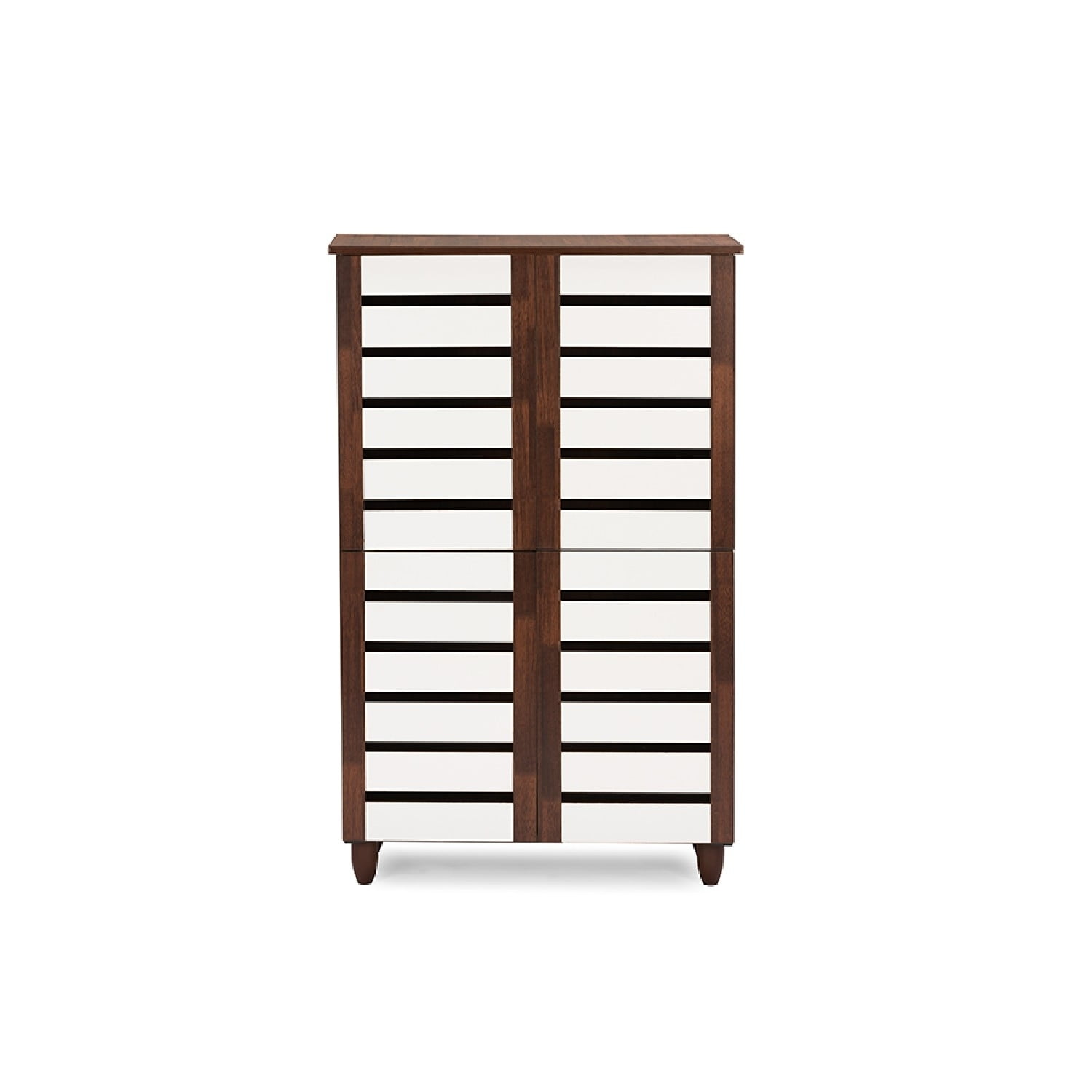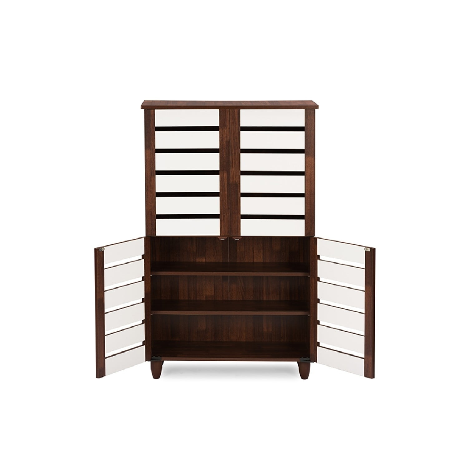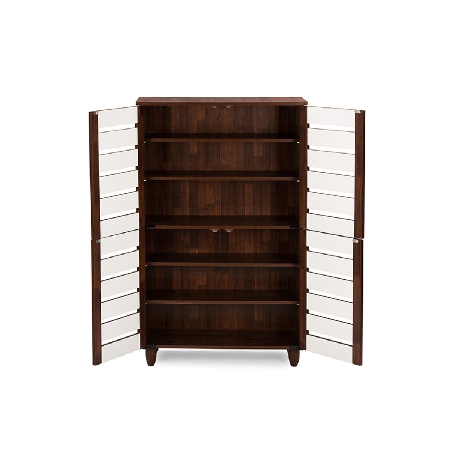Baxton Studio Gisela Oak and White 2-tone Shoe Cabinet With 4 Door With a compact and elegant design, the Gisela series shoe cabinets from Baxton Studio is perfect for houses with space constraints. Two-tone finish for a modern look in dark oak and white will blend in with a variety of dcor schemes easily. Functional and beautiful, it makes for a great addition to your home. The shoe cabinet is solidly built with engineered wood in two-tone oak and white finishing. The shoe cabinet has six shelves with five fixed dividers , four doors and vinyl legs. Made in Malaysia, the Gisela shoe cabinet requires assembly. Specifications: Made of engineered wood Two-tone finish in dark oak and white Storage capacity: 4-Door: 6 shelves space with 5 fixed dividers. Each shelf space measures 28″W x 11″D x 7″; Can hold up to 18 pairs of shoes Doors have a magnetic closing system Vinyl legs