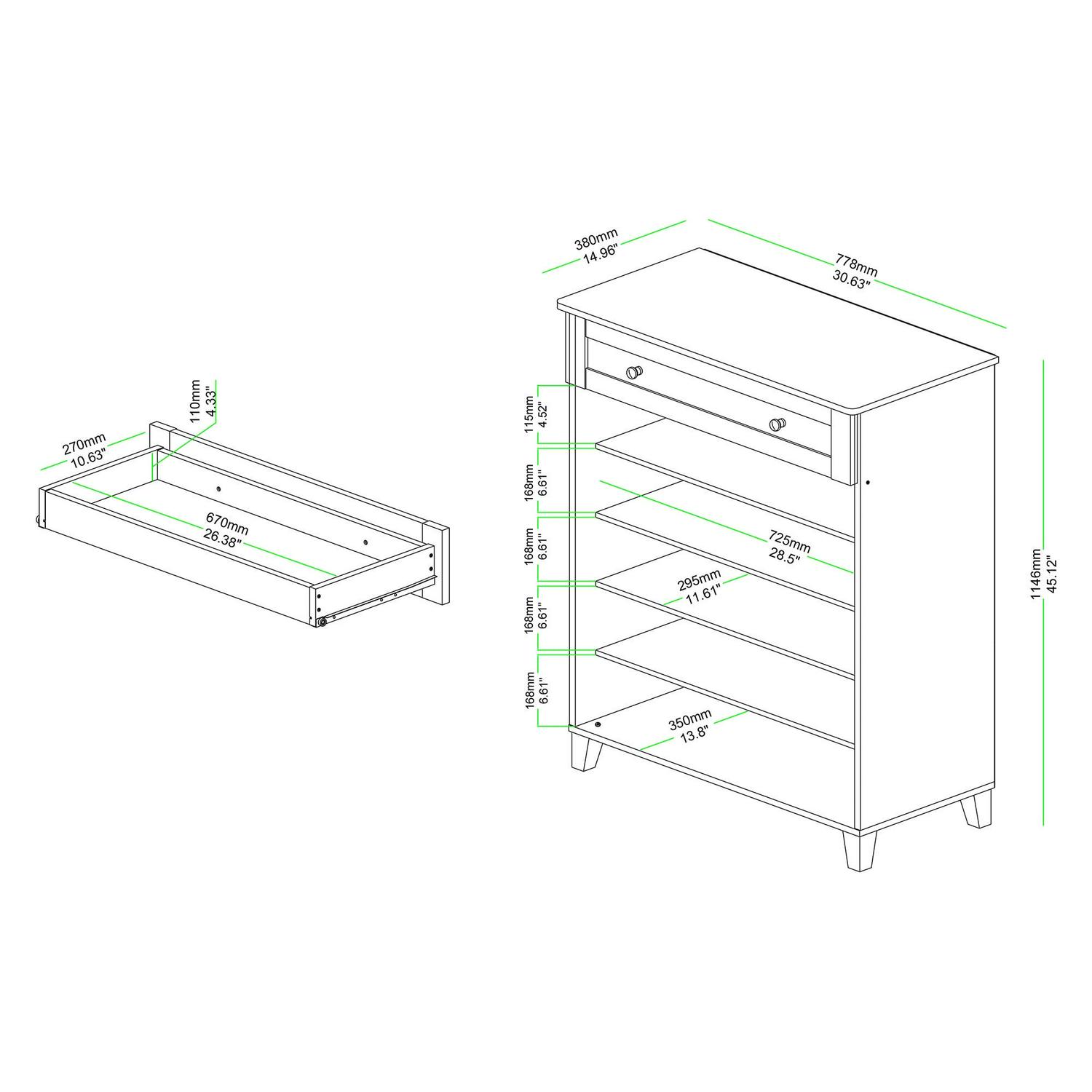 – Overall Dimensions: 45.10″ High x 30.60″ Wide x 15.00″ Deep; Drawer Dimensions: 26.40″ Wide x 10.60″ Deep x 4.30″ High; Larger Shelf Dimensions: 28.00″ Wide x 11.60″ Deep x 6.60″ High; Smaller Shelf Dimensions: 28.50″ Wide x 11.60″ Deep x 4.50″ High; Legs: 3.50″ High