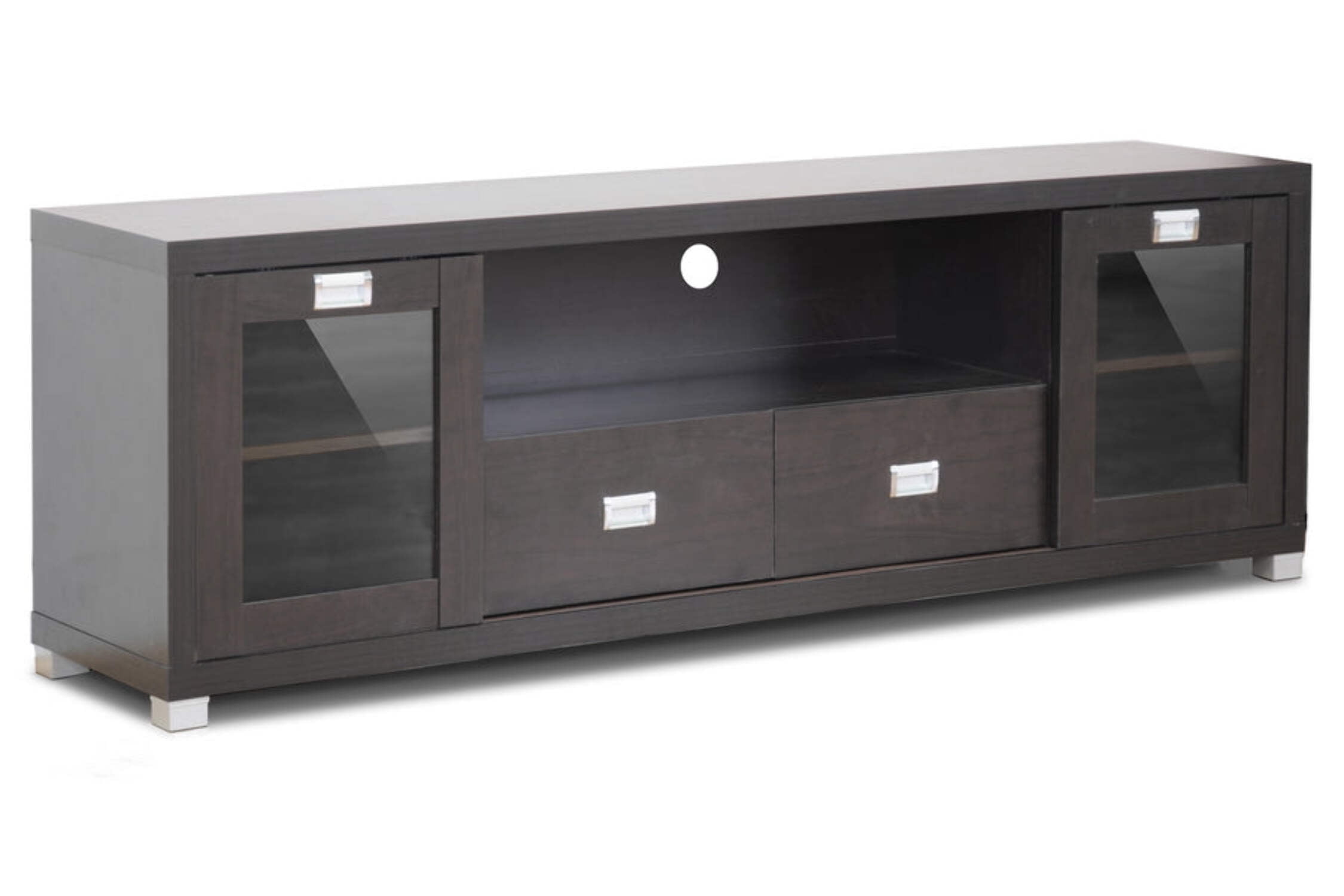 Dimensions: 69.44W x 15.56D x 23.31H in. Holds most TV screens up to 65 in. wide Durable engineered wood construction Scratch-resistant dark brown finish 1 open shelf and 4 shelves behind glass doors 2 sliding drawers Cable management openings in the back Contemporary style