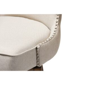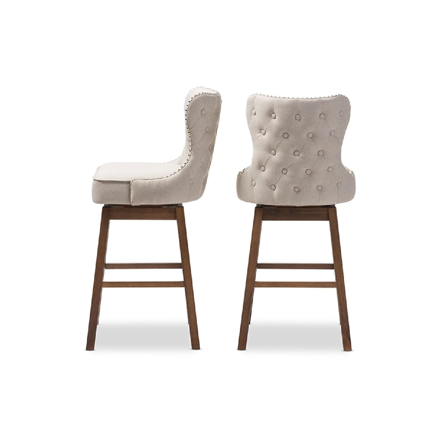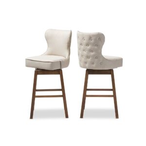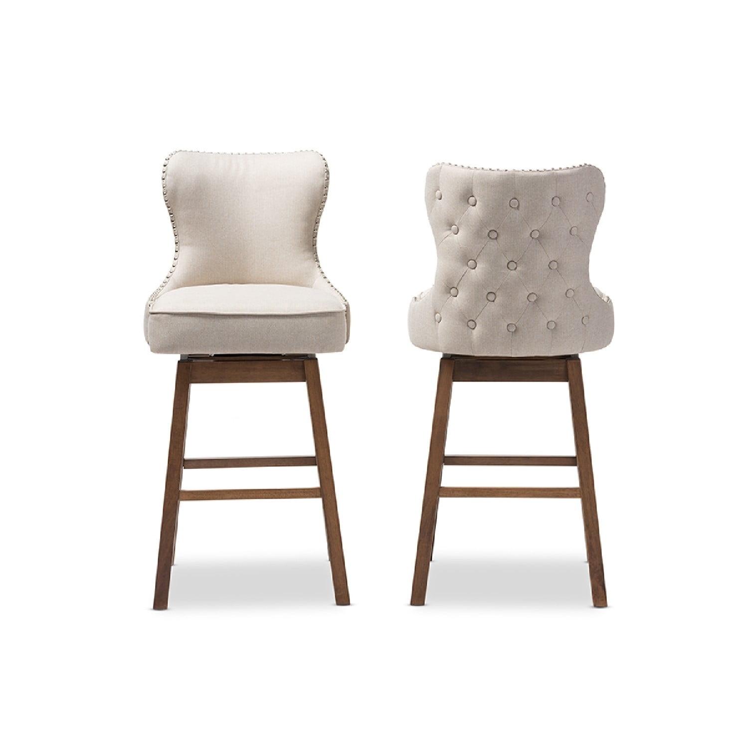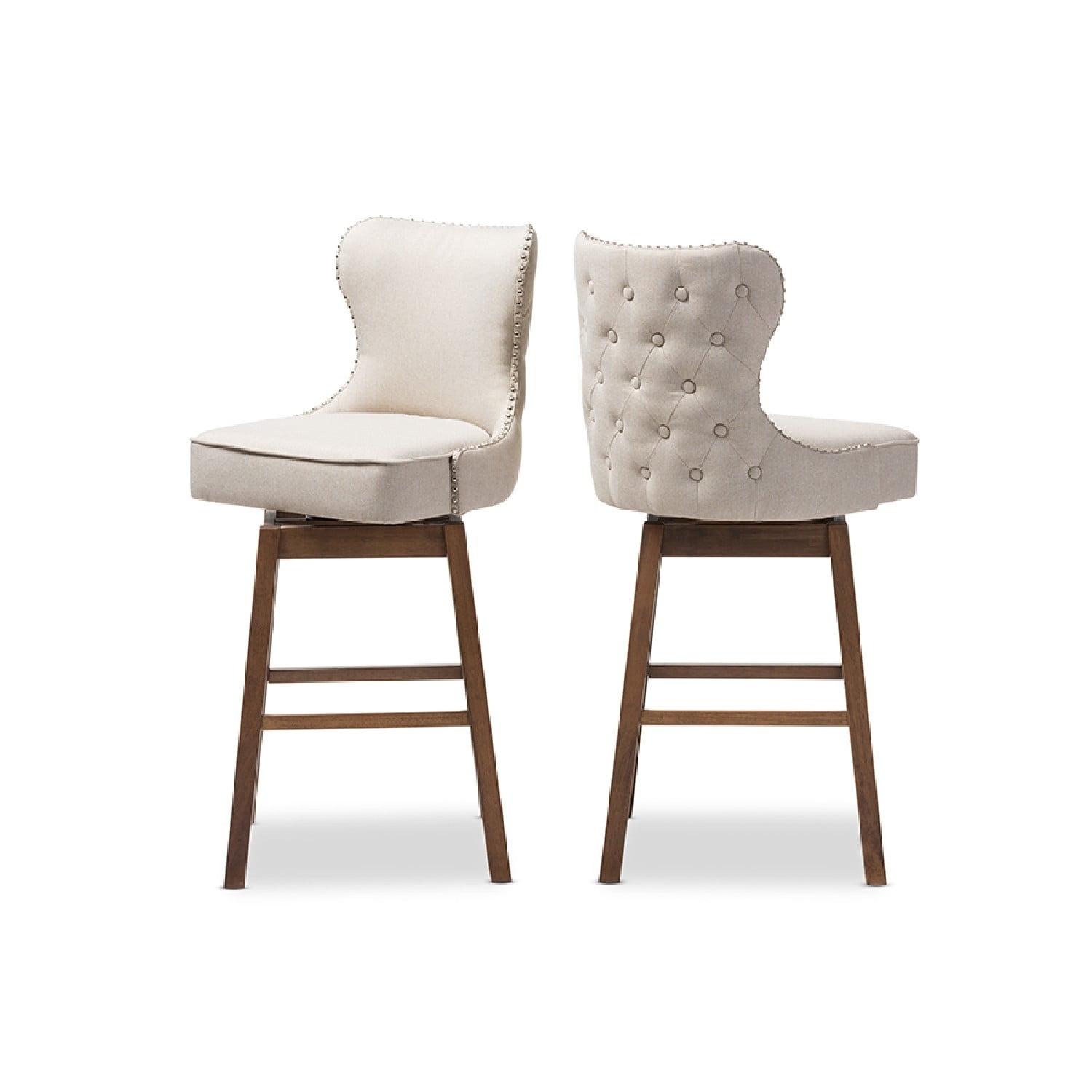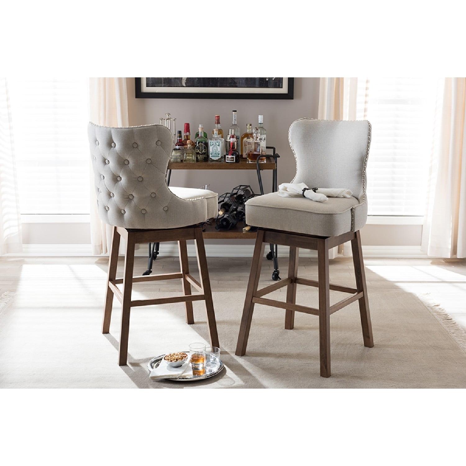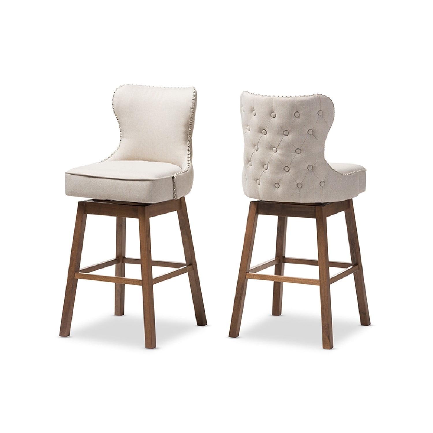 Baxton Studio Gradisca Modern and Contemporary Brown Wood Finishing and Light Beige Fabric Button-Tufted Upholstered Featuring modern and contemporary design, the Gradisca upholstered swivel barstool will be a perfect addition to your kitchen or bar counter. Constructed of solid rubber wood in dark walnut finishing, the barstool will be a nice addition for your warm and cozy kitchen and dining room. Button-tufting cut out backrest, couples with silver nail heads trim around the seat back adds a touch of modern and a little of glamour to this functional barstool. Fully upholstered in polyester fabric, the upholstered barstool is padded throughout for extra comfort. Sit and enjoy a glass of martini with your loved one after a long busy day for a little chit-chat, the Gradisca will instantly create a lovely ambience for the occasions. Made in Malaysia, the barstool requires assembly.