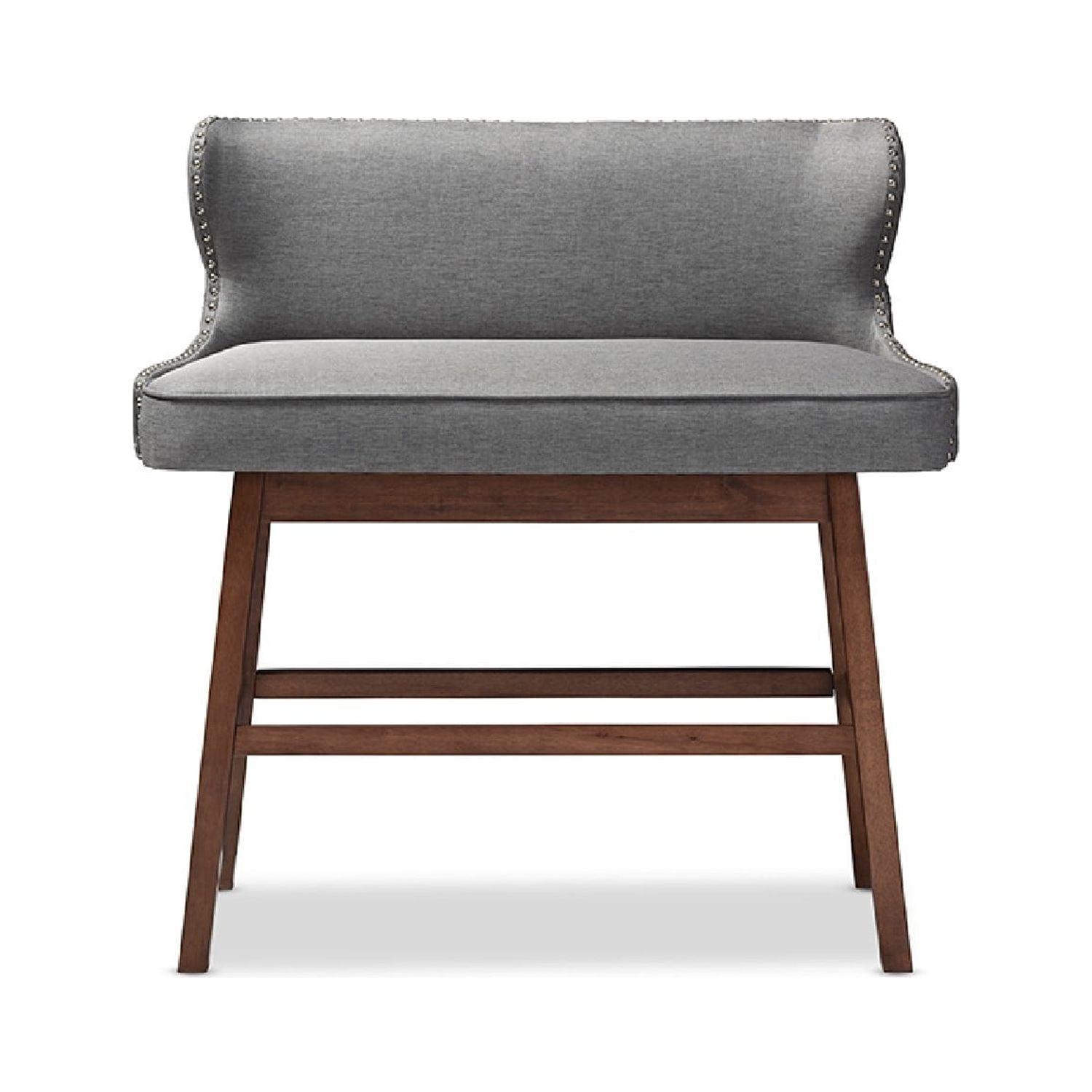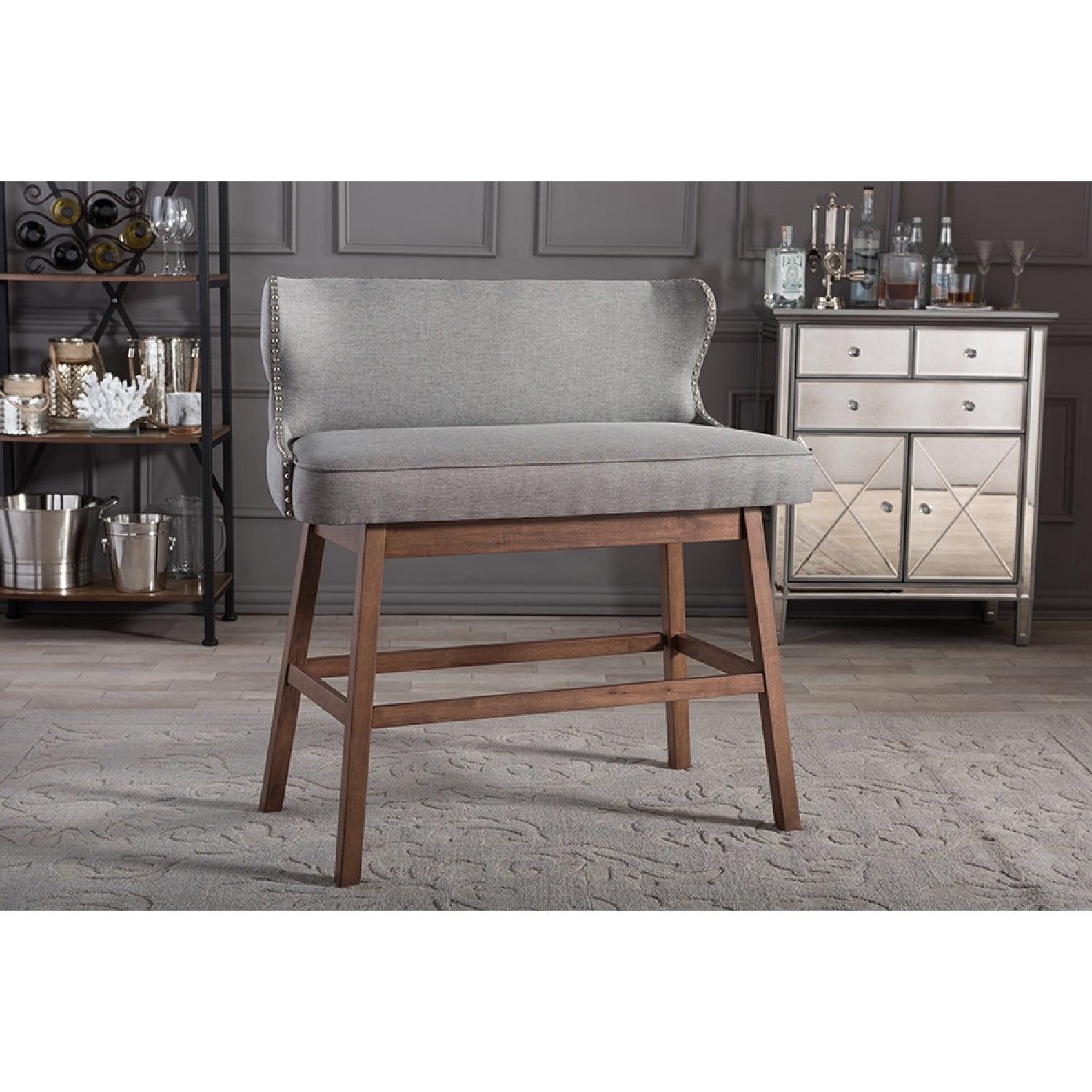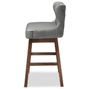Baxton Studio Gradisca Modern and Contemporary Grey Fabric Button-tufted Upholstered Bar Bench Banquette Featuring modern and contemporary design, the Gradisca Bar Bench will be a perfect addition to your kitchen or bar counter. Constructed of solid rubberwood in dark walnut finishing, the bar bench will be a nice addition for your warm and cozy kitchen and dining room. Button-tufting cut out backrest, couples with silver nail heads trim around the seat back adds a touch of modern and a little of glamour to this seating bench. Fully upholstered in polyester fabric, the seating bench is padded throughout for extra comfort. Sit and enjoy a glass of Martini with your loved one after a long busy day for a little chit-chat, the Gradisca will instantly create a lovely ambience for the occasions. Made in Malaysia, the bar bench requires assembly.