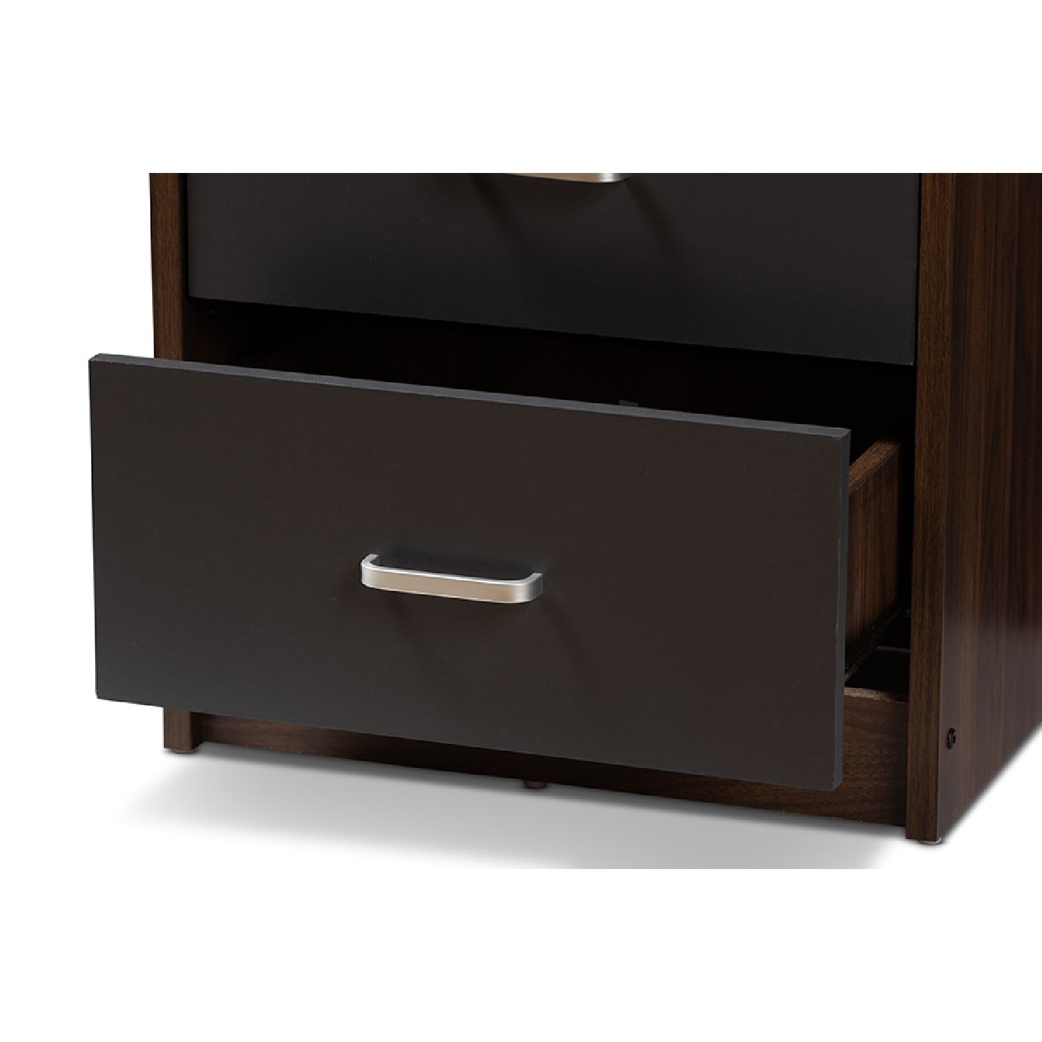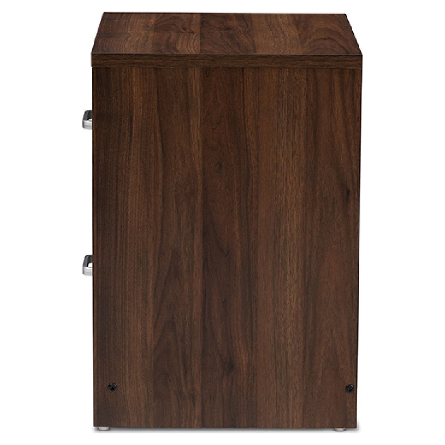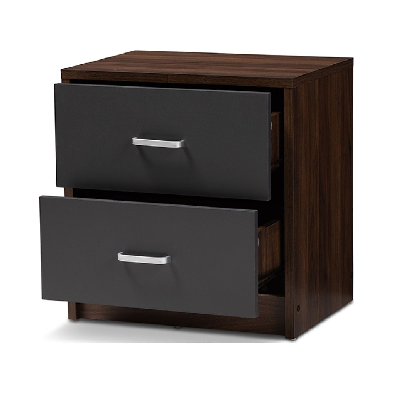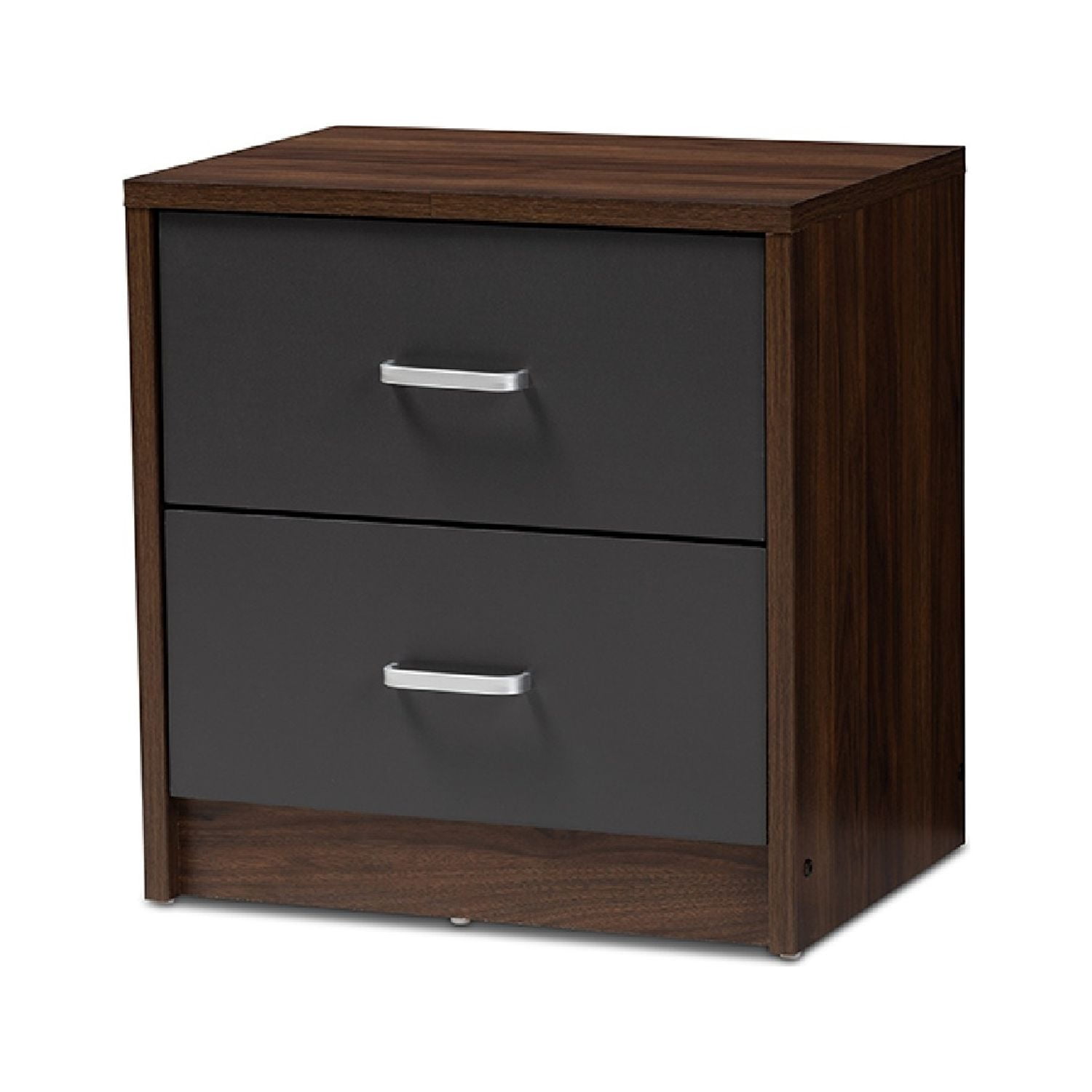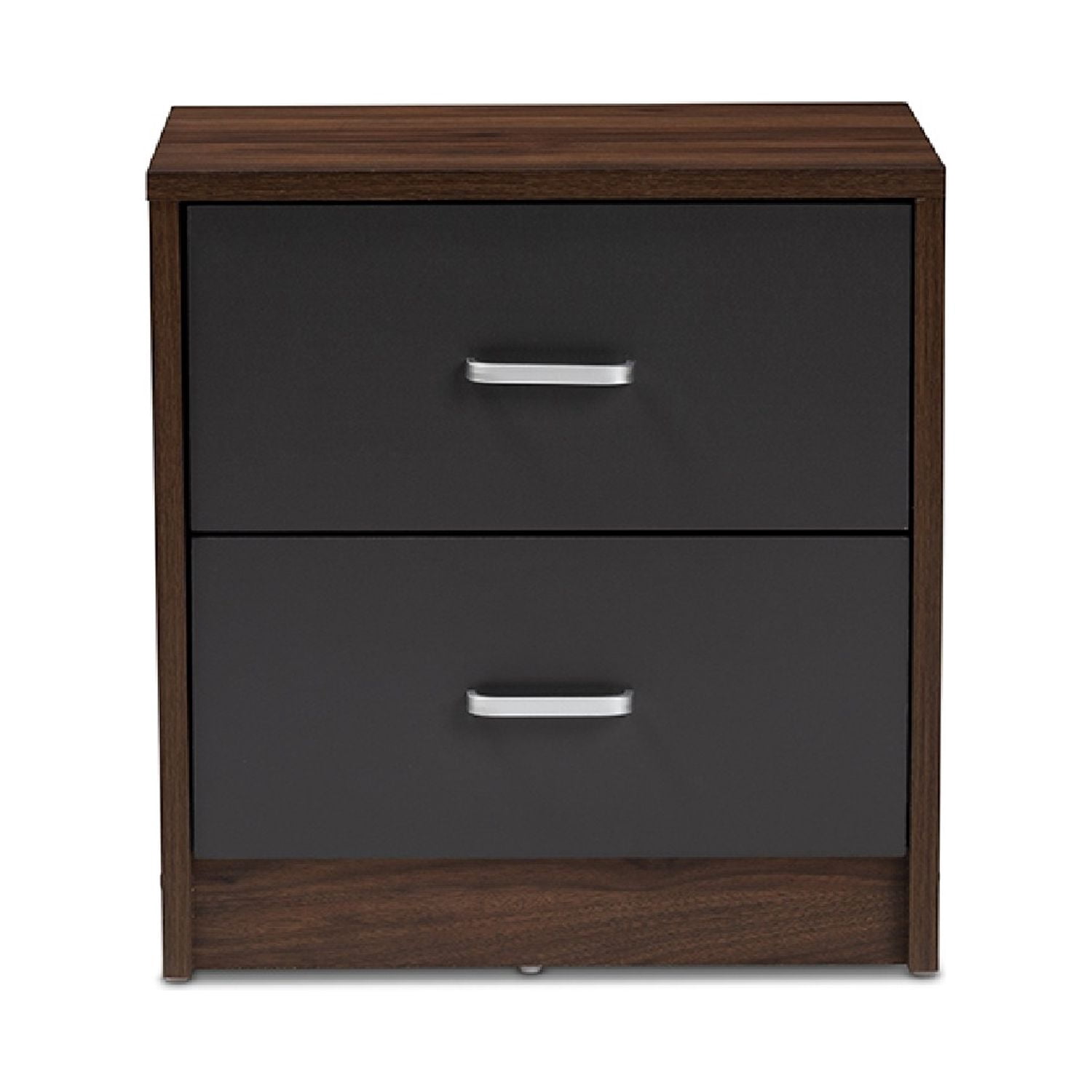 Baxton Studio Hansel Modern and Contemporary 2-Drawer Dark Brown and Dark Grey Finished Nightstand The handsome, minimalist Hansel 2-drawer nightstand will bring a striking presence to your bedside. The smooth, square silhouette is indicative of its modern and contemporary-inspired design. The Hansels engineered wood frame is finished in a dark brown, with the face of its drawer finished in dark grey for a two-tone look. The nightstand features two pull-out drawers for convenient bedside storage. The silver, powder-coated finished drawer handles sharply complement the brown and grey finish of the Hansel. Add a smart, executive vibe to your bedroom or guest room with this nightstand. Made in Malaysia, the Hansel requires assembly.