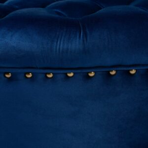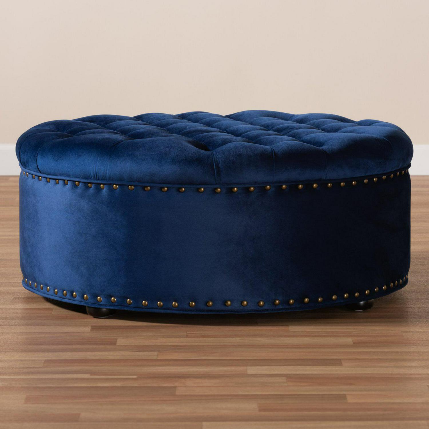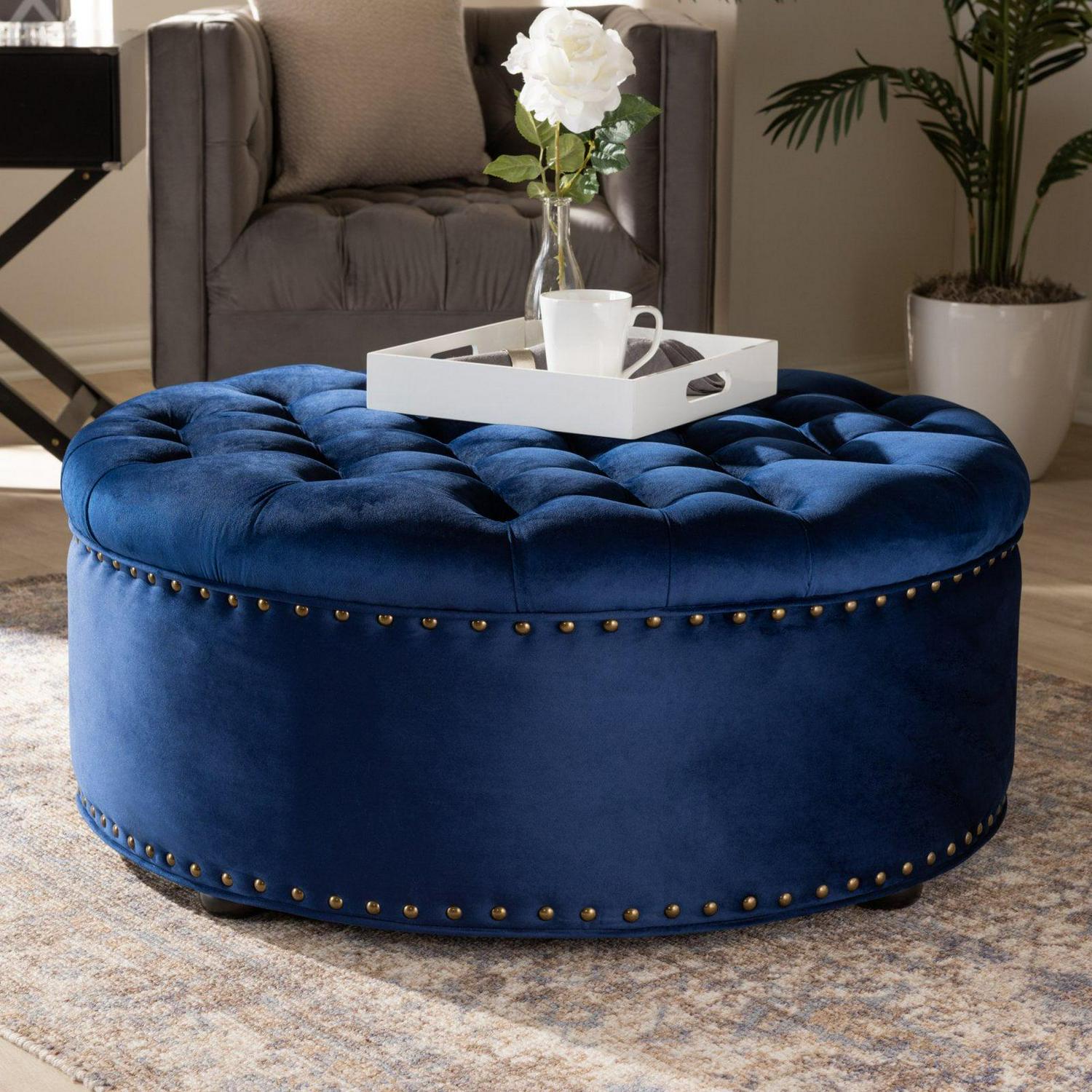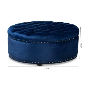 Break up that bare floor space with the Baxton Studio Iglehart Tufted Cocktail Ottoman. This round ottoman is a perfect complement for your tuxedo sofa, featuring a tufted top and nailhead studs. Solid eucalyptus wood constructs the frame, mounted on no-mark bun feet. The frame and top are cushioned with thick layers of dense foam, upholstered in polyester velvet. Choose your preferred color options from the available to best match your décor.