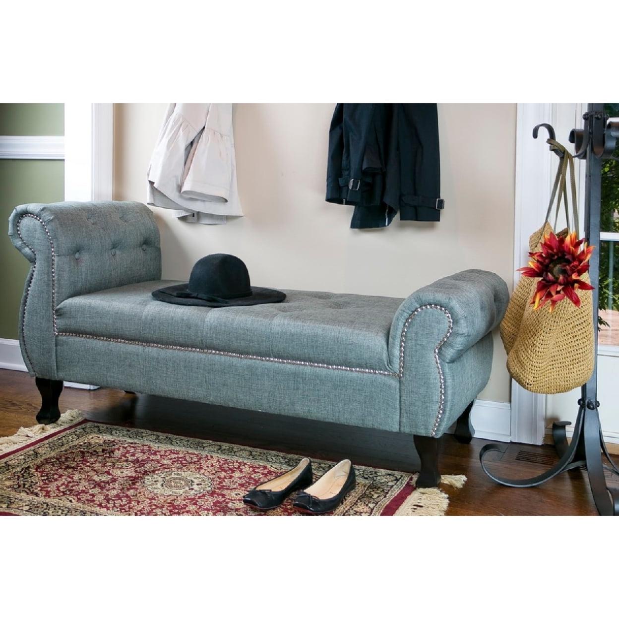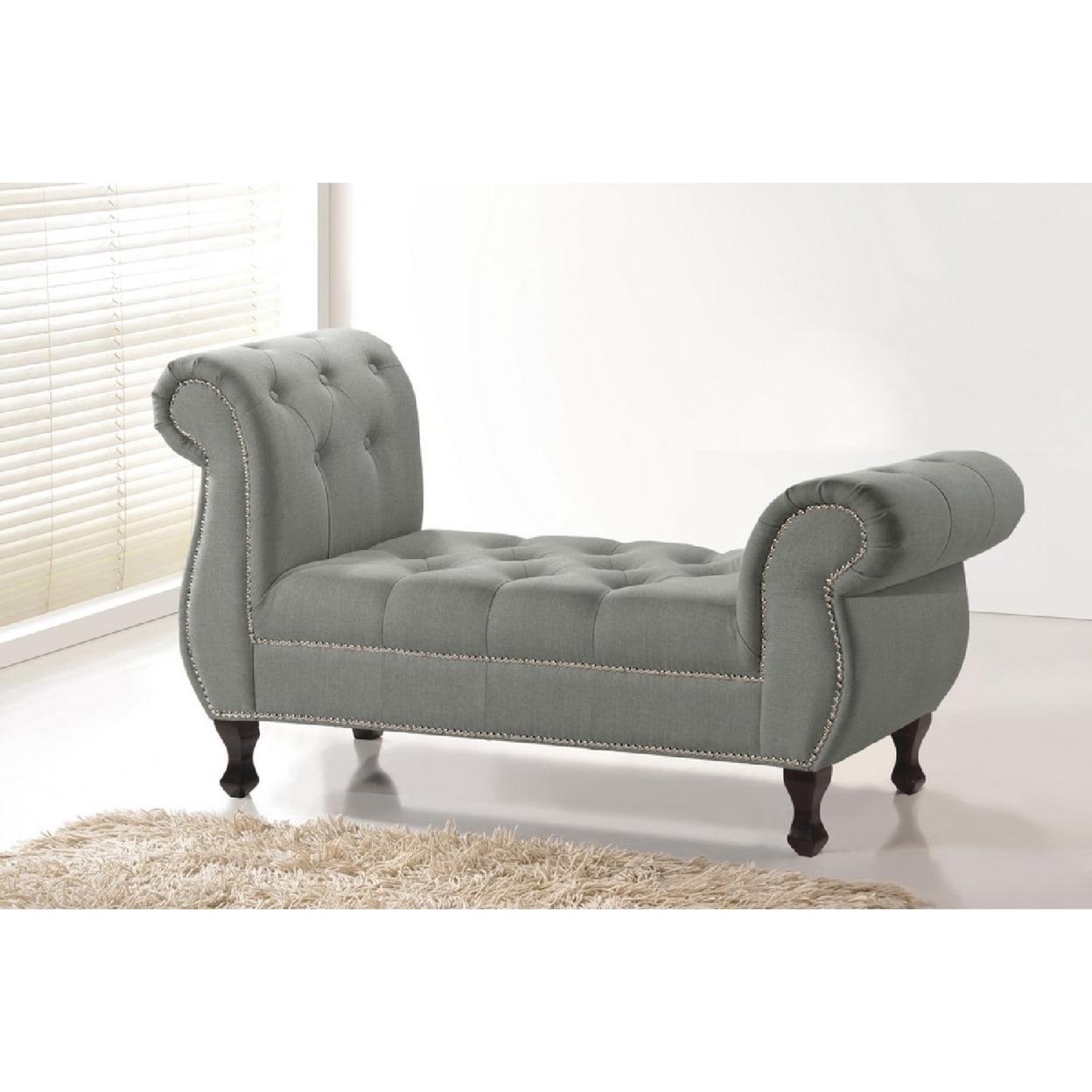 Baxton Studio Ipswich Grey Linen Bench Calling all discount-savvy divas! Enhance your bedroom with elegance and style. Boasting grey linen with silver nail head trim, smooth scroll arms and contrasting contoured black wood legs, our contemporary bedroom bench also emphasizes comfort with tufted seat, rubberwood frame and foam padding.