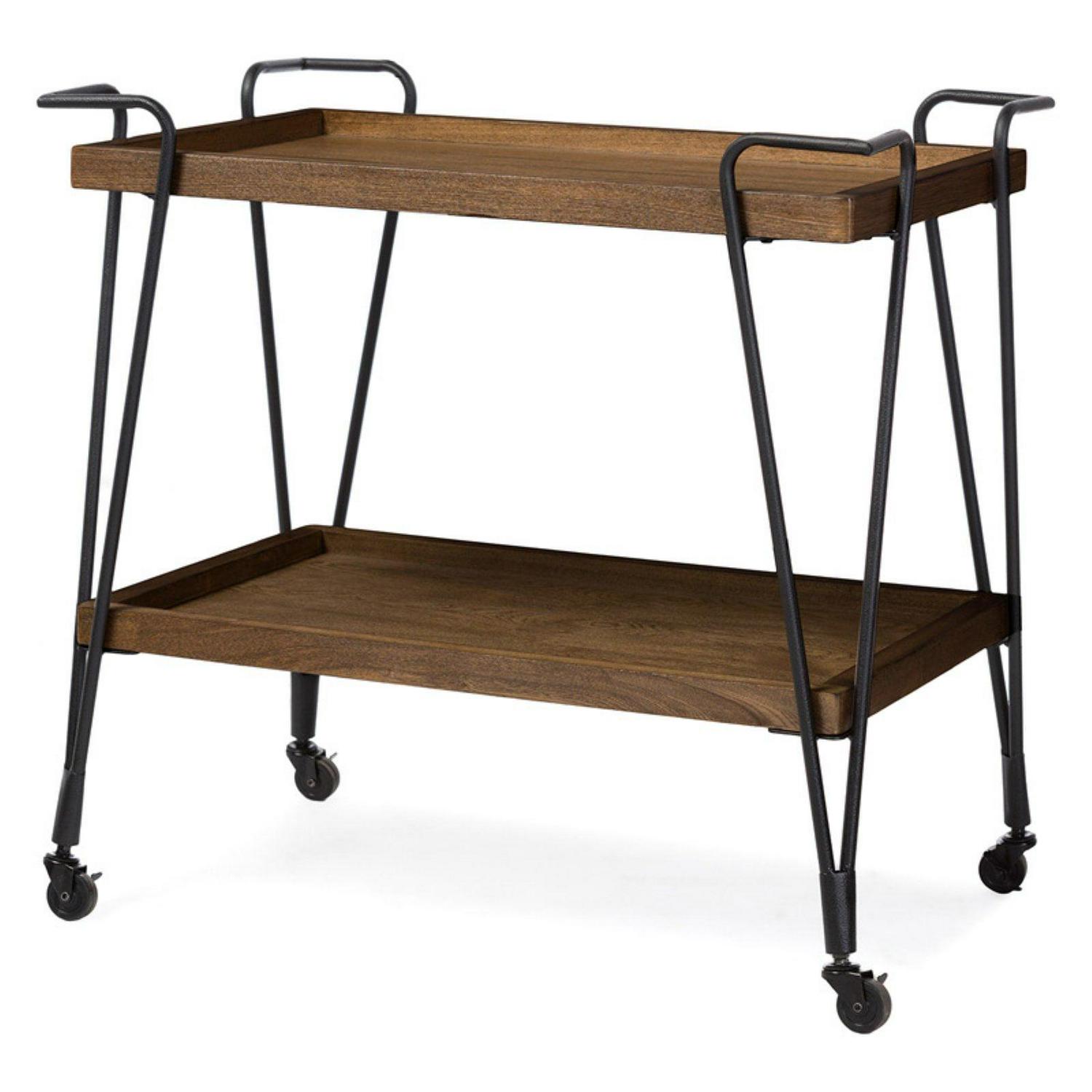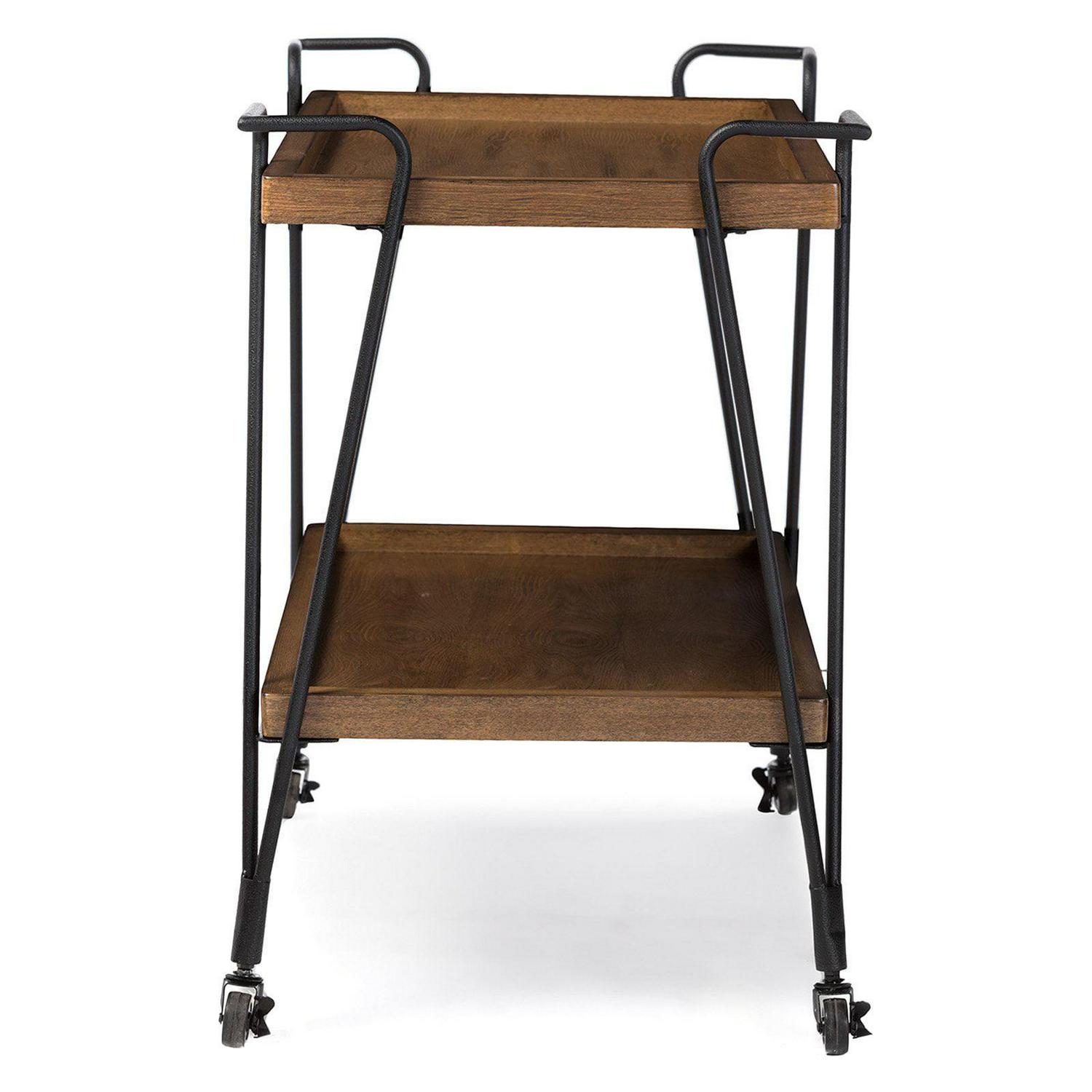 This industrial styled bar cart from Baxton Studio will spruce up any home or space. This cart features two fixed shelves to store glasses, bottles, drinks, or any accent items of your choice. The multi-functional uses of this cart will allow it to be used in the kitchen, dining room, or living room.