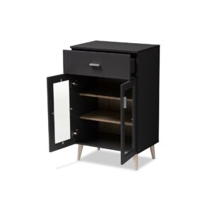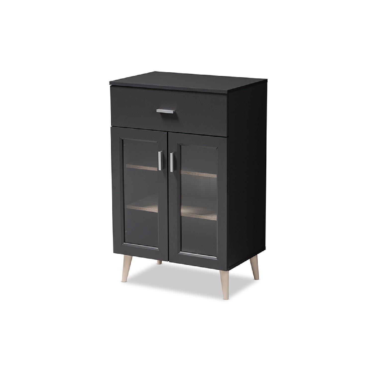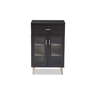 Baxton Studio Jonas Modern and Contemporary Dark Grey and Oak Brown Finished Kitchen Cabinet Youve coordinated your living rooms decor and honed your bedrooms aesthetic – now you can do the same for your kitchen with the Jonas kitchen cabinet. The modern and contemporary-inspired design of the cabinet emphasizes straight lines and solid colors. The Jonass engineered wood frame is finished in gray, with the legs and compartments finished in oak brown for a complementary, two-tone look. This kitchen cabinet features three shelf spaces behind glass paneled cabinet doors, which have tasteful, silver finished, powder-coated handles. The Jonas also features a convenient top drawer for storage, giving you a place to store utensils, table cloths, or anything in your kitchen and dining area that needs to be organized. This cabinet sits on four tapered legs, providing an under clearance area that is easier to clean. Have convenience, storage, and style in your kitchen or dining room with the Jonas kitchen cabinet. Made in Malaysia, the kitchen cabinet requires assembly.
