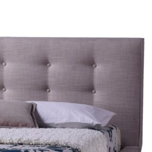 Great design is defined by it’s ability to communicate style with the smallest amount of effort, and that’s what characterizes the Jonesy Scandinavian Style Mid-century Beige Linen Fabric Upholstered Platform Bed. Clean minimal design in beautiful linen fabrics! Made from hardwood, plywood and engineered wood, the Jonesy bed frame was built to be as sturdy as it is beautiful. The focus of the Jonesy is on clean, uncomplicated rounded lines crafted with the minimal of fuss. Versatile and very much on trend! Button-tufting design on the headboard and the rounded shape of footboard and side rails add a touch of luxury and playfulness all at the same time. The natural finishing wood legs are tapered and skewed outward, balancing the overall mid-century look of this platform base bed frame. Made in Malaysia, the bed requires assembly.Hardwood, plywood frame and MDF slatsLeg: Solid rubberwoodFabric : Mix linen fabricFoam filledButton-tufting
