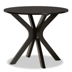 Dining set includes one (1) table and four (4) chairs Constructed from rubberwood, oak wood, and MDF wood Dark brown finish Upholstered in polyester fabric and padded with foam Round tabletop Splayed legs Assembly required