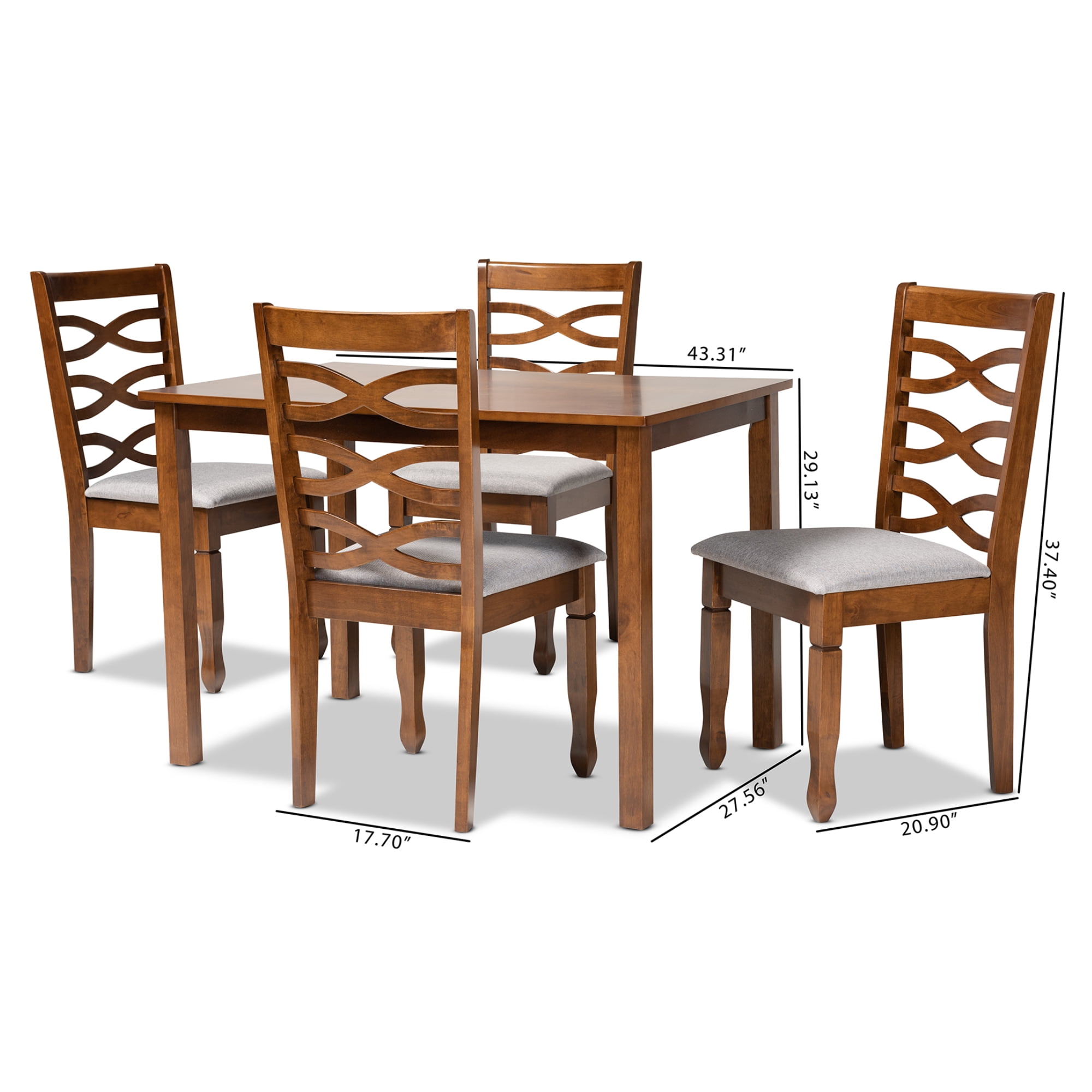 • Set includes four (4) dining chairs and one (1) table • Constructed from oak wood, rubberwood, and MDF wood • Walnut brown finish • Upholstered in polyester fabric and padded with foam • Cut-out back design • Rectangular tabletop • Assembly required • Product Weight: 92.48 Pound • Package Weight: 104.19 Pound • Table Dimensions: 29.13″ High x 43.31″ Wide x 27.56″ Deep; Chair Dimensions: 37.4″ high x 17.7″ wide x 20.9″ deep; Seating dimensions: 18.5″ wide x 16.1″ deep x 18.5″ high (from Floor); Back: 19.7″ high; Legs: 16.9″ high; • Product Color: Grey/Walnut Brown • Product Composition: Fabric “Polyester 100%”/Oak/Foam/Rubberwood/MDF