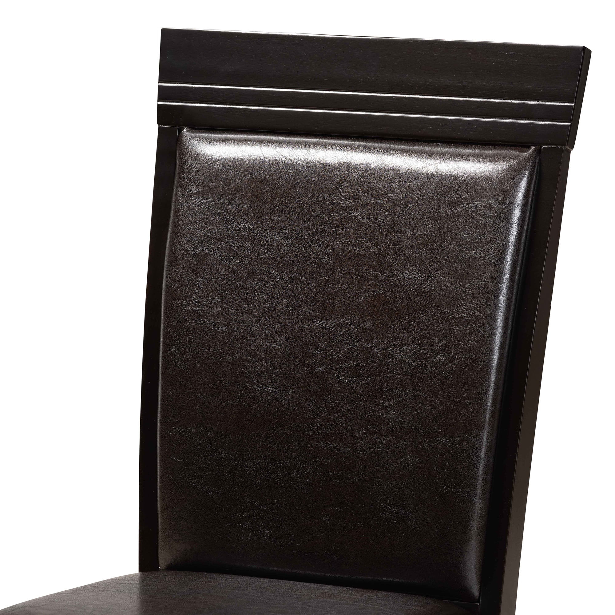 • Dining set includes one (1) table and four (4) chairs • Constructed from rubberwood and MDF wood • Dark brown finish • Upholstered in faux leather and padded with foam • Circular tabletop • Assembly required • Made in Malaysia • Product Weight: 72.78 Pound • Package Weight: 86.02 Pound • Dimension: Chair Dimensions: 38.19″ High x 17.13″ Wide x 14.96″ Deep; Seating Dimensions: 18.5″ High (from Floor) x 17.13″ Wide x 15″ Deep; Back: 19.69″ High; Legs: 16.54″ High; Table Dimensions: 29.9″ high x 35.4″ wide x 35.4″ deep; Legs: 29.1″ high; • Product Color: Dark Brown/Espresso Brown • Product Composition: Faux Leather/Solid Rubber Wood/MDF/Foam