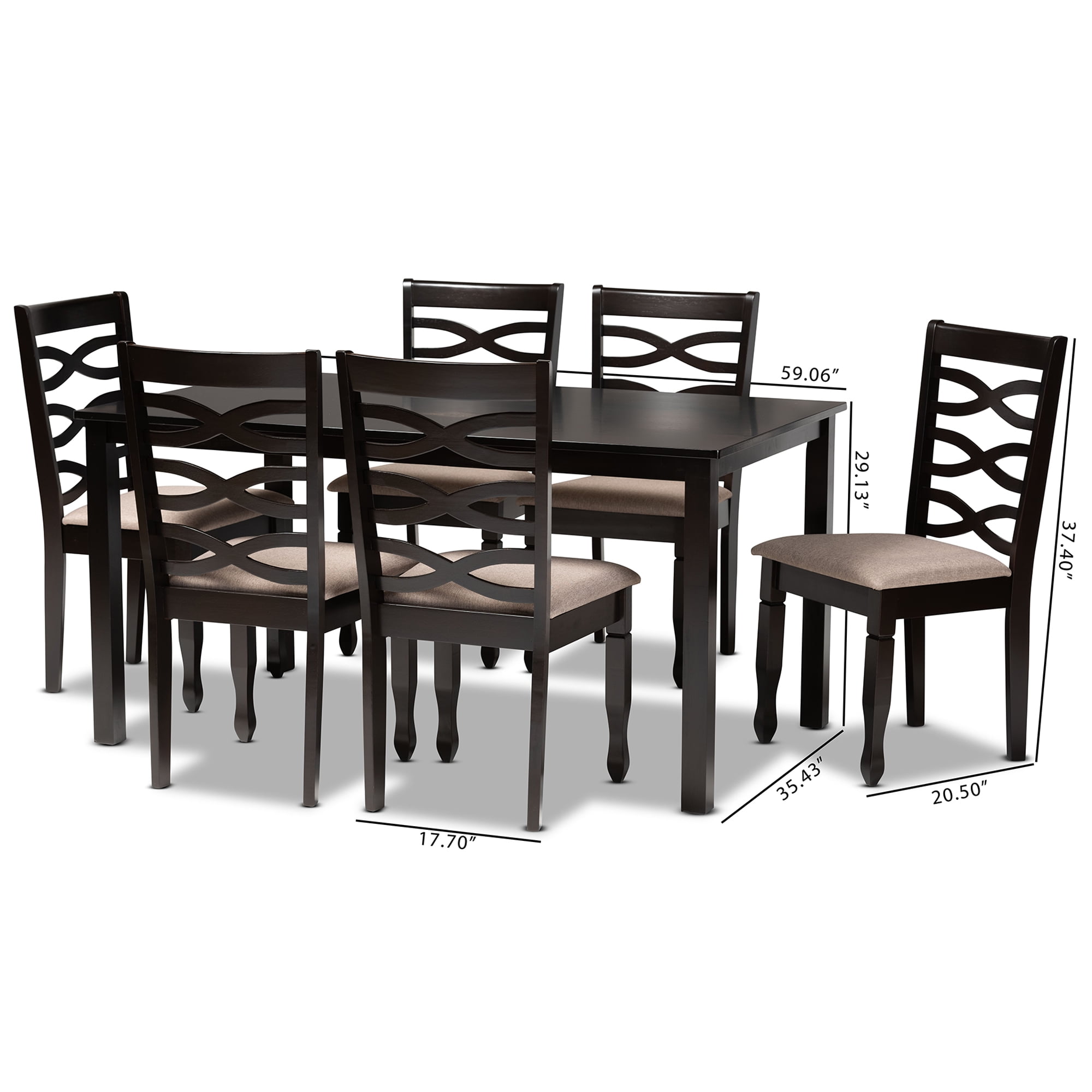 Elegant yet comfortable, the Lanier dining set is a timeless addition to any space. Constructed from wood in a dark brown finish, this dining set includes one table and six chairs, each upholstered in a light fabric that complements the dark wood finish. Designed with both comfort and style in mind, each chair features a plush foam-padded seat, as well as a striking cut-out design on its back. Tapered feet add a classic, refined touch. Equally enjoyable for both dinner parties and family dinners, the Lanier set is sure to enhance any dining experience. The Lanier dining set is made in Malaysia and requires assembly. Chair Dimensions: 37.4″ high x 17.7″ wide x 20.9″ deep; Seating dimensions: 18.5″ wide x 16.1″ deep x 18.5″ high (from Floor); Back: 19.7″ high; Legs: 16.9″ high; Table Dimensions: 29.13″ high x 59.06″ wide x 35.43″ deep; Legs: 28.35″ high;