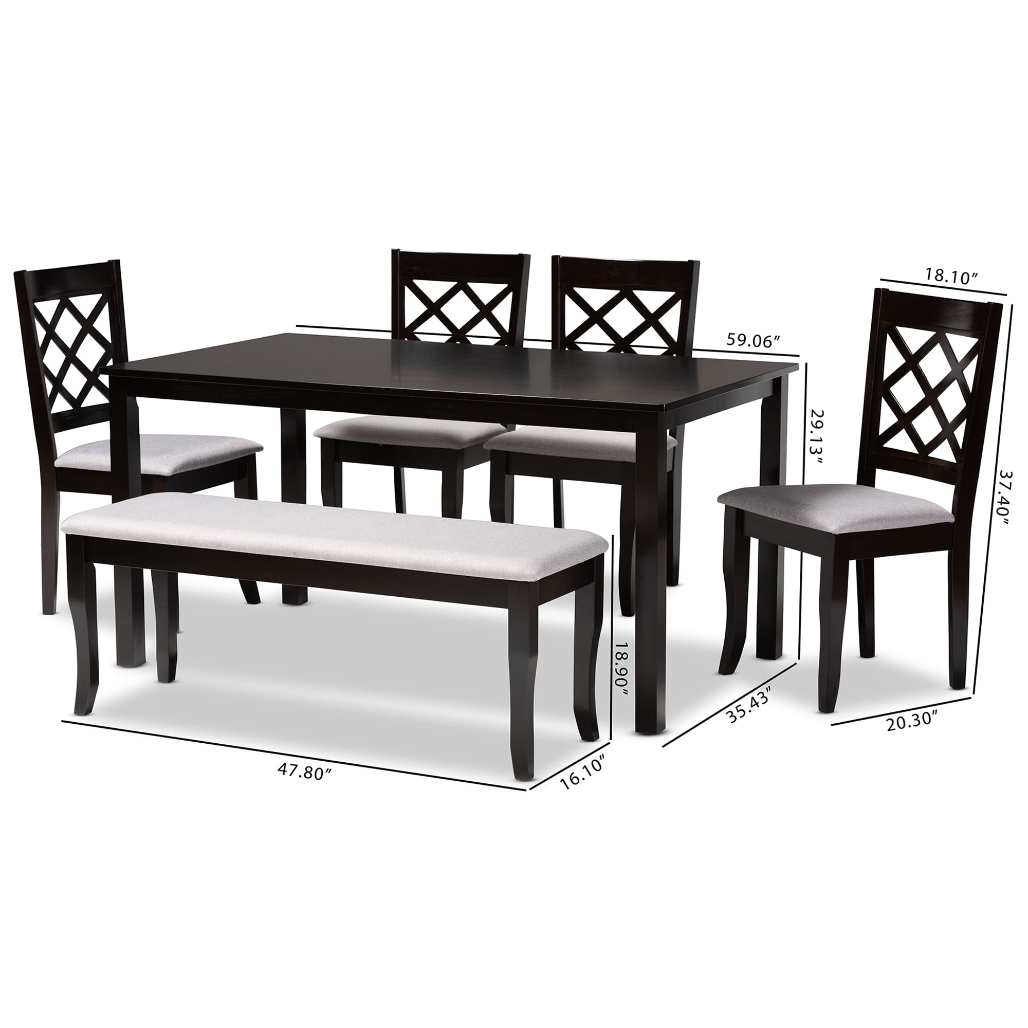 • Dining set includes one (1) table, one (1) bench, and four (4) chairs • Constructed from oak wood, rubberwood, and MDF wood • Dark brown finish • Upholstered in polyester fabric and padded with foam • Cabriole legs • Rectangular tabletop • Assembly required • Product Weight: Pound • Package Weight: 137.82 Pound • Dimension: Chair Dimensions: 37.4″ High x 18.1″ Wide x 20.3″ Deep; Seating Dimensions: 17.9″ High (from Floor) x 18.7″ Wide x 15.7″ Deep; Back: 19.5″ High; Legs: 16.9″ High; Bench Dimensions: 18.9″ high x 47.8″ wide x 16.1″ deep; Seating dimensions: 47.8″ wide x 16.1″ deep x 18.9″ high (from Floor); Legs: 16.9″ high;; Table Dimensions: 29.13″ high x 59.06″ wide x 35.43″ deep; Legs: 28.35″ high; • Product Color: Grey/Dark Brown • Product Composition: Fabric Linen “Polyester 100%”/Fabric “Polyester 100%”/Solid Rubber Wood/Oak/MDF/Foam
