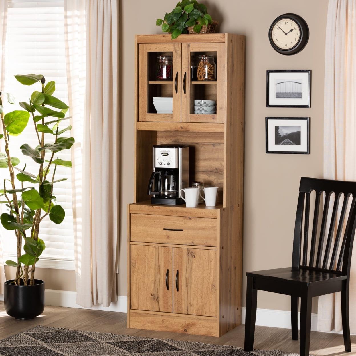 Baxton Studio Laurana Modern and Contemporary Oak Brown Finished Wood Kitchen Cabinet and Hutch The simple yet elegant design of the Laurana cabinet organizes your kitchen in modern style. Made in Malaysia, this cabinet is constructed from solid wood featuring a natural oak brown finish that easily coordinates with modern interiors. A total of four shelves located behind the doors of the Laurana provide space for large cookware, while one large drawer easily organizes kitchen utensils. Requiring assembly, the Laurana features a circular opening in its back panel for convenient cord management of a microwave, coffee maker, and other appliances. With ample space for both storage and display, the Laurana cabinet is a superb addition to the modern home.