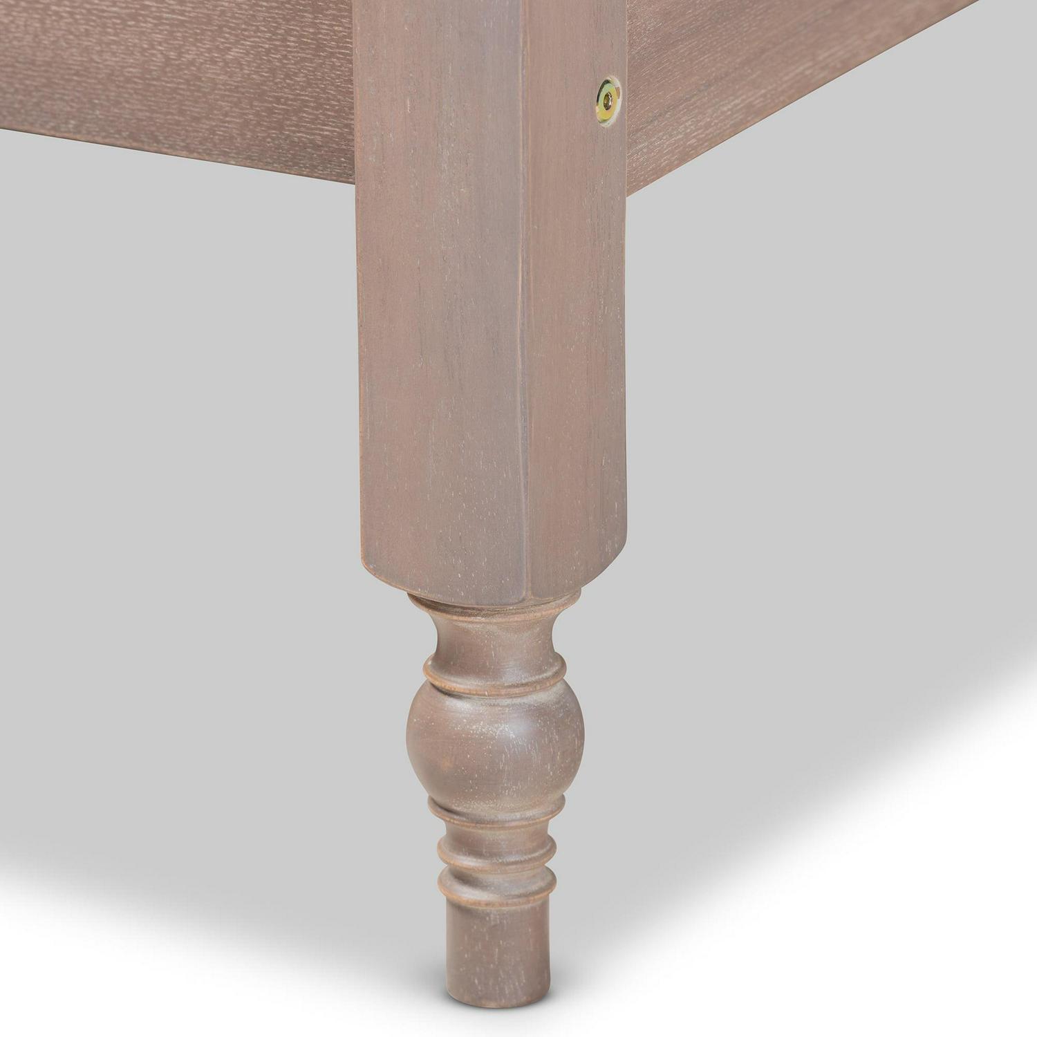 Beauty and comfort abound in the Laure bed frame. Crafted from wood, the Laure features an aged oak finish for an antique look. Its low platform provides a casual feel, while stepped detailing and turned legs lend timeless elegance. Add some pillows and a plush duvet to create a cozy retreat. This bed includes wood slats, which eliminate the need for a box spring. The Laure bed frame is made in Malaysia and requires assembly.