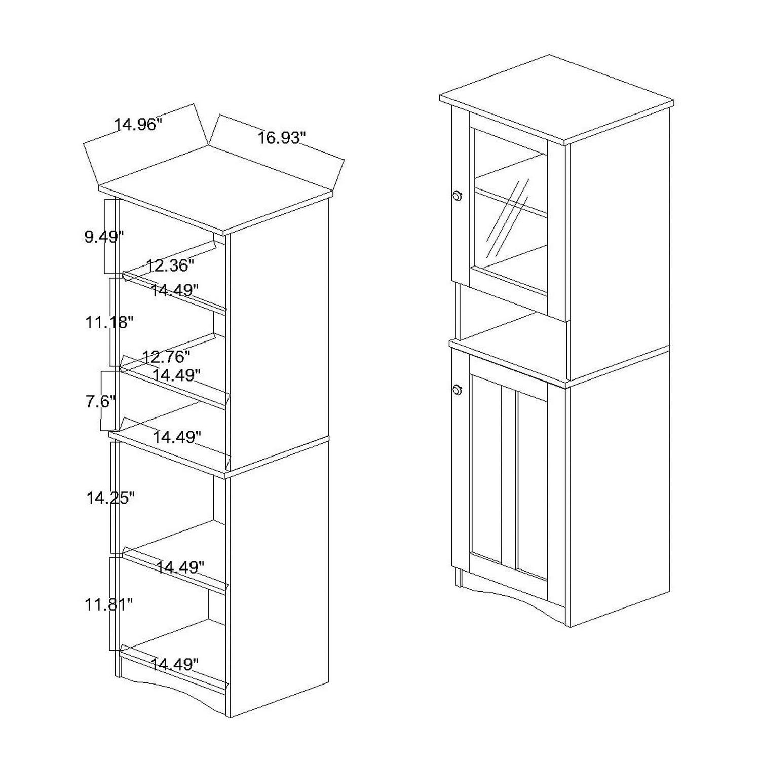 – Overall Dimensions: 62.40″ High x 16.93″ Wide x 14.96″ Deep; Top shelf behind glass door: 9.49″ High x 14.49″ Wide x 12.36″ Deep; Bottom shelf behind glass door: 11.18″ High x 14.49″ Wdie x 12.76″ Deep; Open shelf: 7.60″ High x 14.49″ Wide x 12.76″ Deep; Top shelf behind lower door: 14.25″ High x 14.49″ Wide x 12.76″ Deep; Bottom shelf behind lower door: 11.81″ High x 14.49″ Wide x 12.76″ Deep
