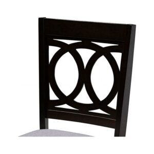 Baxton Studio Lenoir Modern and Contemporary Gray Fabric Upholstered Espresso Brown Finished Wood 5-Piece Dining Set A fusion of traditional design elements and modern craftsmanship make the Lenoir 5-piece dining set a stunning addition to any dining space. Constructed from solid rubberwood in an espresso finish, this dining set includes one table and four chairs, each upholstered in a light polyester fabric that complements the dark wood finish. Padded with foam for the utmost comfort as you enjoy long dinners, each chair features a striking cut-out design on its back for enhanced visual appeal. Comfortable and stylish, the Lenoir set is sure to elevate any dining experience. The Lenoir 5-piece dining set is made in Malaysia and requires assembly.