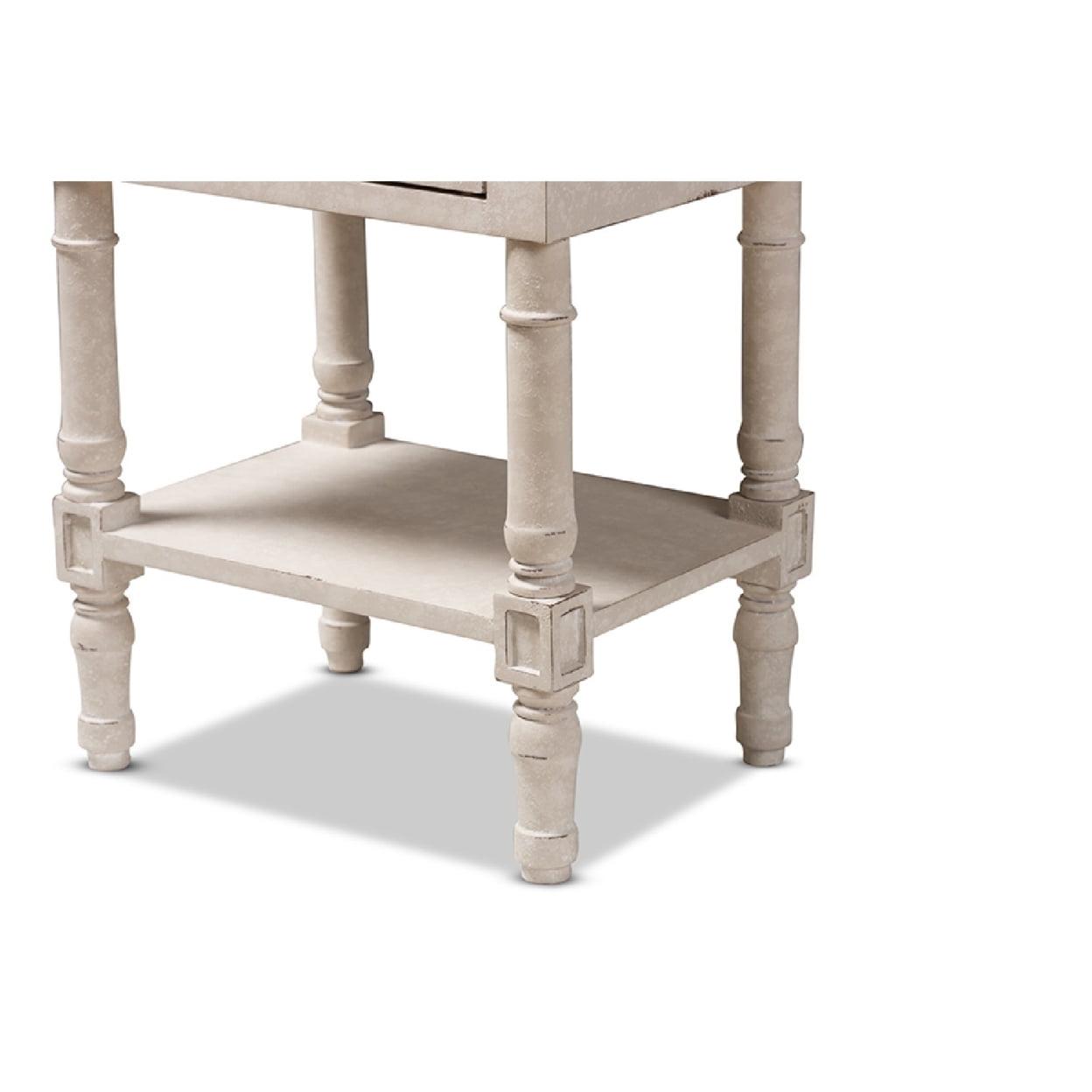 Baxton Studio Lenore Country Cottage Farmhouse Whitewashed 2-Drawer Nightstand The Lenore 2-drawer nightstand will add an element of romance to your bedside with its ornate ball-turned details and refreshing whitewashed finish. The country cottage and farmhouse-inspired design is evident in the amount of detail put into this nightstand. The Lenore features two pull-out drawers and one bottom shelf for convenience. Charming, dark bronze finished drawer pulls give the nightstand a bit of antique style. The Noemie is easy to coordinate with a wide range of styles, including French, rustic, farmhouse, and provincial-inspired decor. Add the Lenore to your guest room to delight visitors, or keep it for yourself in your own bedroom. Made in Indonesia, the nightstand requires assembly.