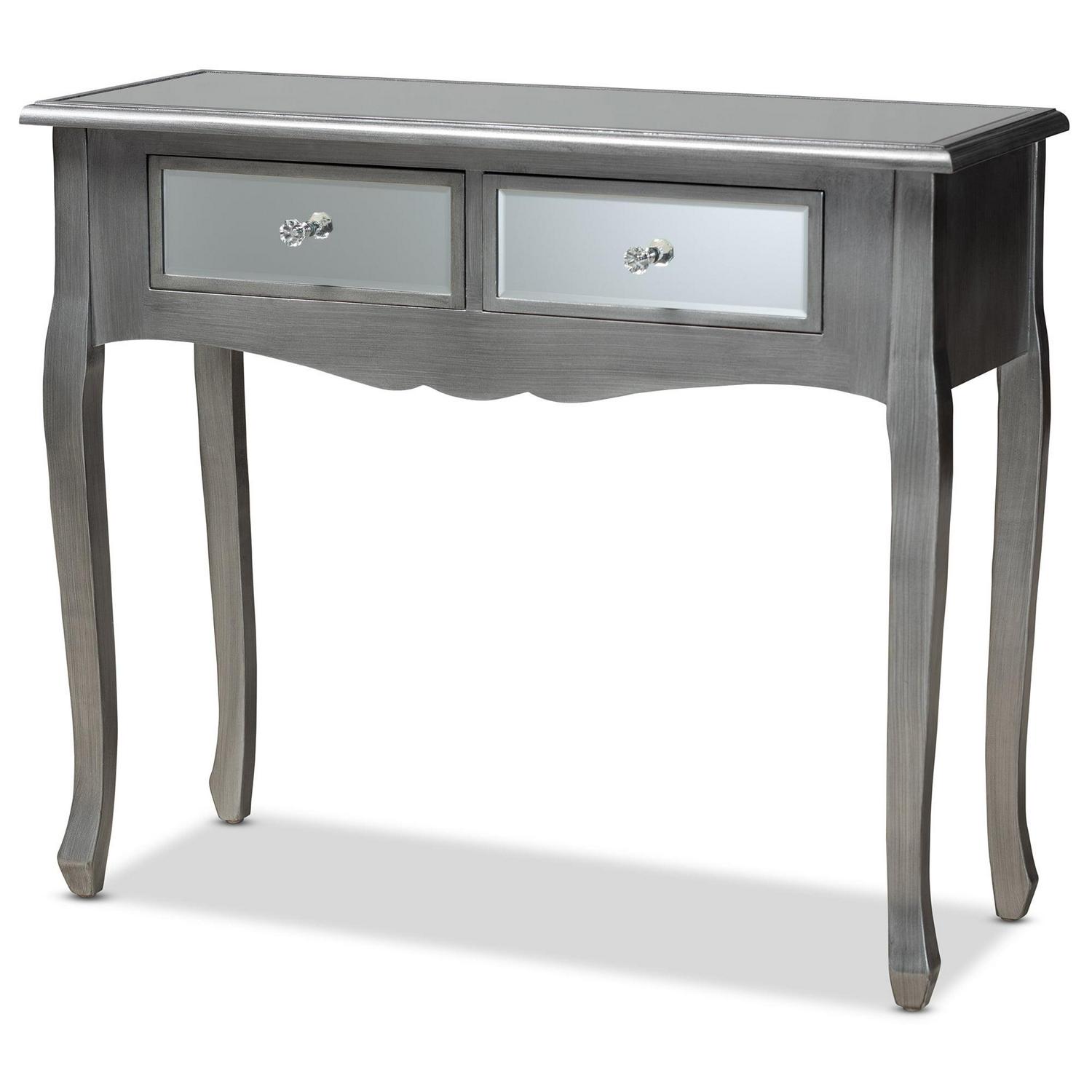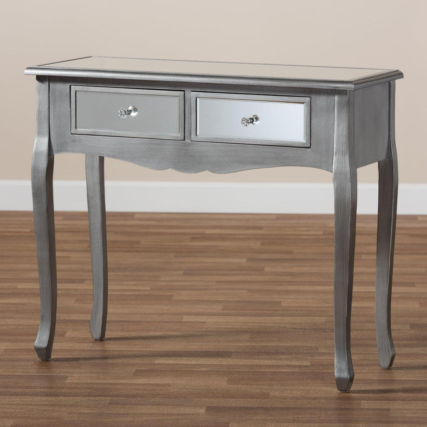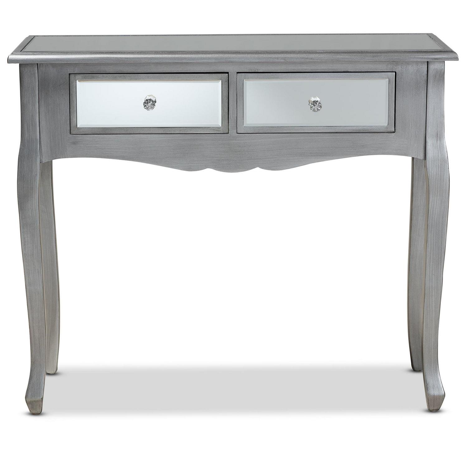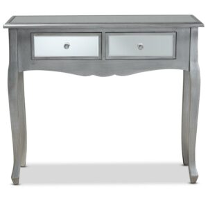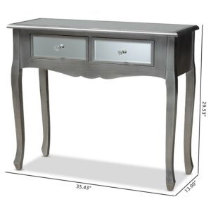 Baxton Studio Leonie Modern Transitional French Brushed Silver Finished Wood and Mirrored Glass 2-Drawer Console Table