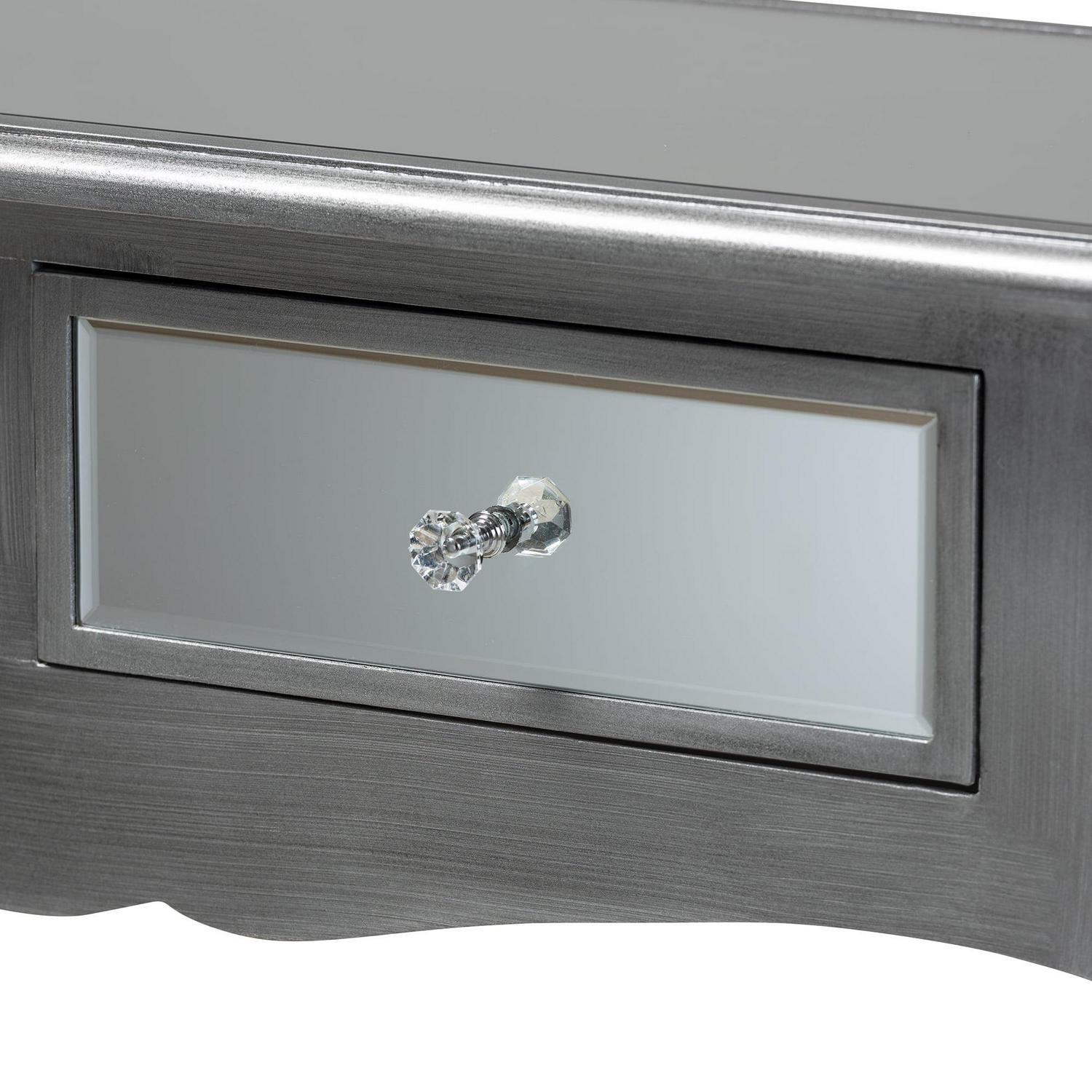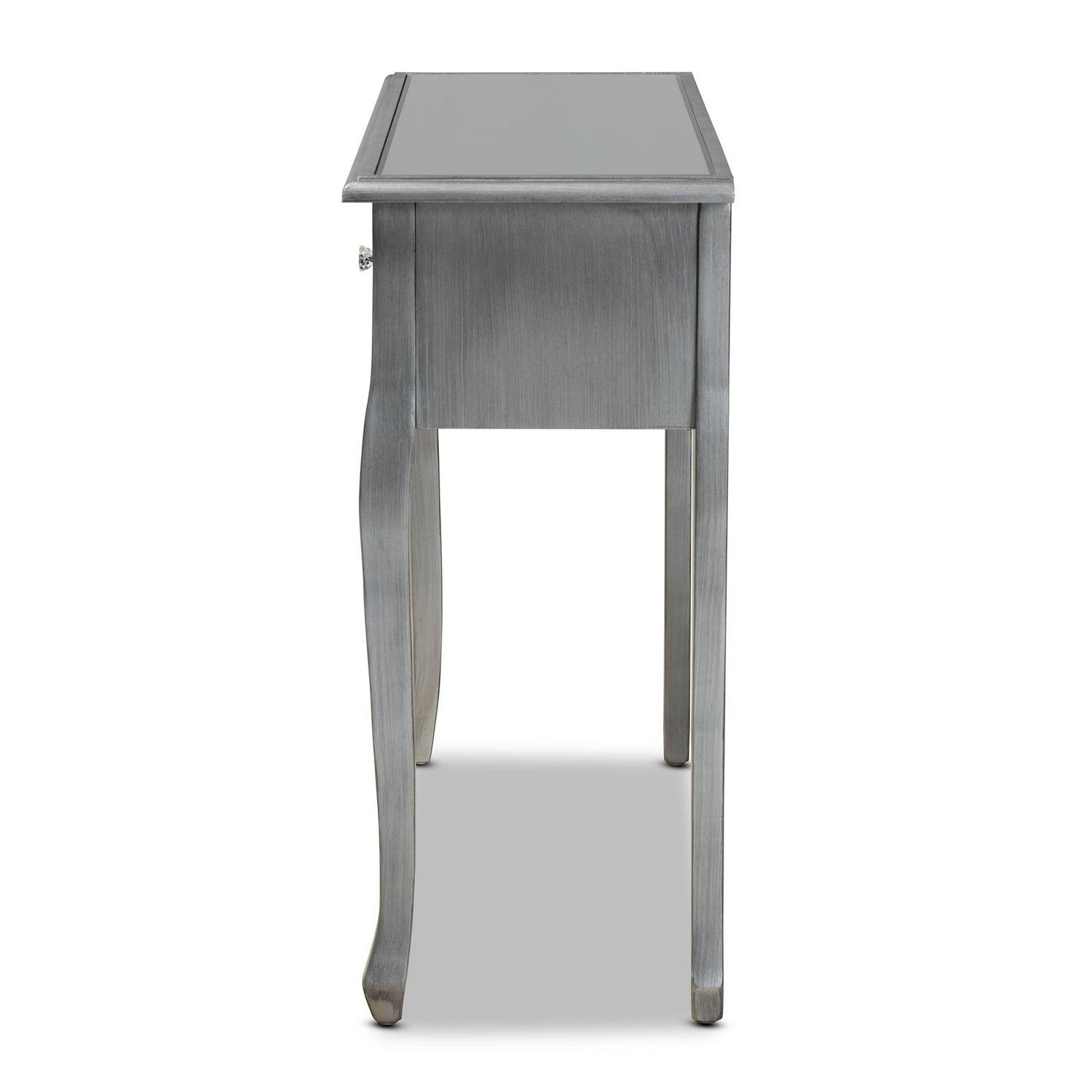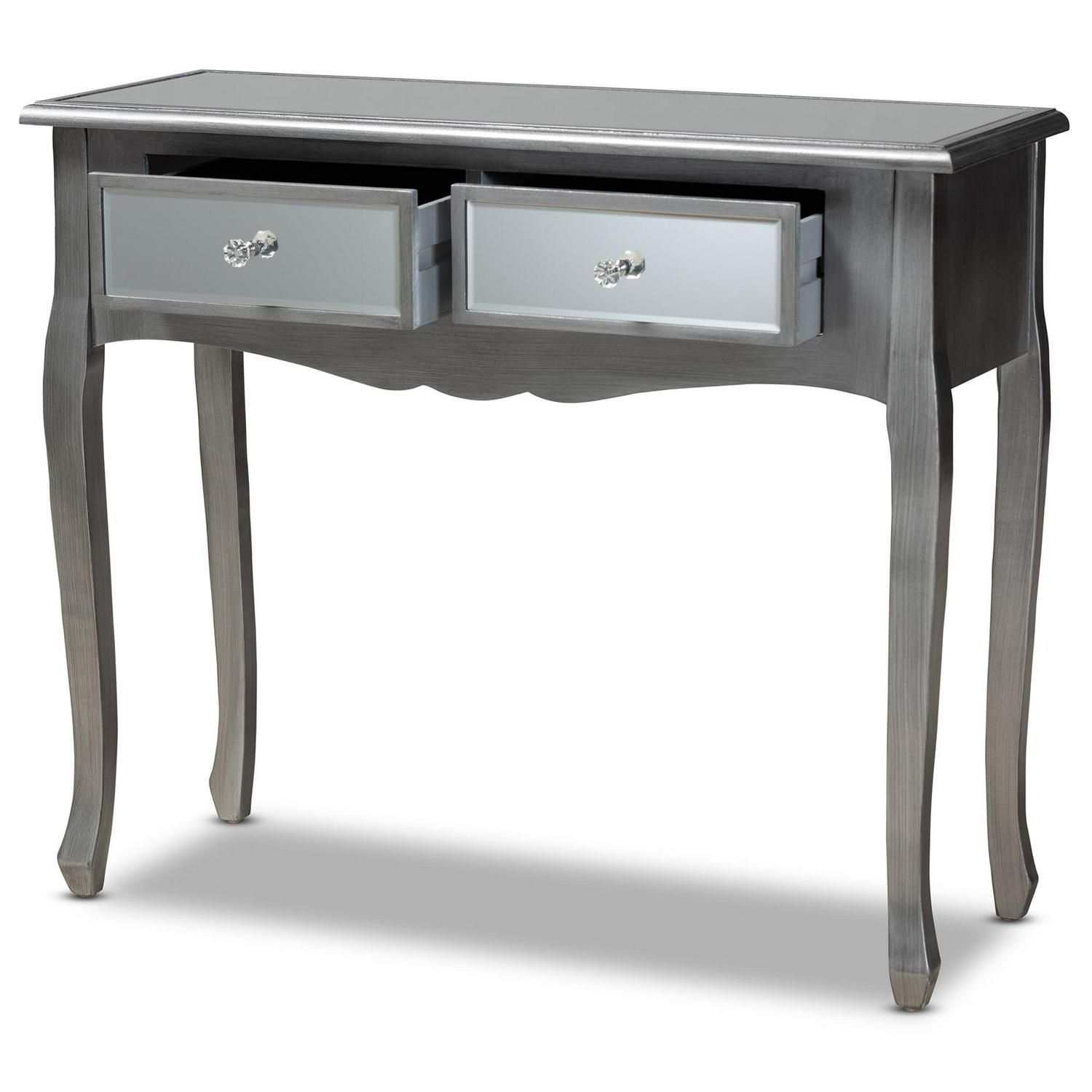 Baxton Studio Leonie Modern Transitional French Brushed Silver Finished Wood and Mirrored Glass 2-Drawer Console Table