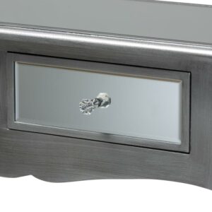 With its stunning metallic tones, the Leonie console table brings a touch of glamour to any space. This sturdy wood table displays a brushed silver finish that gives a cool, contemporary update to its classic French-inspired silhouette. Two drawers provide space to store keys, bills, and more. Mirrored glass on the drawers and tabletop magnificently capture and reflect the surrounding light within the room. Crystal knobs and cabriole legs lend an extra touch of glam. The Leonie console table is made in China and requires assembly.