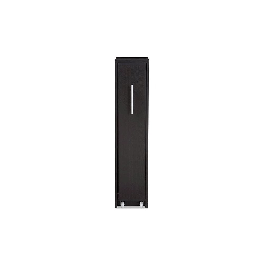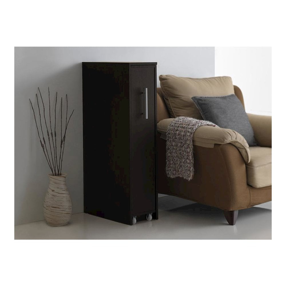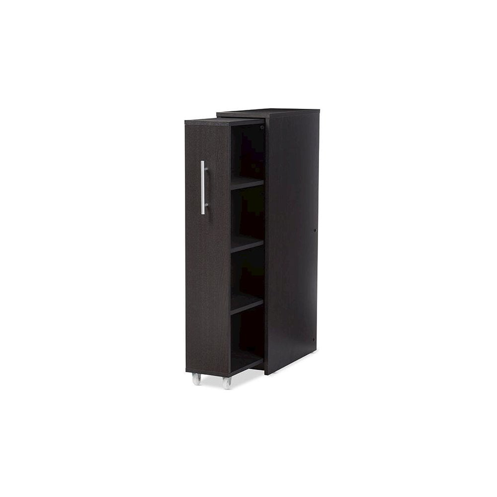 Featuring modern and contemporary design, this fantastic Lindo Dark Brown Wood Bookcase with One Pulled-out Door Shelving Cabinet combines smart storage ideas with style. Constructed of engineered wood, this dark espresso brown bookcase features a pulled door with hidden shelving space. The casters underneath the shelving unit allows flexible pulling out when need be and pulling in when the bookcase is not in. The cabinet helps to keep your books, DVD, CDs and comics out of sight while providing a space saving solution for modern living. To ease the pulling in and out, the pulled-out cabinet comes with a stainless steel handle to add modern look. This mobile book shelf or cabinet could be placed on the side of your couch for easy access or placed by your desk for everyday use. Made in Malaysia, the Lindo requires assembly. Features: Modern and contemporary Materials: Engineered wood, Faux wood grain veneer, stainless steel hardware, castors Bookcase comes with 1-pulled out door with shelving space. Each pulled-out cabinet comprises of 4 storage shelves for books, comics, DVD and CD Paperback book -about 48 books per shelf; Comic -About 90 books per shelf; CD About 35 pieces per stay; DVD about 30 pieces per shelf Small space solution – the bookcase units could be placed by the seating area or by the study desk for easy access. Top of the bookcase could be used for displaying photo frames or other accessories