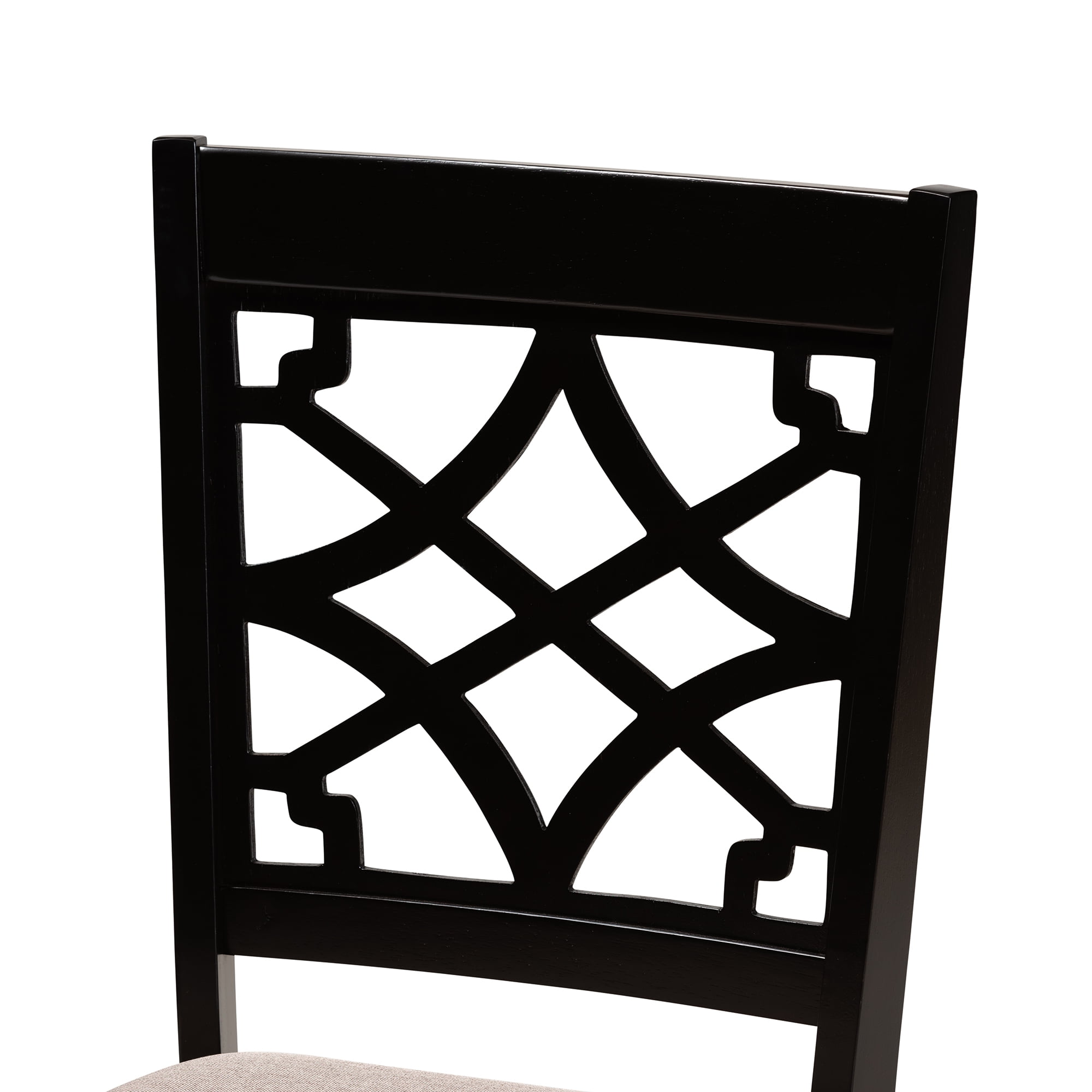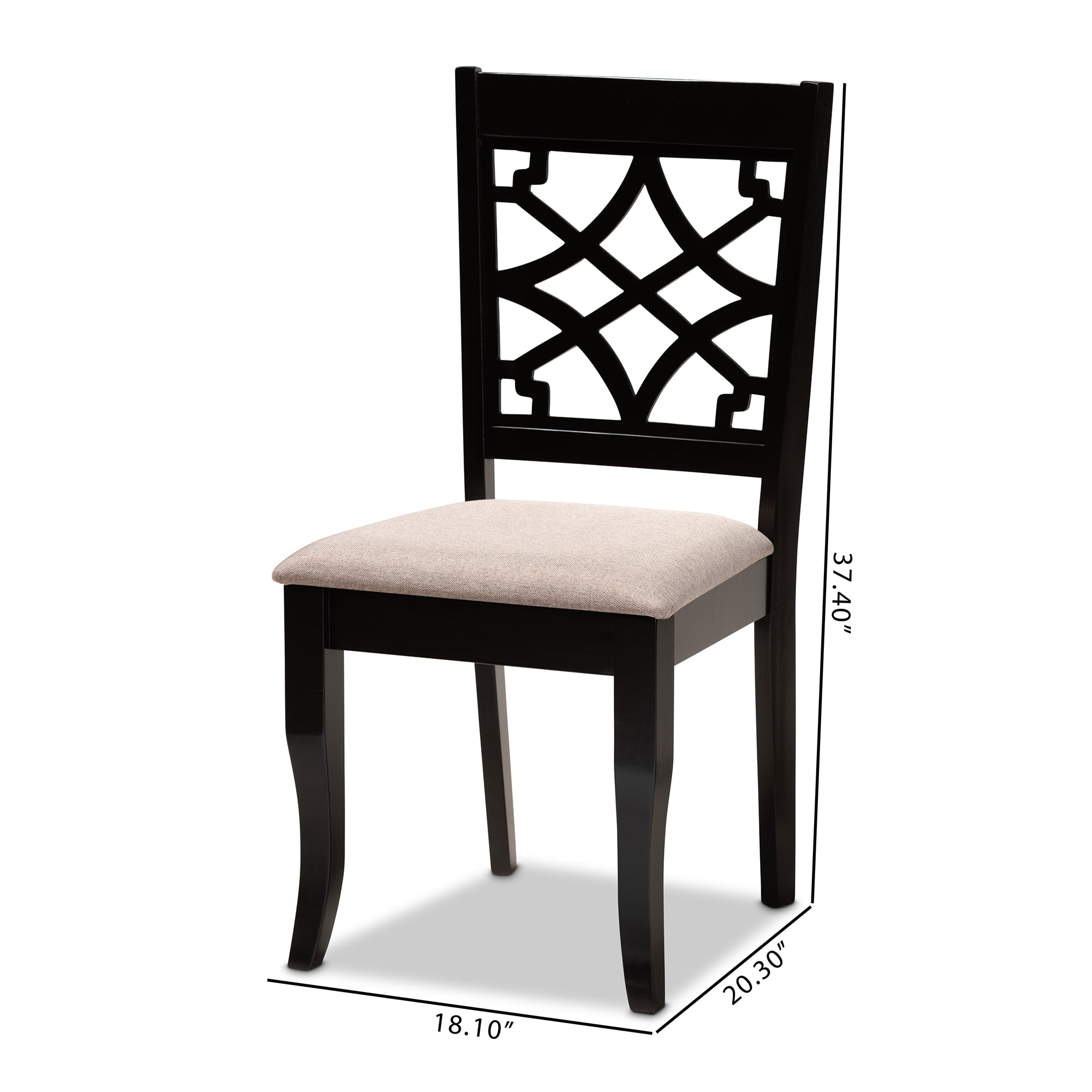 Baxton Studio Mael Modern and Contemporary Sand Fabric Upholstered and Espresso Brown Finished Wood 2-Piece Dining Chair Set: Set includes two (2) dining chairs Constructed from oak wood Espresso brown finish Upholstered in polyester fabric and padded with foam Cut-out back design Saber legs Assembly required