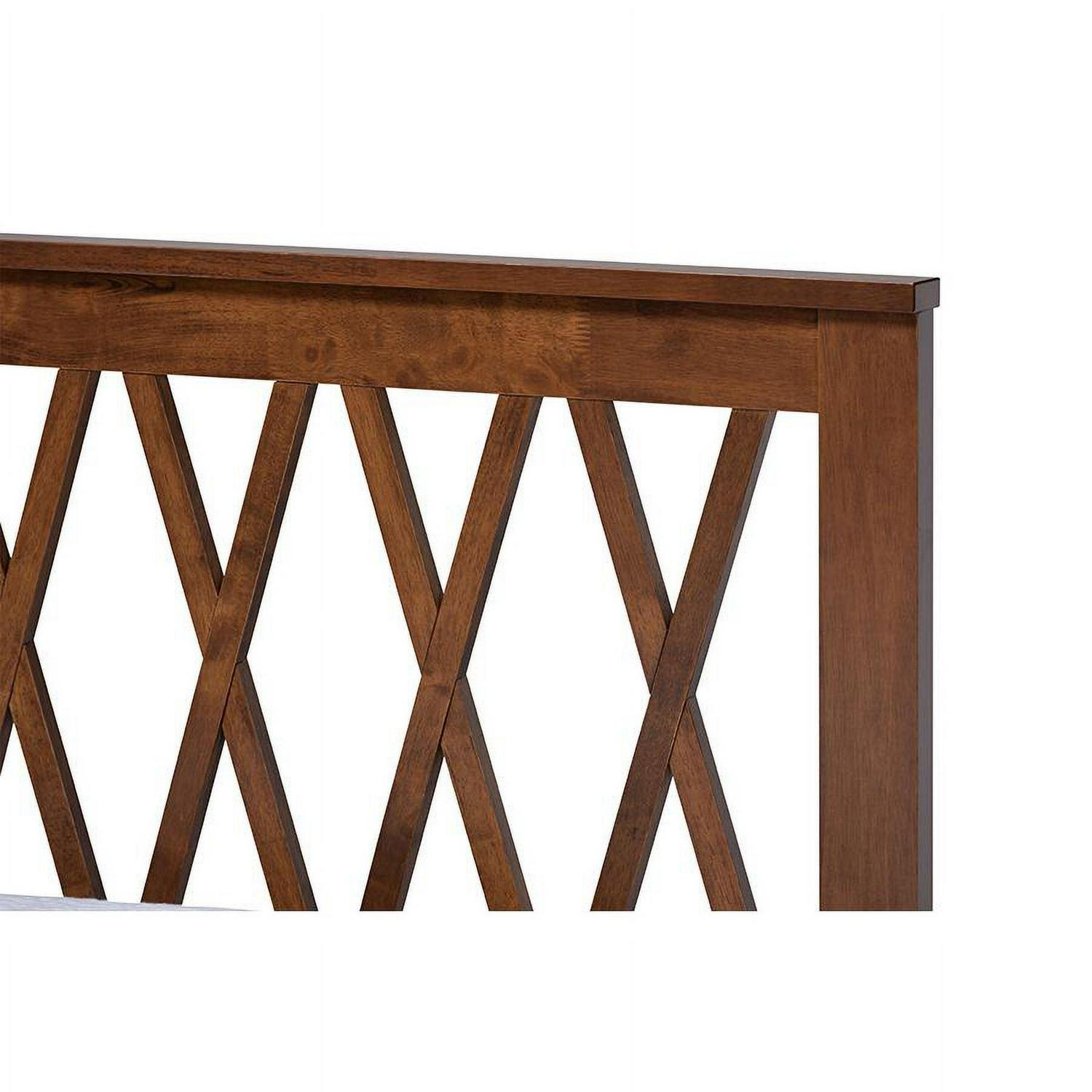 Inspired by original designs from the 1960s, the Malene bed adds retro charm to any bedroom. This solid rubberwood bed displays a warm walnut brown finish that highlights the beautiful wood grain patterns. The headboard features a unique criss-cross design, adding visual interest to your space. Its low platform provides a cozy, contemporary feel. The Malene bed is made in Malaysia and requires assembly.