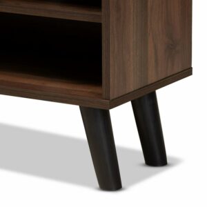 Baxton Studio Mallory Modern and Contemporary Two-Tone Oak Brown and Grey Finished Wood TV Stand Displaying contemporary design motifs, the Mallory TV stand modernizes any space. Made in Malaysia, the Mallory is comprised of sturdy wood showcasing a two-tone finish of oak brown and grey for a cool, modern look. Two external shelves and one additional shelf behind the door to provide easy storage for all your living room essentials. Requiring assembly, the Mallory is also equipped with a cord management hole to easily connect your media devices. Angled legs lend a chic mid-century touch. A fantastic blend of modern design and convenient utility, the Mallory TV stand enhances any space.