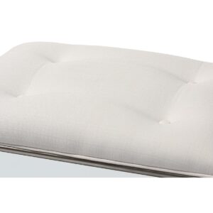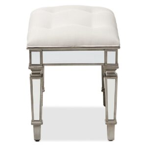 Baxton Studio Marielle Hollywood Regency Glamour Style Off White Fabric Upholstered Mirrored Ottoman Vanity Bench Inspired by the Golden Age of Hollywood, the Marielle ottoman is a glamourous addition to any space. Its vintage look is attributed to its stunning antique silver-finished frame inset with mirrored panels. Padded with foam for the utmost comfort, the Marielle features durable off-white linen fabric upholstery. The elegance of this ottoman lies within its classic details button tufting and spade feet. Use this piece as a vanity seat while primping and preening like a silver screen siren or use it as an accent piece in the living room to add a hint of luxury. The Marielle ottoman is made in China and requires assembly.