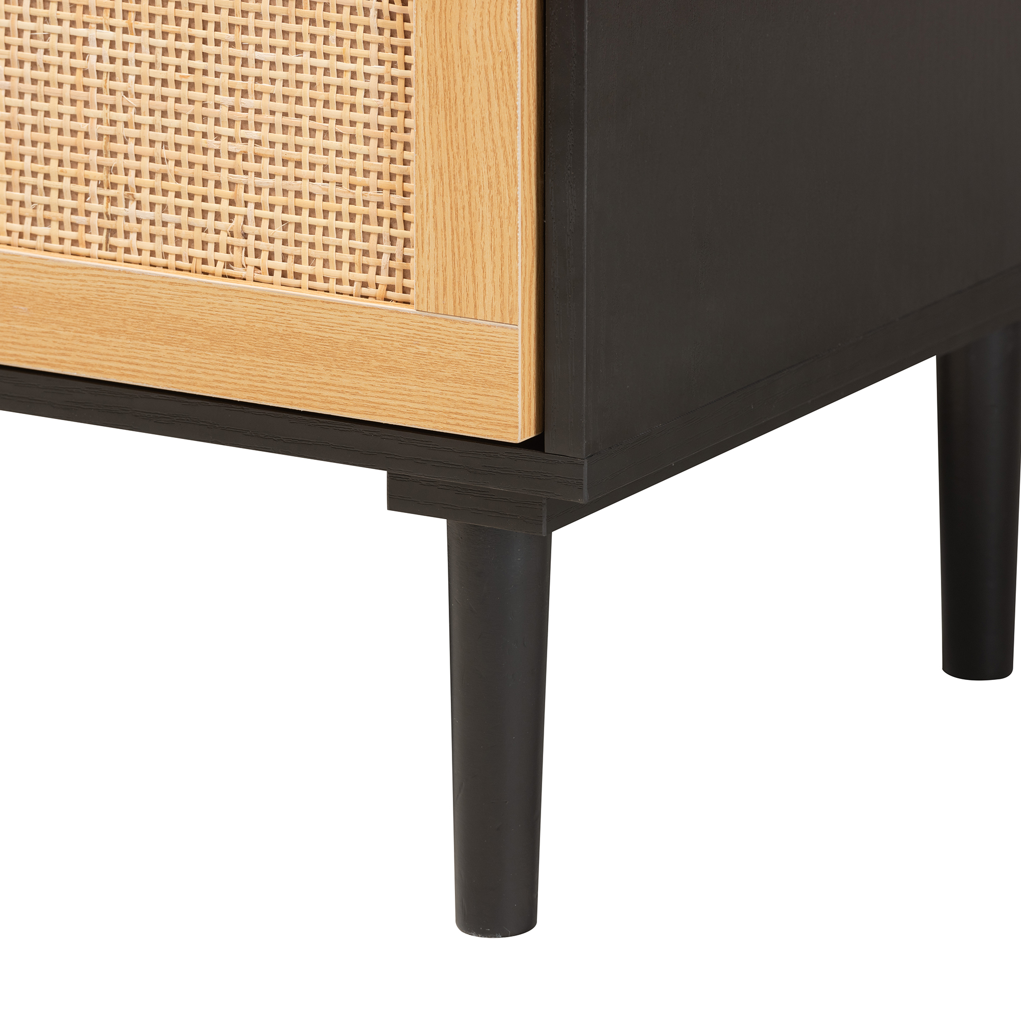 Mid-century storage cabinet Constructed from Engineered Wood, Pine Wood, and natural rattan