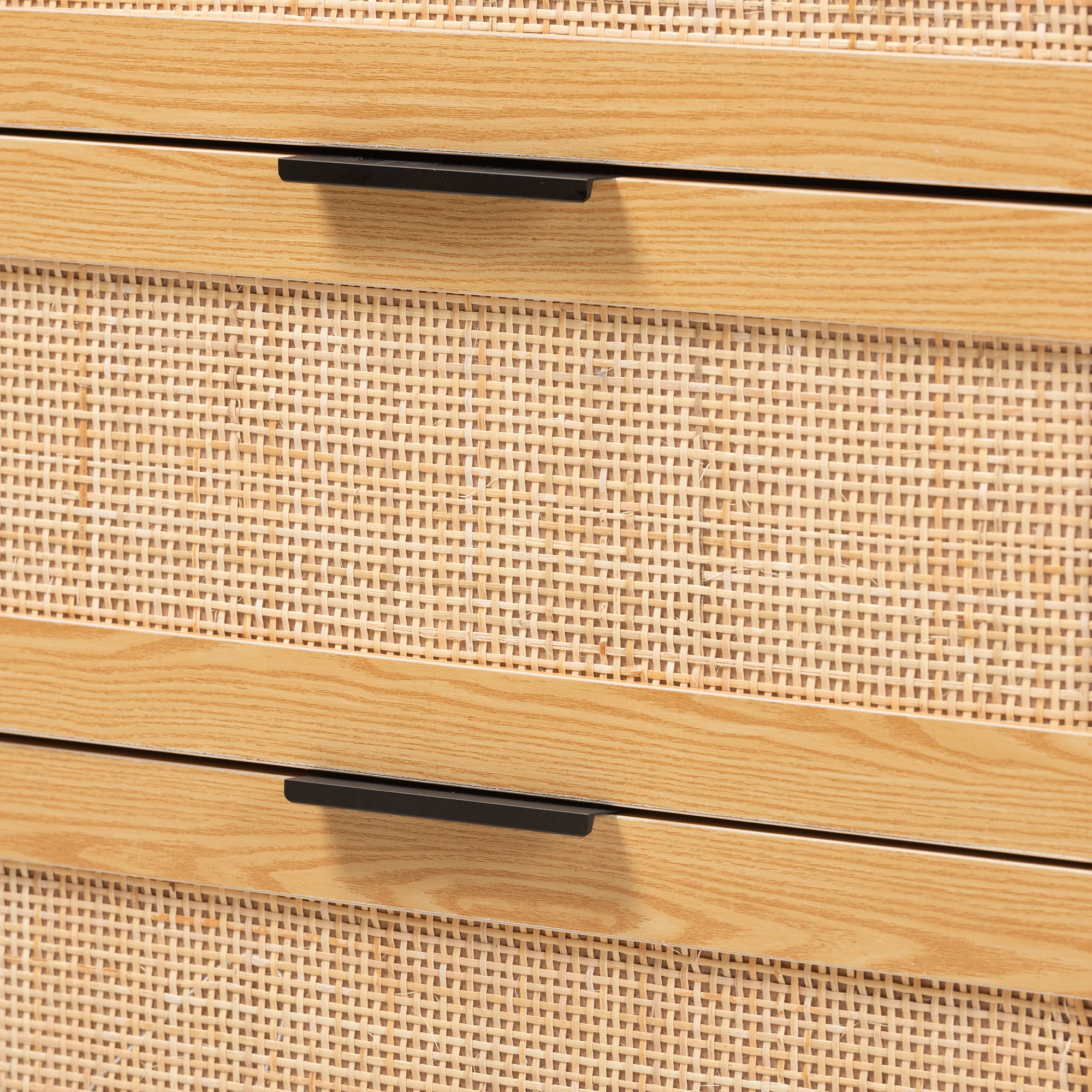 Embrace the rustic warmth of traditional craftsmanship with the lovely Maureen storage cabinet. Made in China, this bold addition is comprised of a solid wood frame adorned with woven rattan embellishments. Five drawers offer plentiful storage space to organize a variety of household essentials. The Maureen requires assembly and utilizes tapered legs for excellent stability and support in streamlined design. Minimalist drawer handles lend a contemporary touch, making the Maureen storage cabinet an outstanding addition to any space. Due to the nature of the natural materials used in this product, it may have variations in areas such as, but not limited to, color, pattern, grain and texture. The hair-like strands of rattan/rattan-fiber are common due to nature of the material.