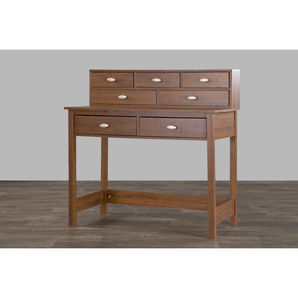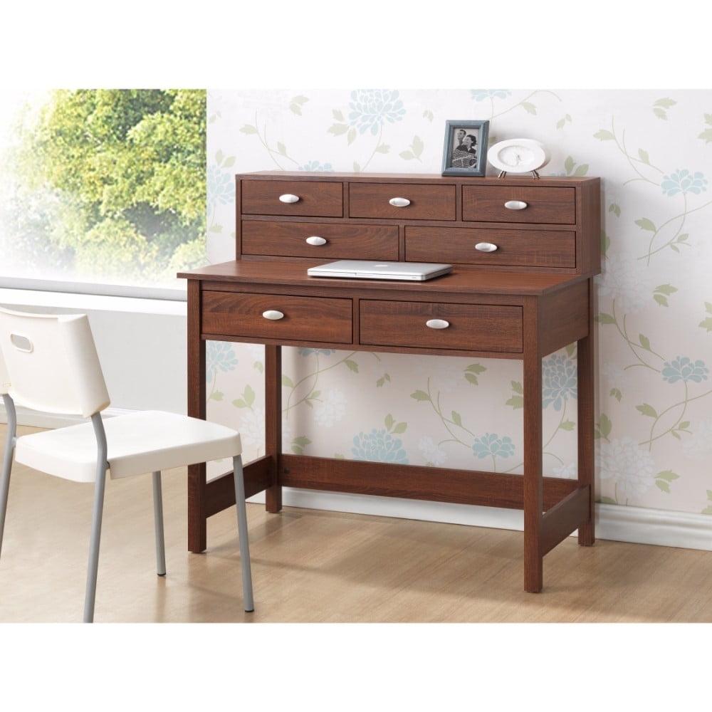 Baxton Studio McKinley Writing Desk Seeking a wide desk surface and multiple storage areas all at a discount price Our McKinley Writing Desk achieves that and more without forsaking sophisticated styling. Drawers, drawers and more drawers add up to hard-to-beat use of limited space. Stylish metal pulls on all seven drawers provide sharp accenting. Engineered-wood construction provides stability and a Sonoma-oak veneer dresses things up.