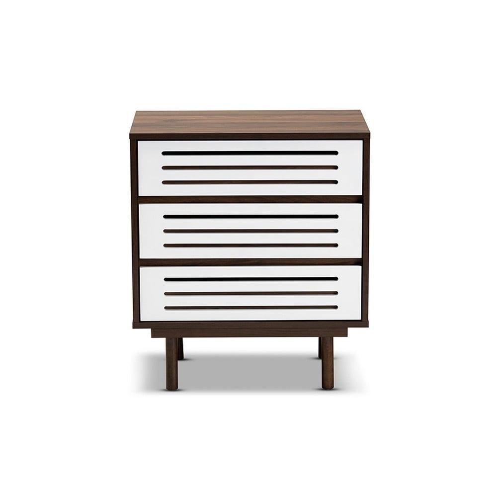 Baxton Studio Meike Mid-Century Modern Two-Tone 3-Drawer Nightstand With its modern form and sleek finish, the Meike nightstand is a chic bedroom storage solution. Made in Malaysia, this wooden nightstand showcases a two-tone white and walnut brown finish for a cool, contemporary feel. Three drawers provide ample bedside storage. Each drawer is fitted with metal glides for smooth movement. Long cut-outs on the drawer faces and a low profile give the Meike an ultra-modern look. Requiring assembly, the Meike nightstand elevates any bedroom.